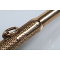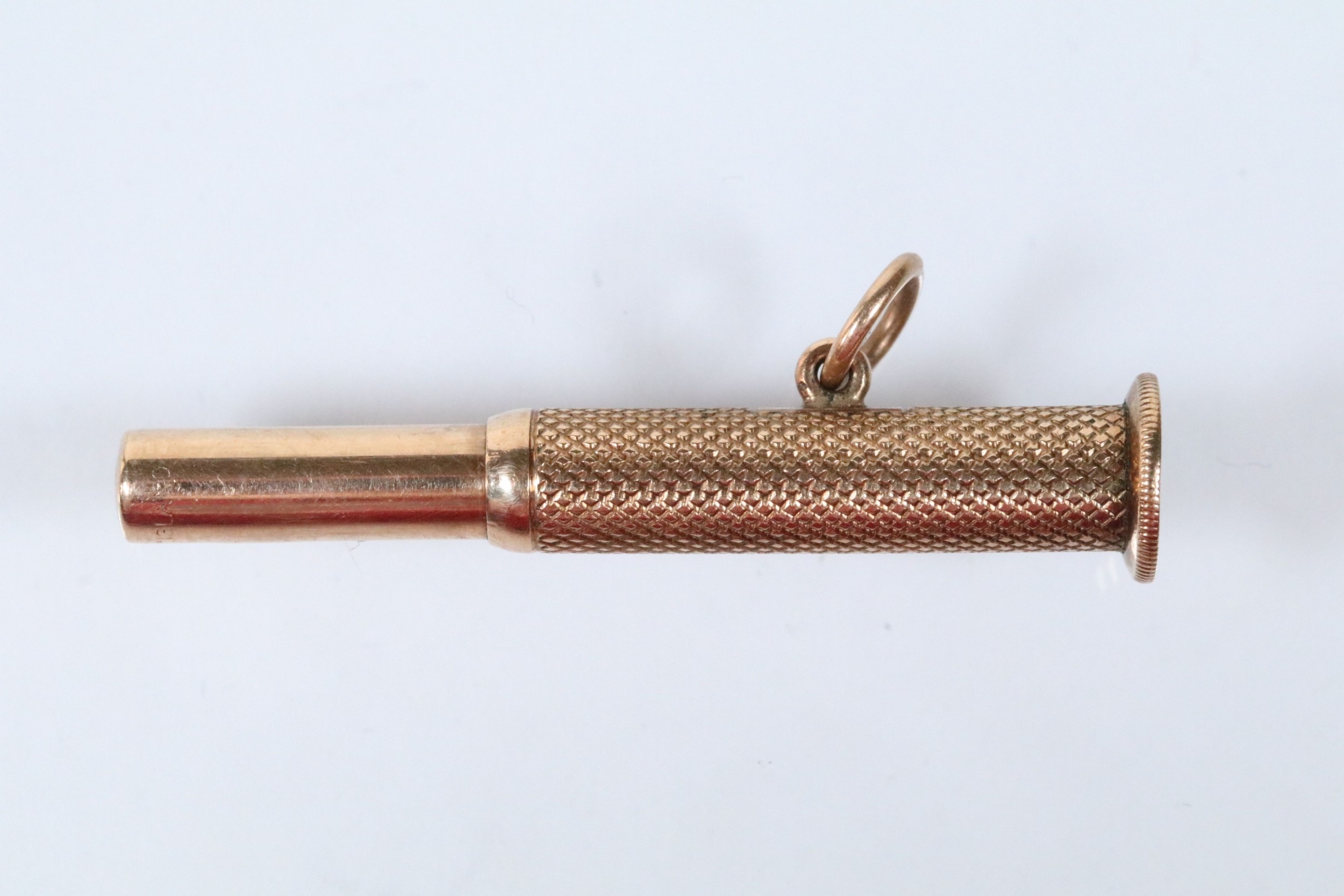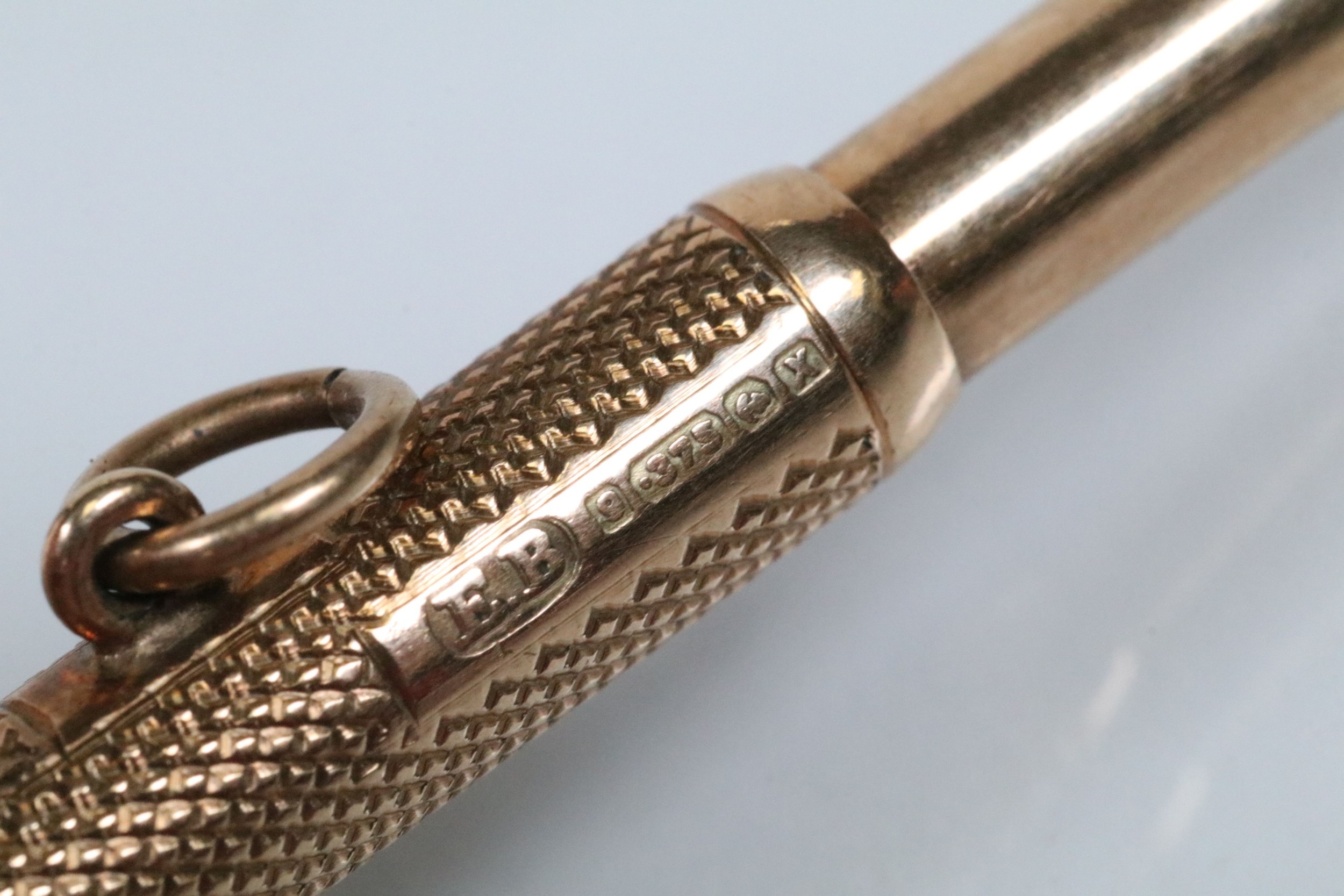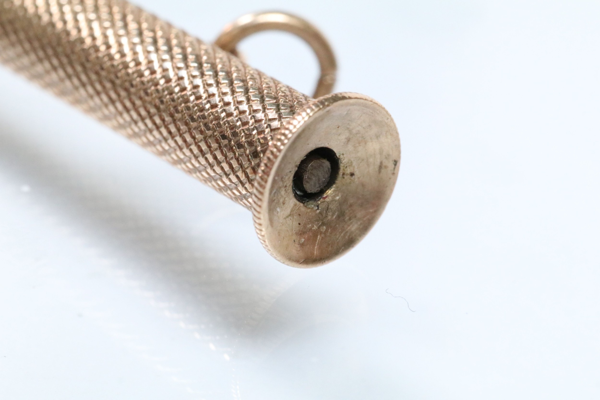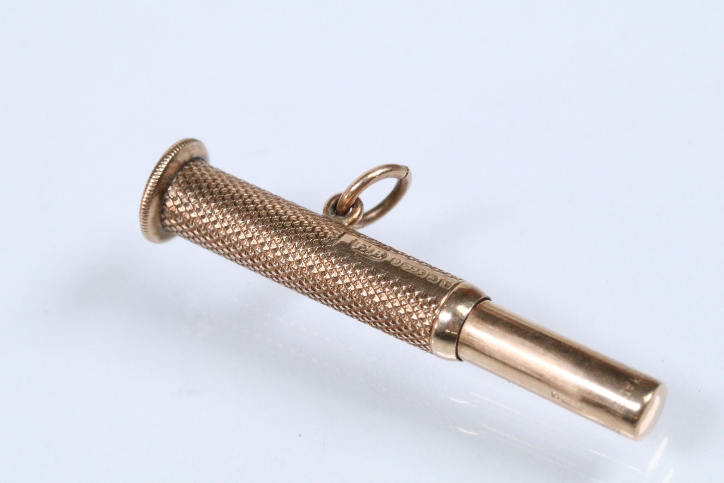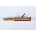 9ct gold cigar pricker having engine turned details and pendant bale. Hallmarked Birmingham 1947. Measures 4.5cm.