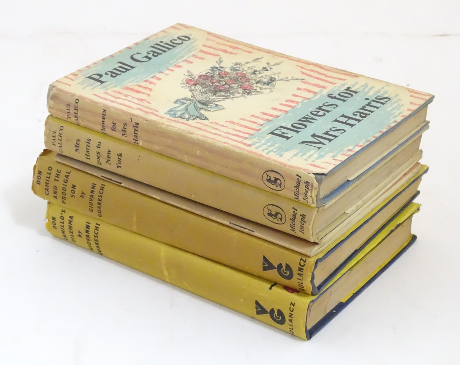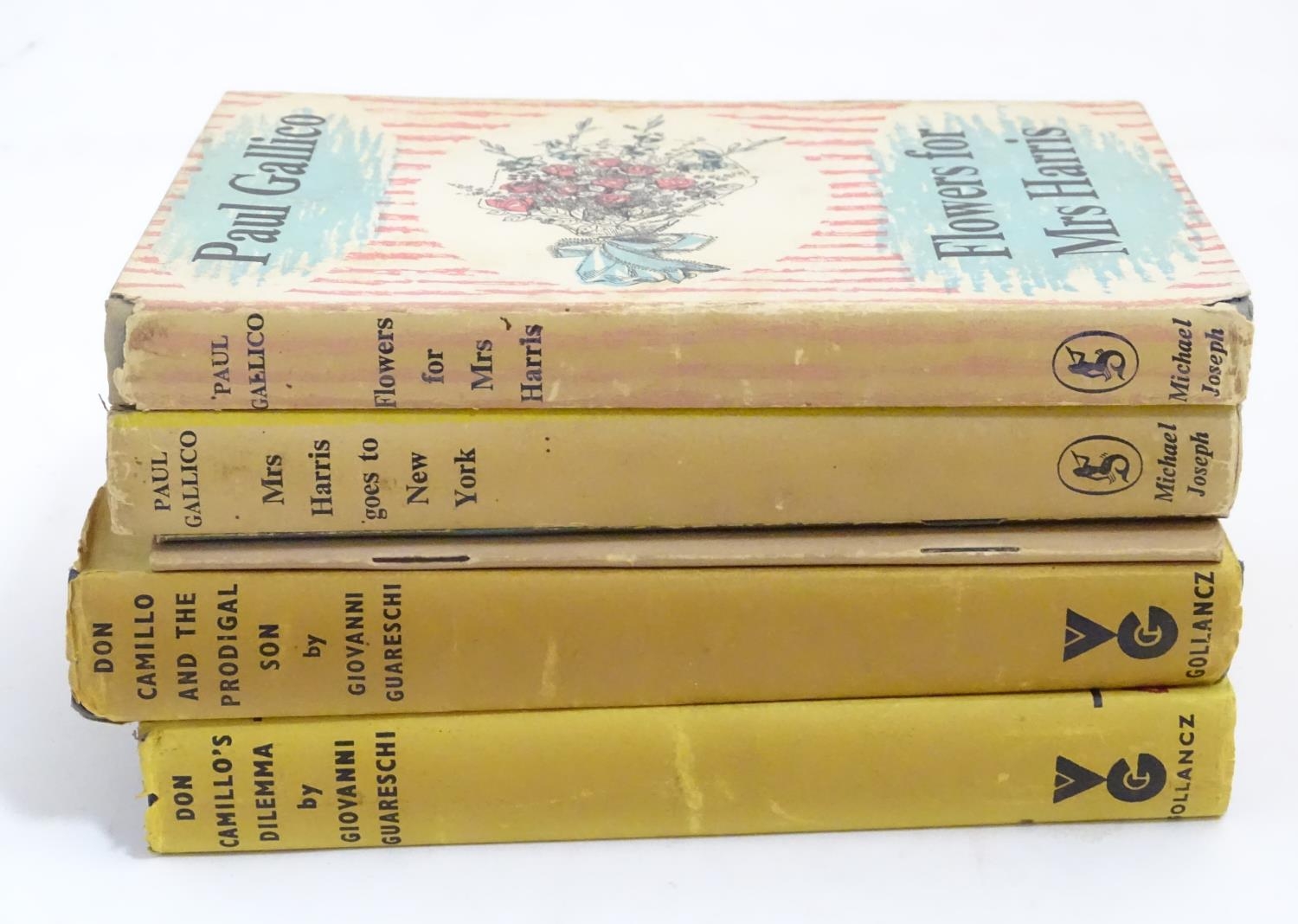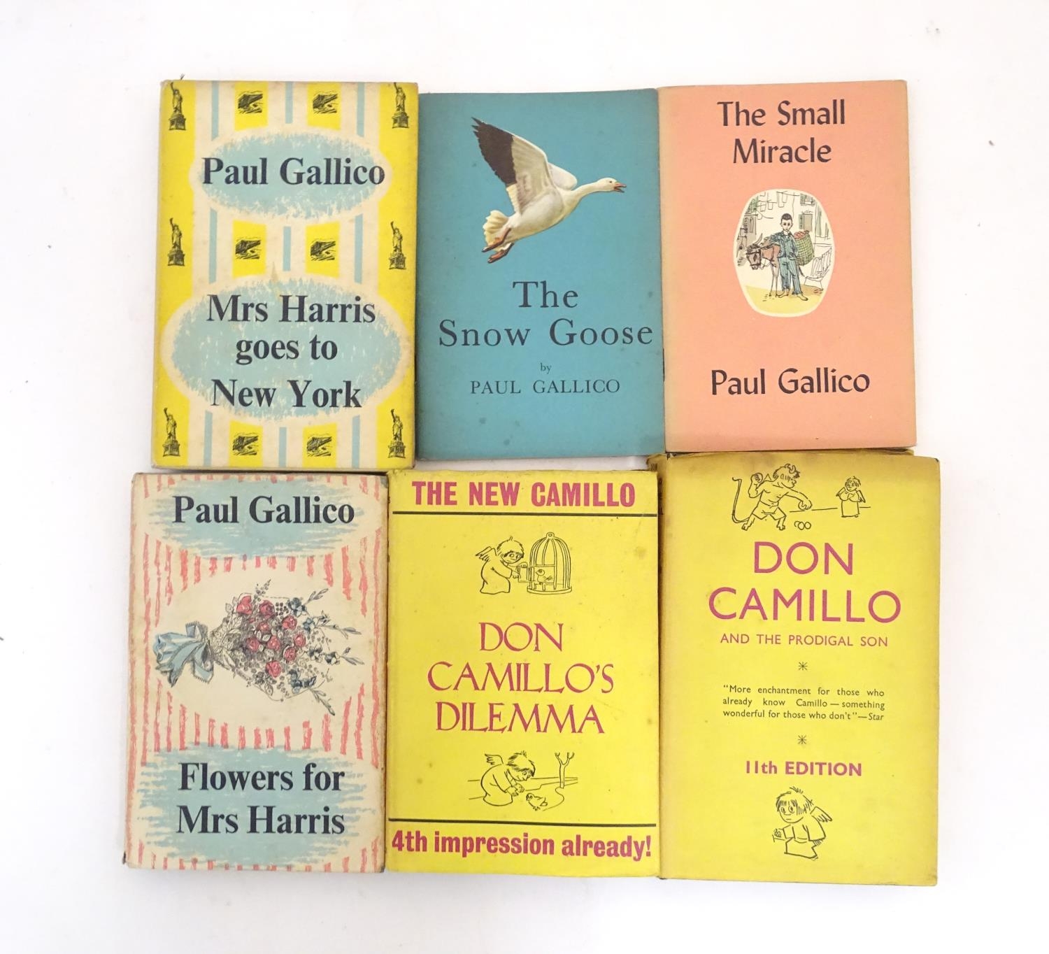 Books: Assorted books to include Flowers for Mrs Harris by Paul Gallico, 1958; Mrs Harris goes to New York by Paul Gallico, 1960; The Snow Goose by Paul Gallico, 1954; The Small Miracle by Paul Gallico, 1955; Don Camillo and the Prodigal Son by Giovanni Guareschi, 1954, and Don Camillo Dilemma by Giovanni Guareschi, 1954. (6)