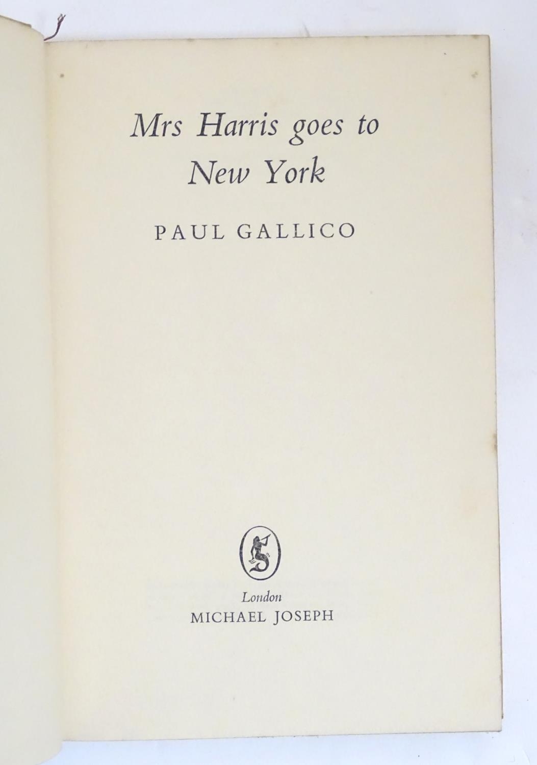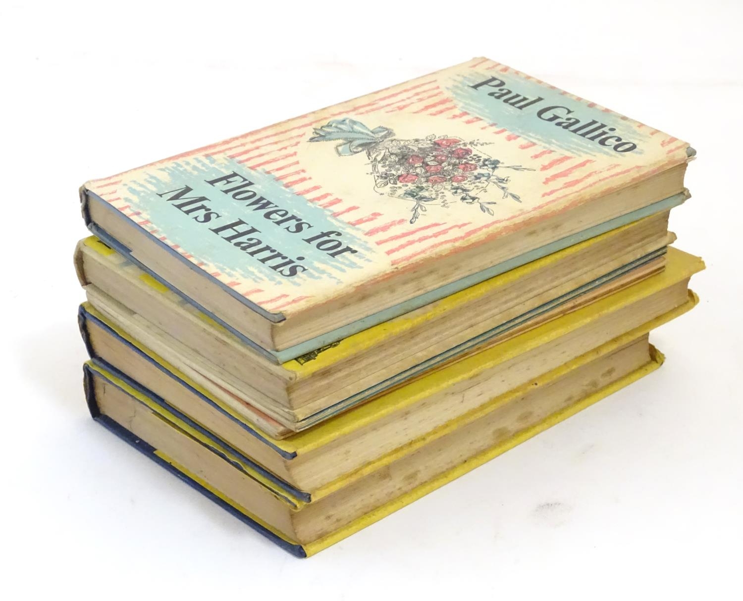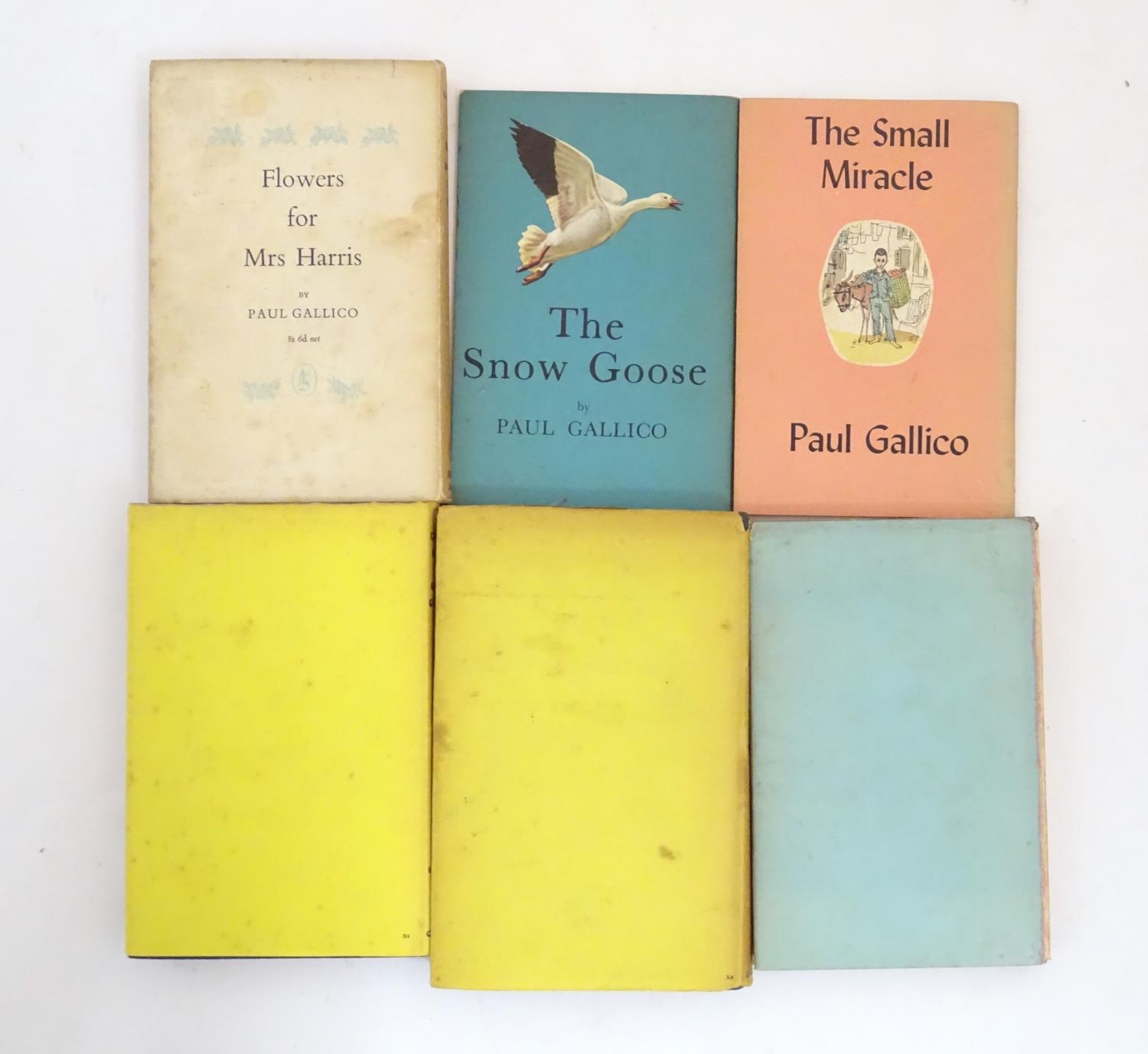 Books: Assorted books to include Flowers for Mrs Harris by Paul Gallico, 1958; Mrs Harris goes to New York by Paul Gallico, 1960; The Snow Goose by Paul Gallico, 1954; The Small Miracle by Paul Gallico, 1955; Don Camillo and the Prodigal Son by Giovanni Guareschi, 1954, and Don Camillo Dilemma by Giovanni Guareschi, 1954. (6)