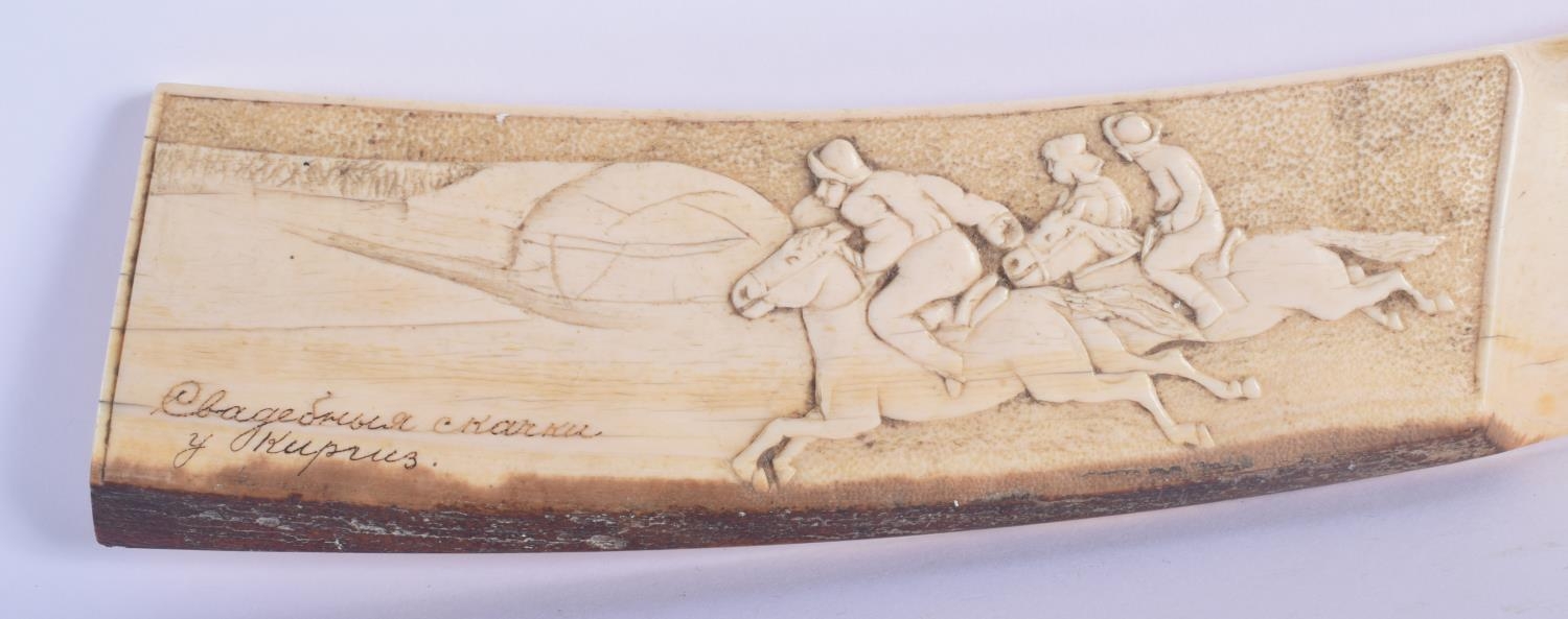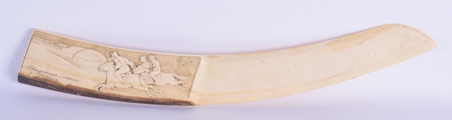 AN UNUSUAL 19TH CENTURY CONTINENTAL CARVED IVORY PAGE TURNER possibly Russian, decorated with a horse riding scene. 39 cm long.