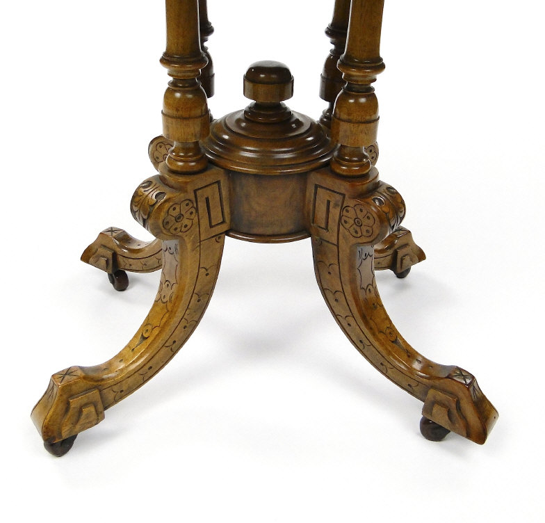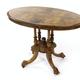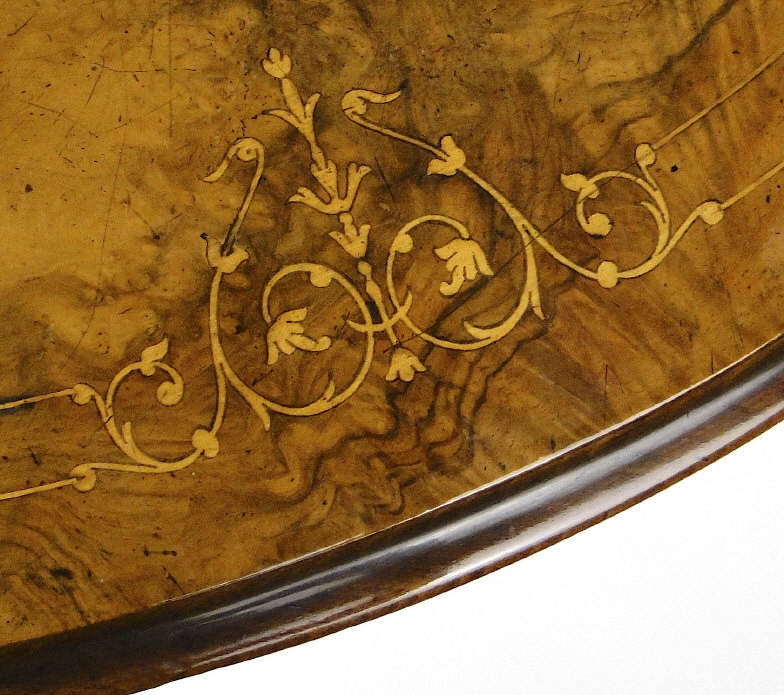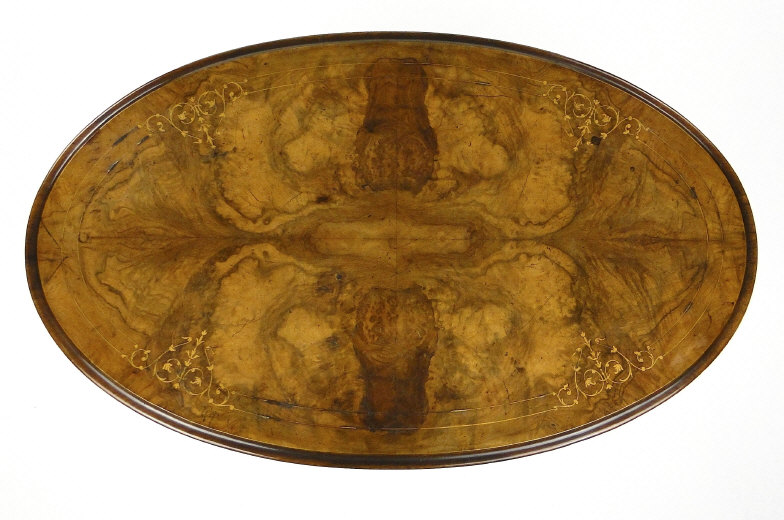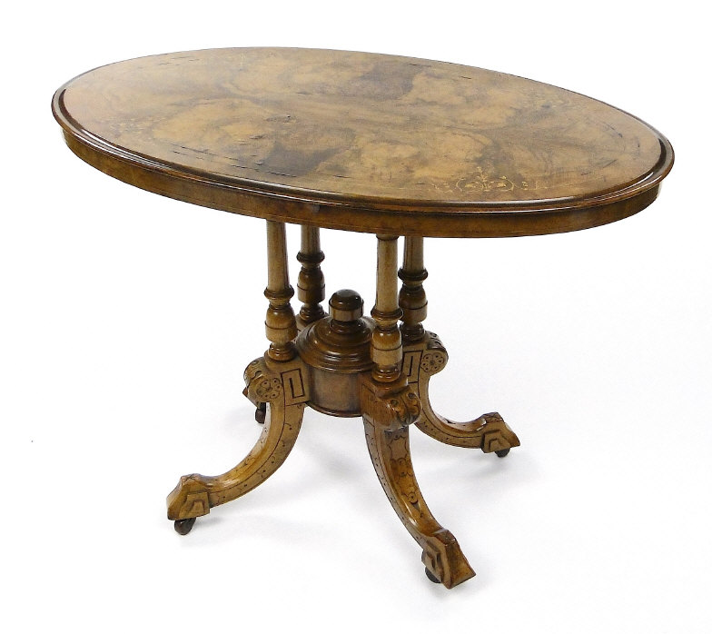 Victorian oval burr walnut occasional table, the strung inlaid top raised on four turned column supports and splayed legs raised on casters, 70cm high x 90cm long x 56cm wide