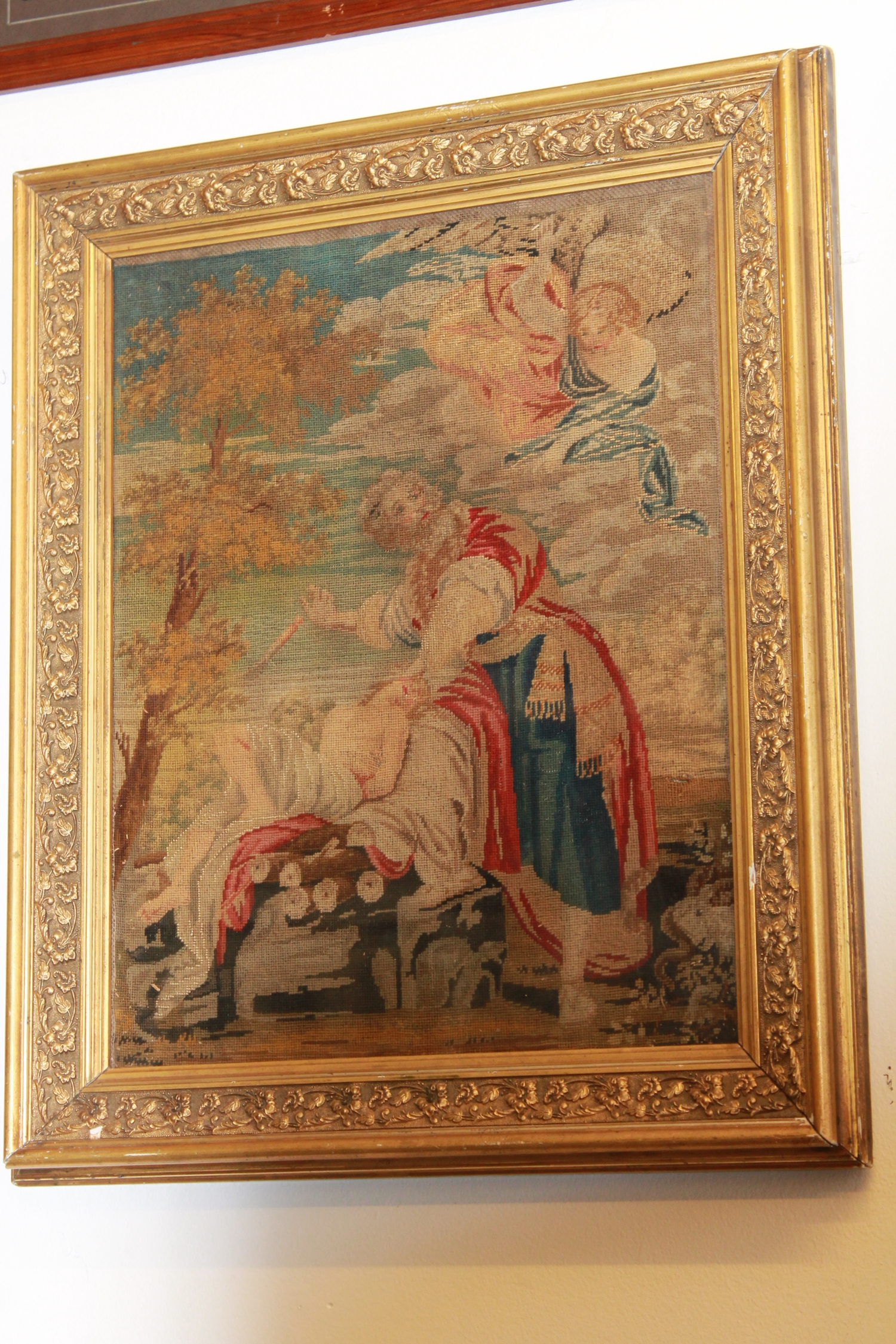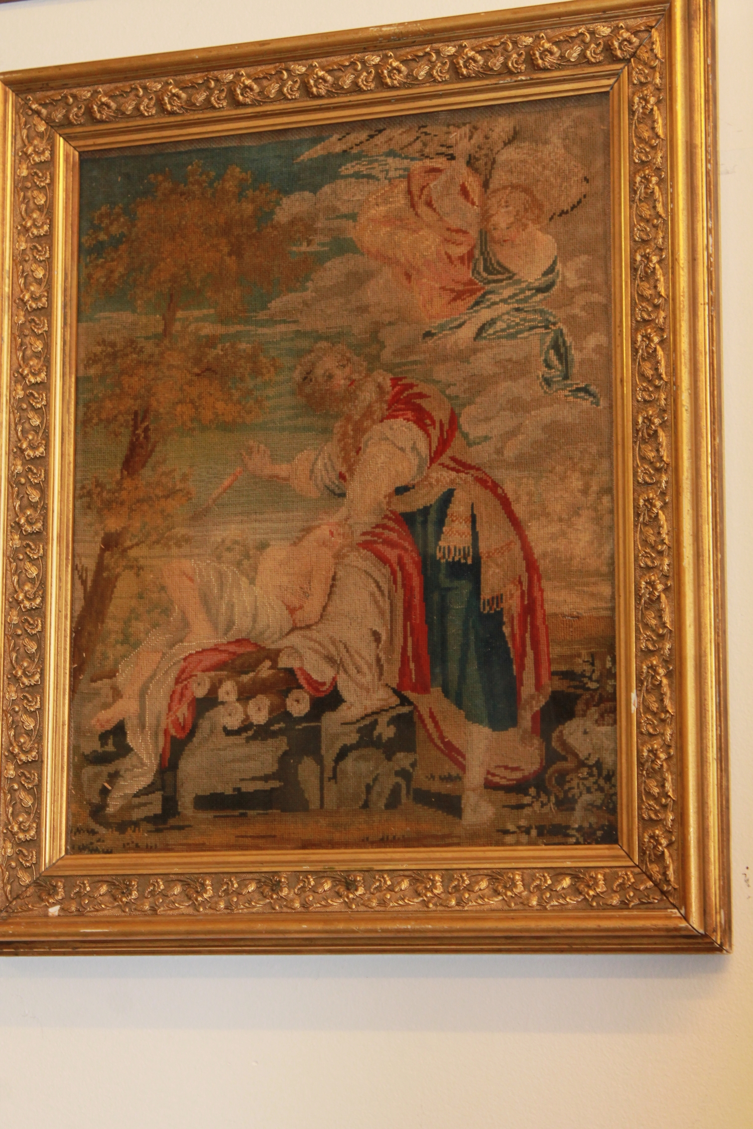 Antique Framed Hand Stitched Biblical Needle Point of The Sacrifice of Isaak by Abraham dating back to 18th century