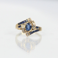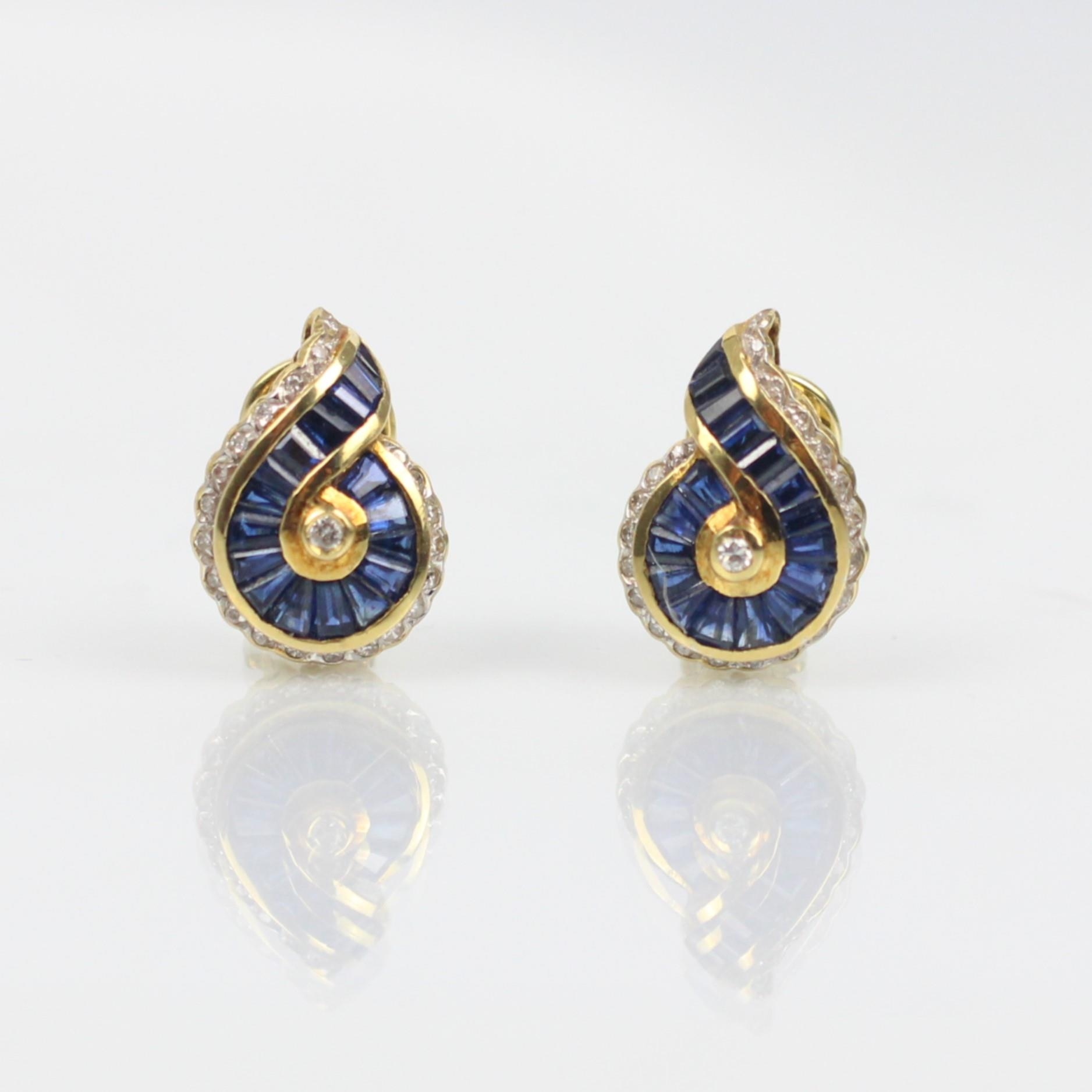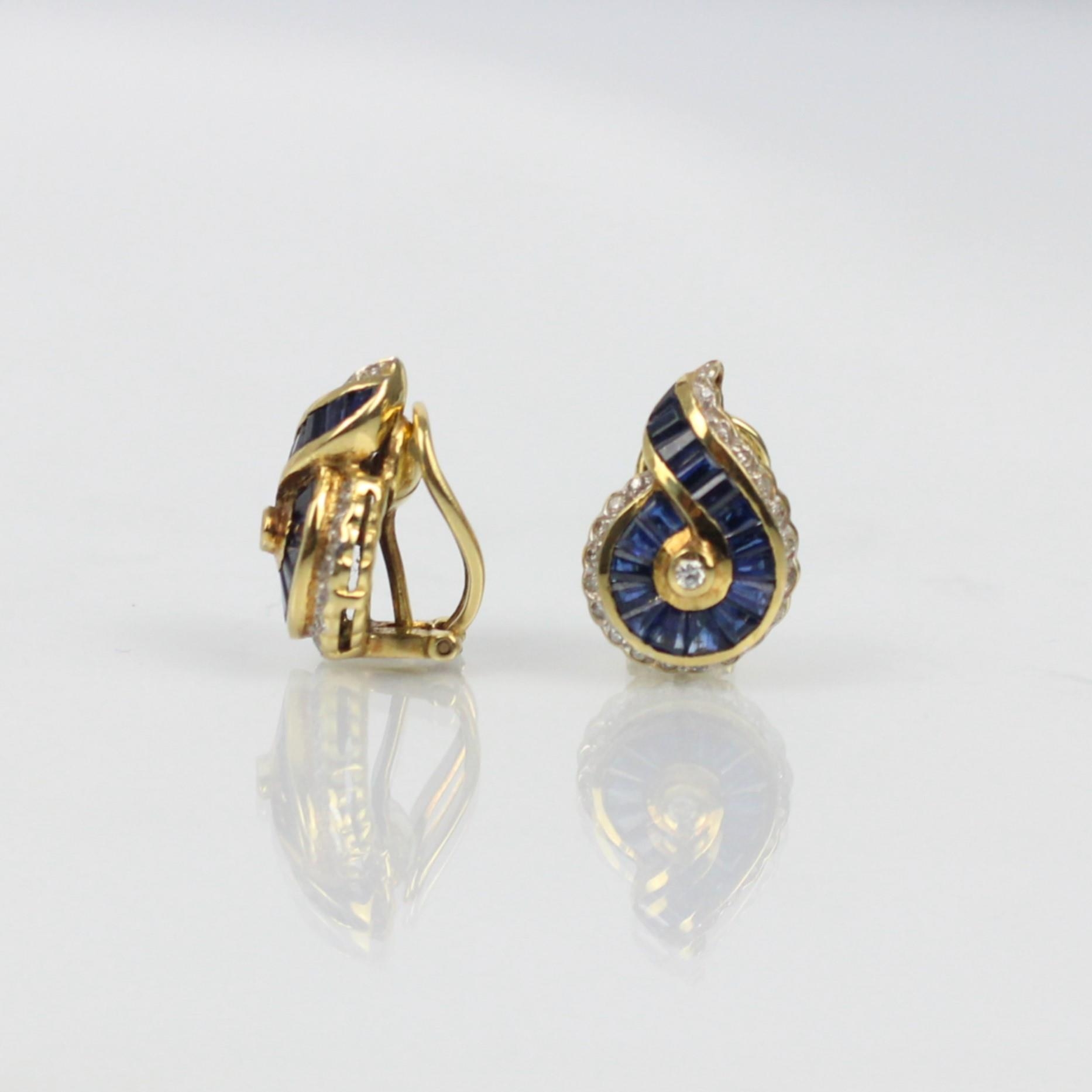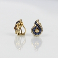 A pair of sapphire and diamond earrings, the central round cut diamond with calibre cut sapphire stylised cluster and further surround of diamonds, post and clip fittings to reverse, stamped '750' gross weight 6gms (2) (at fault)