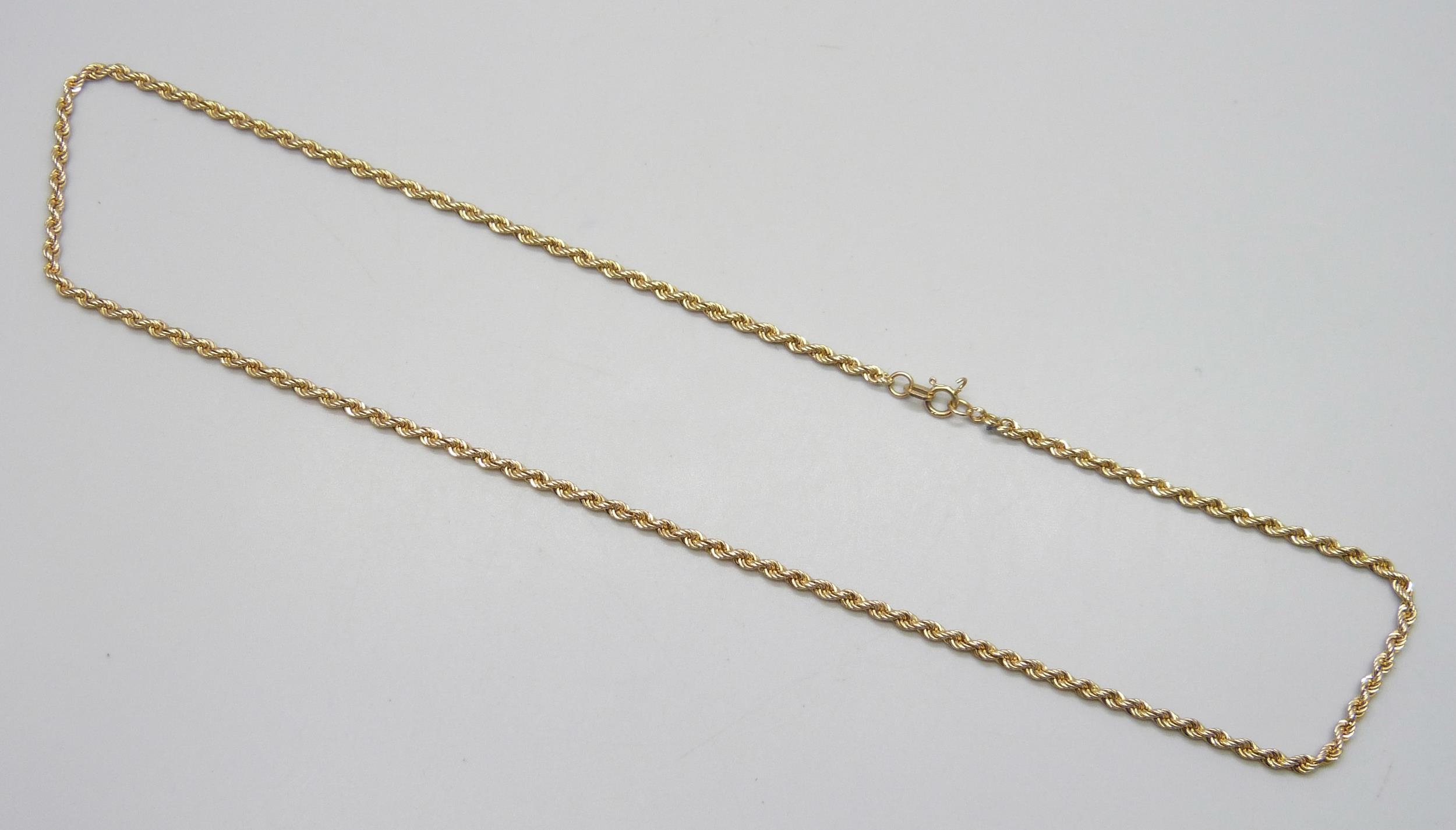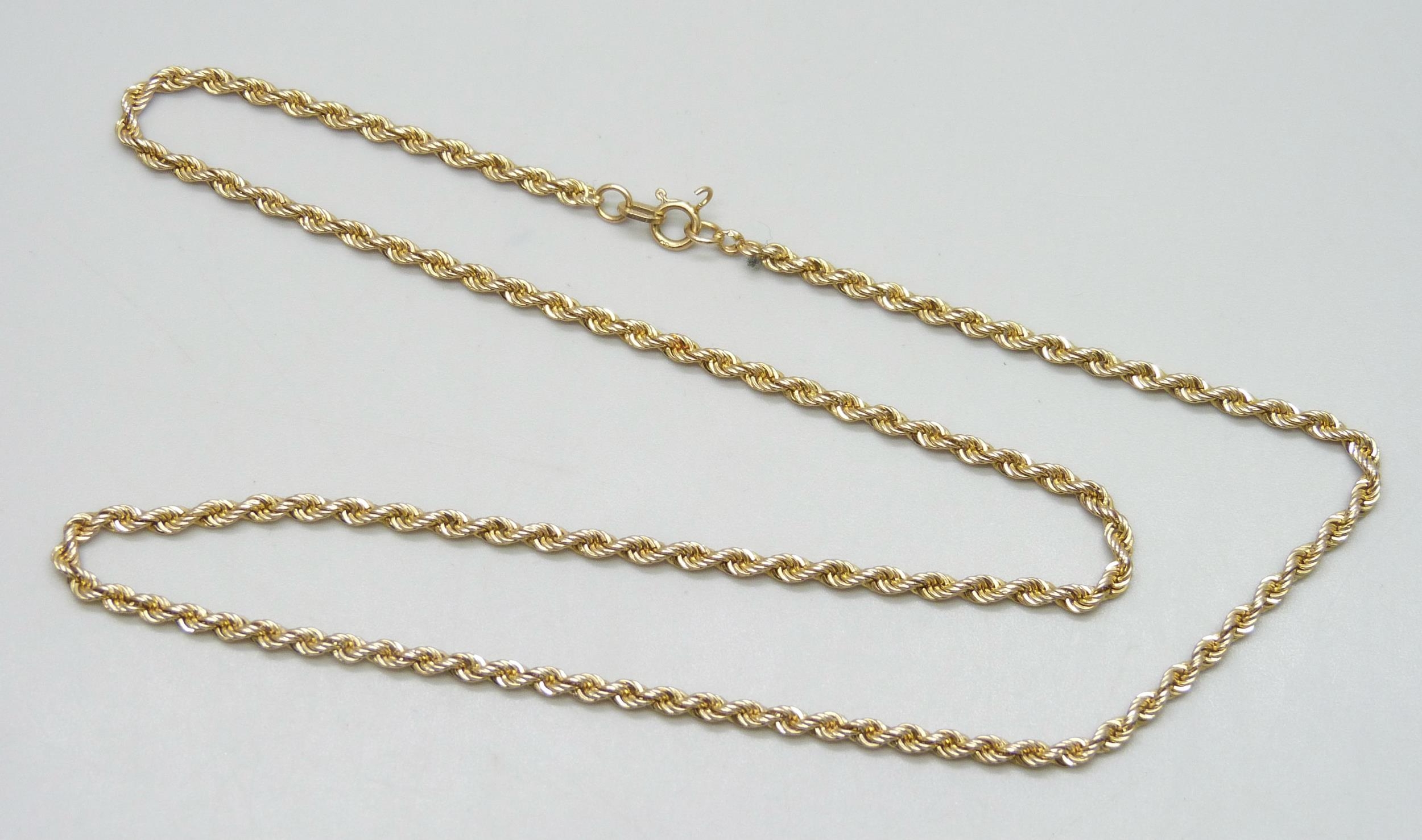 A 9ct gold rope chain necklace, a/f, 2.9g, 46cm