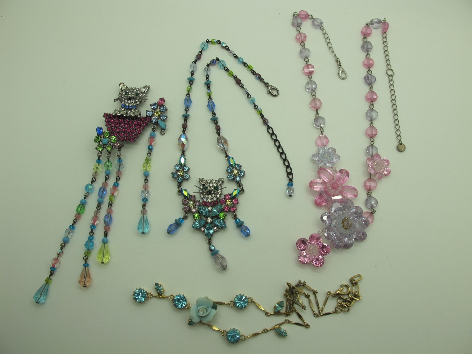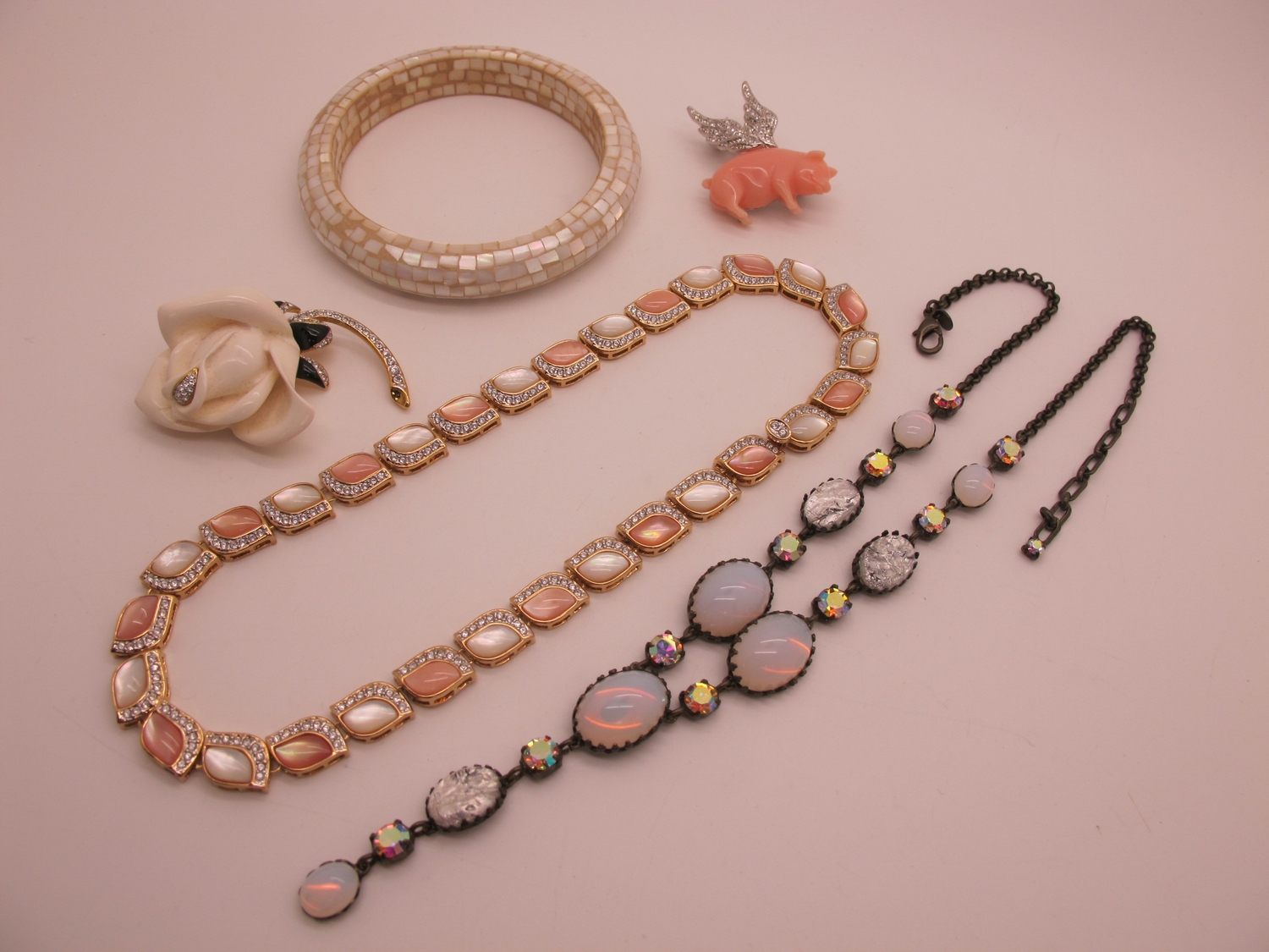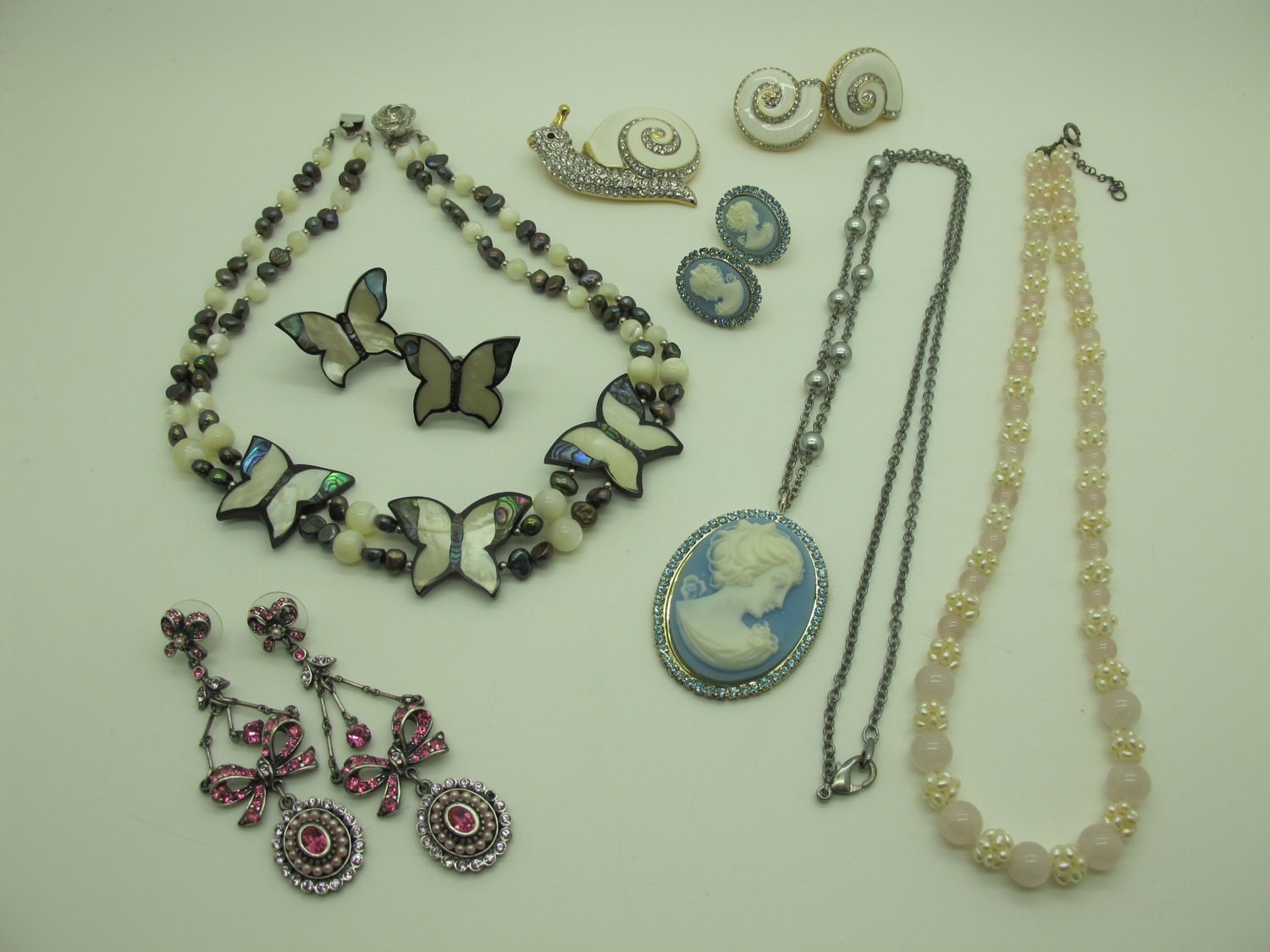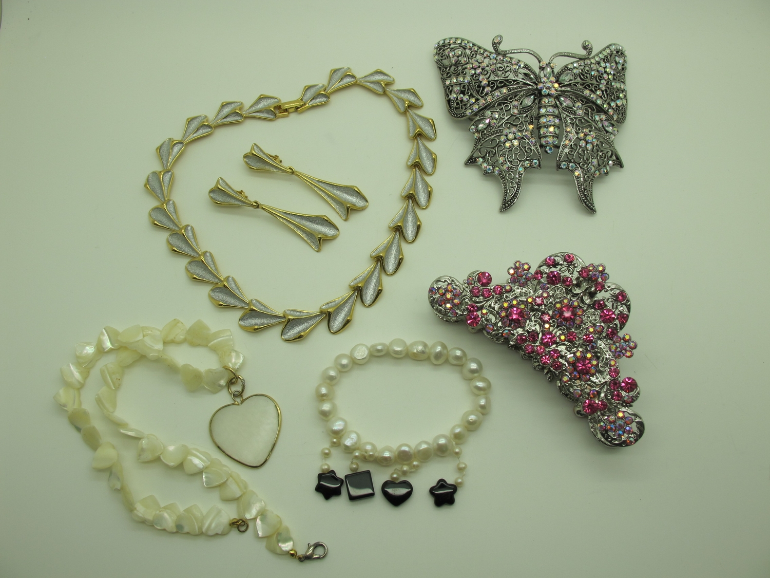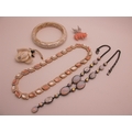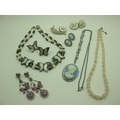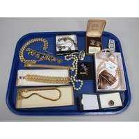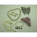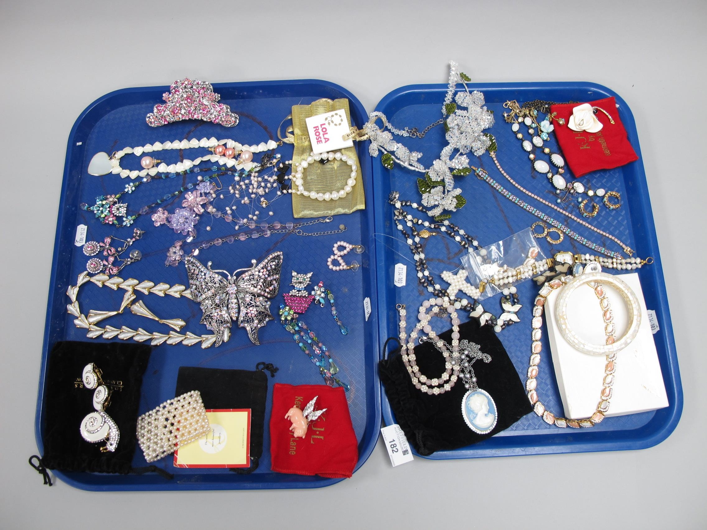 A Collection of Modern Costume Jewellery, to include Butler & Wilson diamoanté butterfly hair clip, brooches, Kenneth Jay Lane floral brooch, Lee Sands freshwater pearl wristwatch, Joan Rivers tennis style bracelet and hoop earring sets etc :- Two Trays