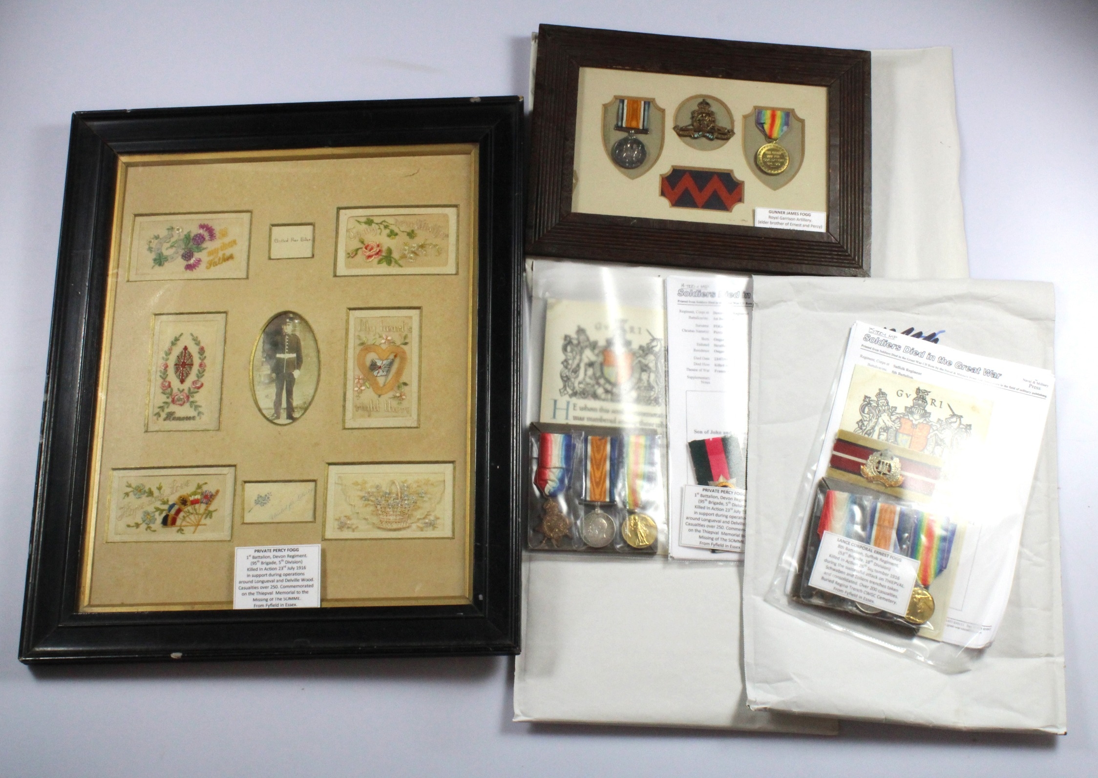 Family WW1 medals - 1) 1915 Star Trio + Death Plaque and Scroll for (8461 Pte Ernest Fogg 8th Bn Suffolks) Killed in Action 26/9/1916 born Fyfield, Essex. Buried Regina Trench Cemetery. 2) 1914 Star Trio + Death plaque and Scroll for (9962 Pte Percy Fogg 1/Devon Regt) Killed in Action 23/7/1916 born Ongar, Essex. On the Thiepval Memorial. With large contemporary glazed frame of silk postcards and photo of Percy. 3) BWM & Victory Medal for (7046 Gnr James Fogg RA) framed. (3 groups)
