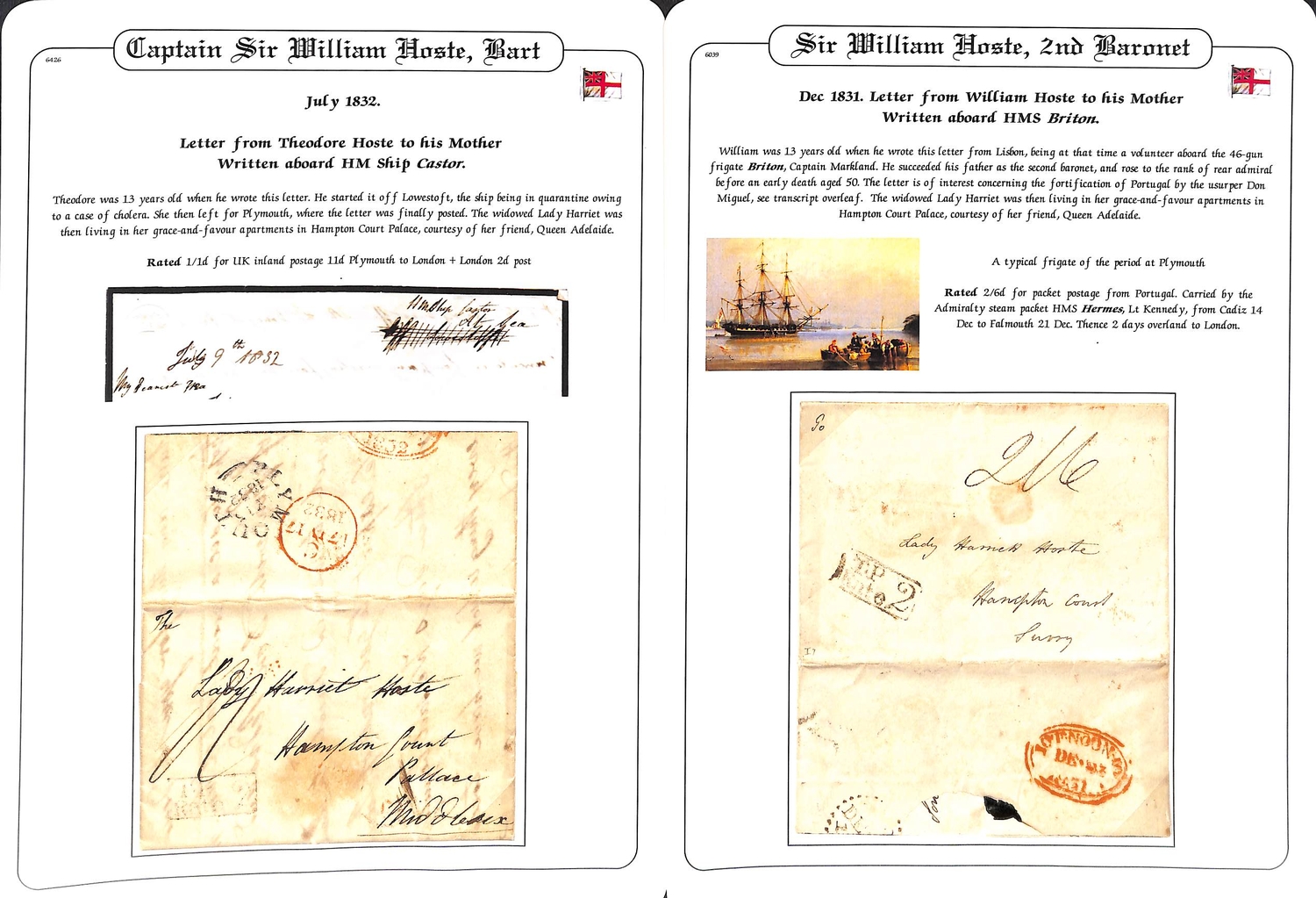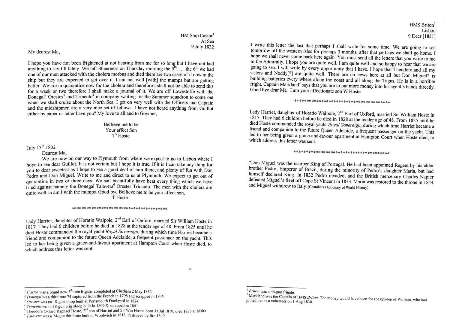 Hoste. 1831-32 Entire letters from Hoste s two sons (both then 13 years old) to their mother at Hampton Court Palace, 1831 letter written by William (2nd Baronet), a volunteer on H.M.S "Briton" at Lisbon reporting his departure for the Western Islands and the building of batteries by Don Miguel along the coast and Tagus; the 1832 letter from Theodore written on H.M.S "Castor", begun at Lowestoft where the ship was in quarantine due to cholera on board, completed at sea en route to Plymouth from where he expects to sail to Lisbon, posted at Plymouth. Also an 1833 letter from Caroline Hoste in Brighton, to her brother Theodore on H.M.S "Britannia" in the Mediterranean, probably hand delivered. William Hoste rose to the rank of Rear Admiral; Theodore Hoste died in 1835 aged 16. (3).