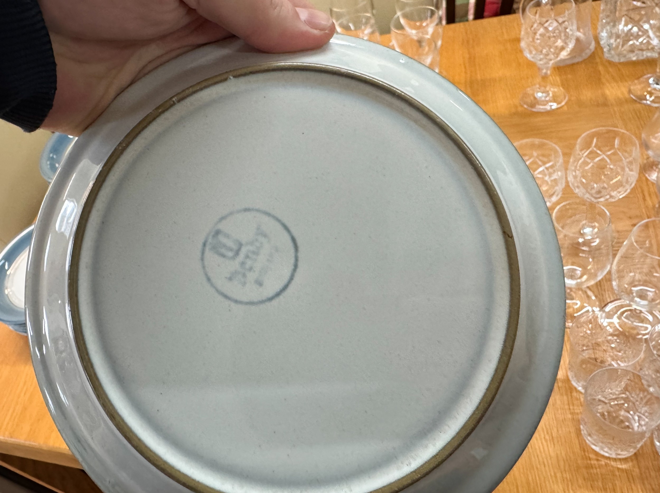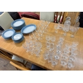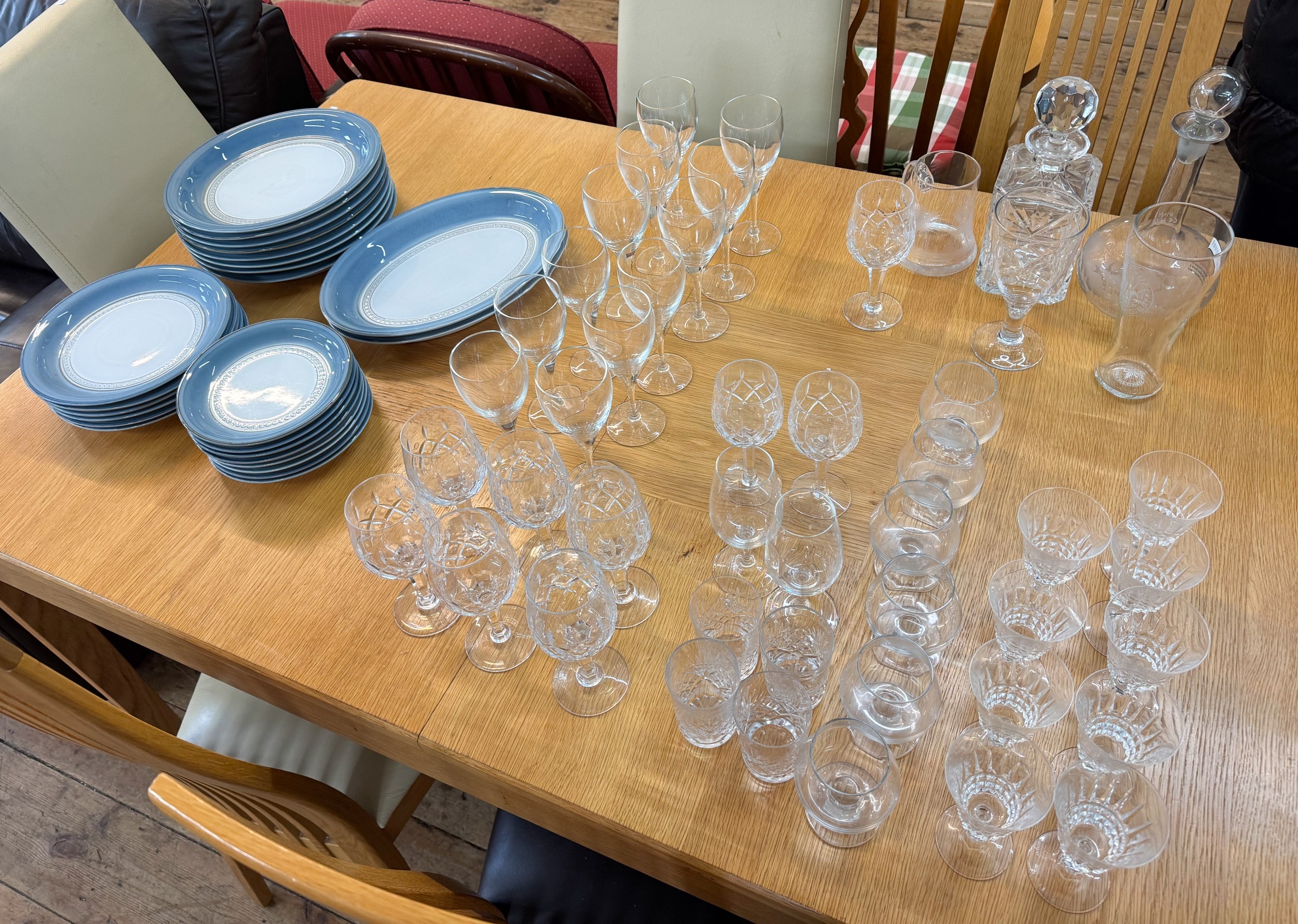 A large quantity of cut glass ware to include decanters together with a quantity of Denby blue glazed table plates of various sizes, all within three boxes