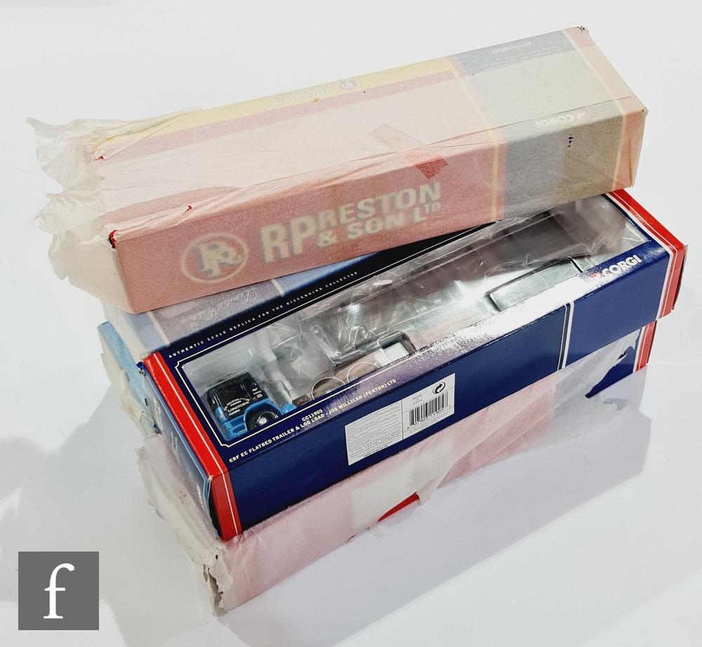 Five Corgi 1:50 scale diecast models, comprising CC12505 Atkinson Borderer Tautliner, CC12801 Scania T-Cab Feldbinder Tanker, CC11905 ERF EC Flatbed Trailer and Log Load, CC12004 Man Flatbed Trailer with Container Load and CC12701 ERF ECs Curtainside, all boxed. (5)