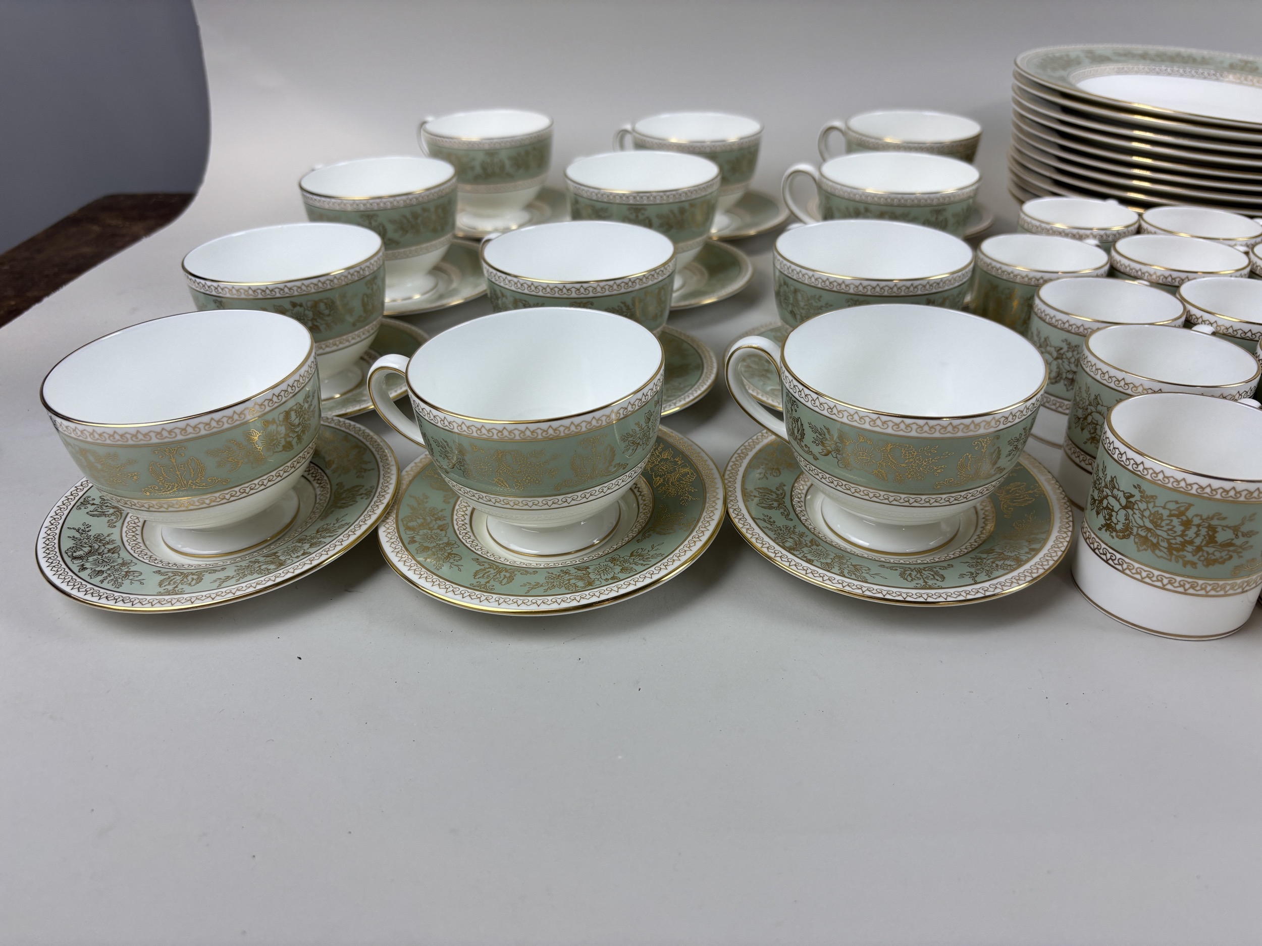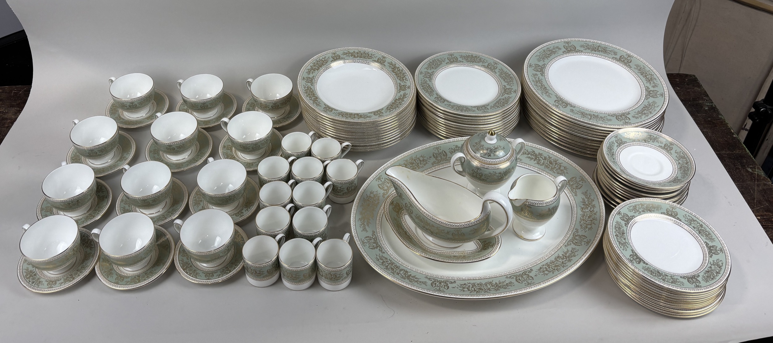A GOLD COLUMBIA WEDGWOOD DINNER AND PART TEA SERVICE IN SAGE GREEN