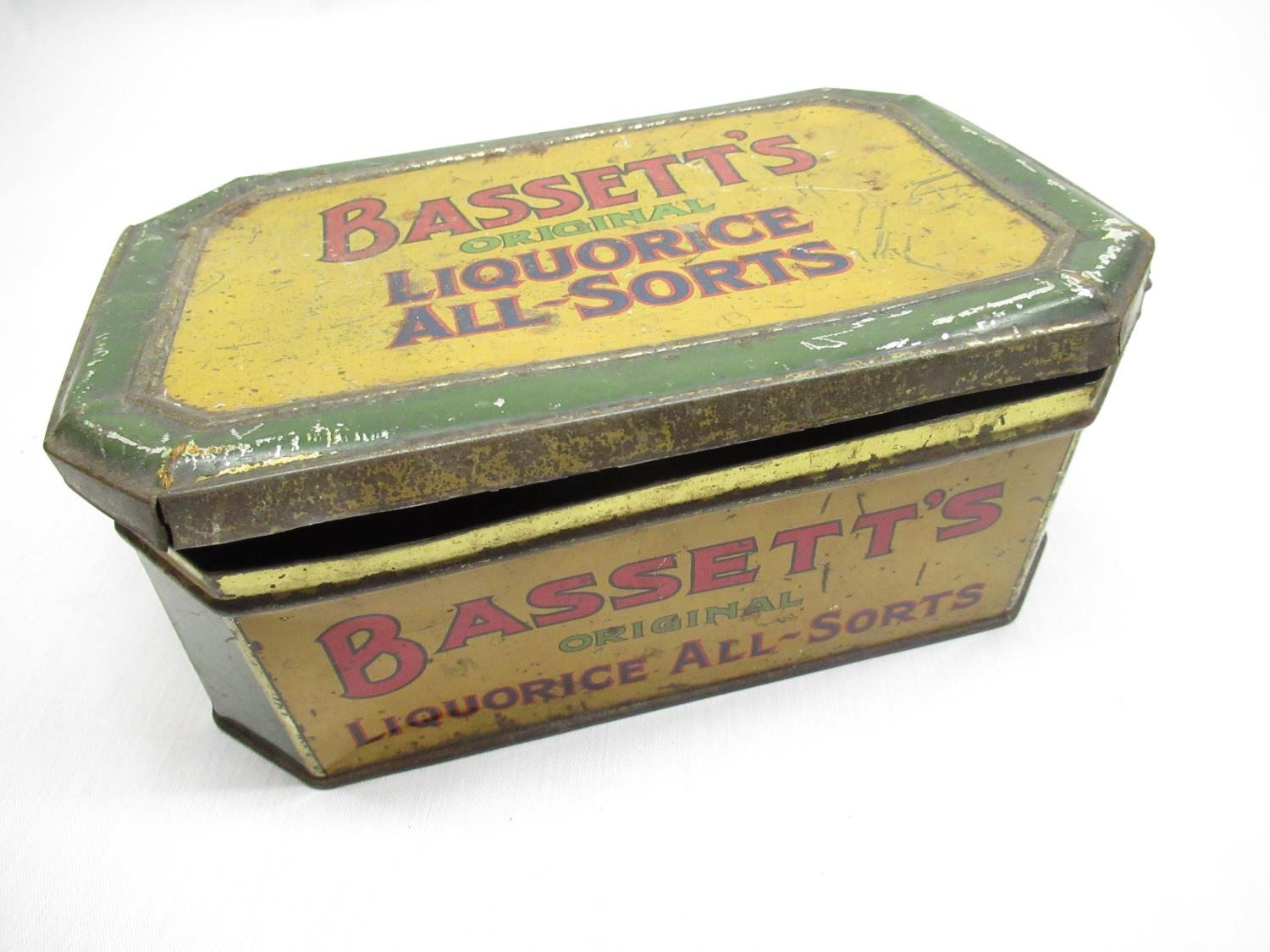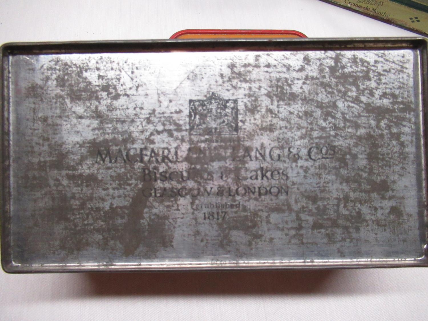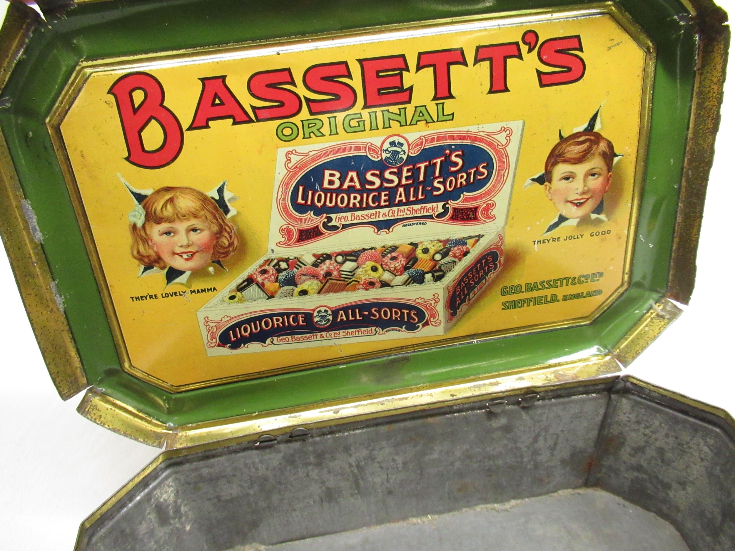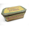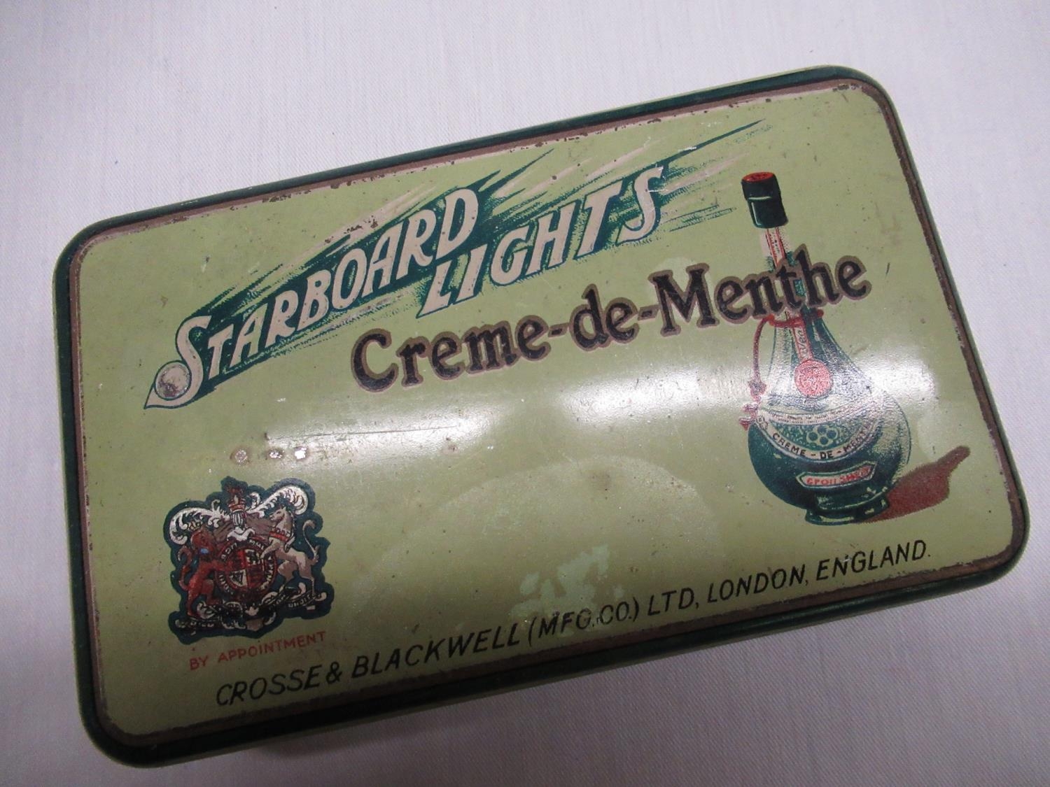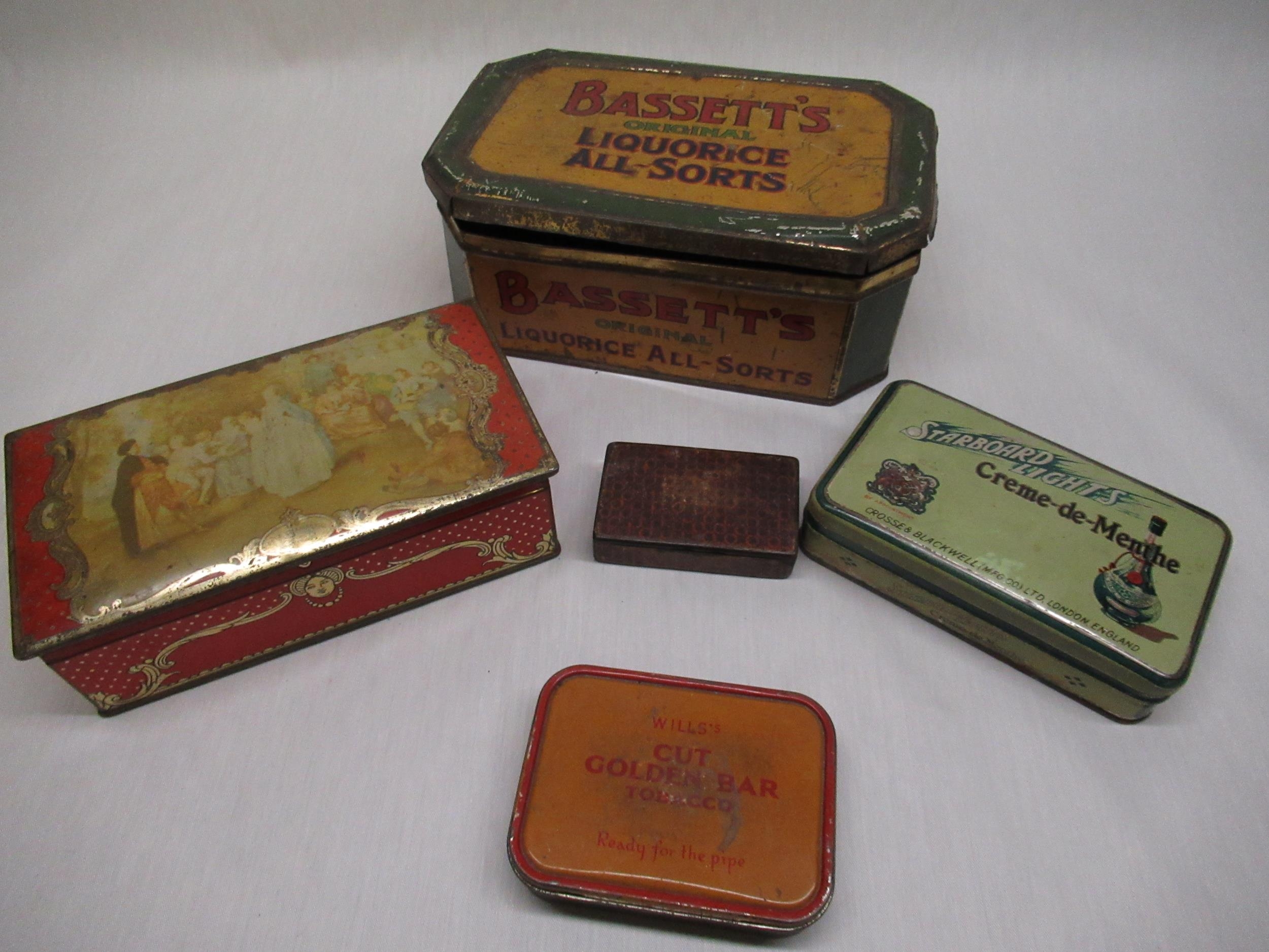 Mid C19th Papier-mâché snuff box W9cm D5.5cm H2cm, 1930's Bassett's original liquorice all-sorts, Crosse & Blackwell Starboard Lights Crème-de-Menthe tin, other early C20th tins