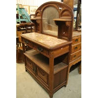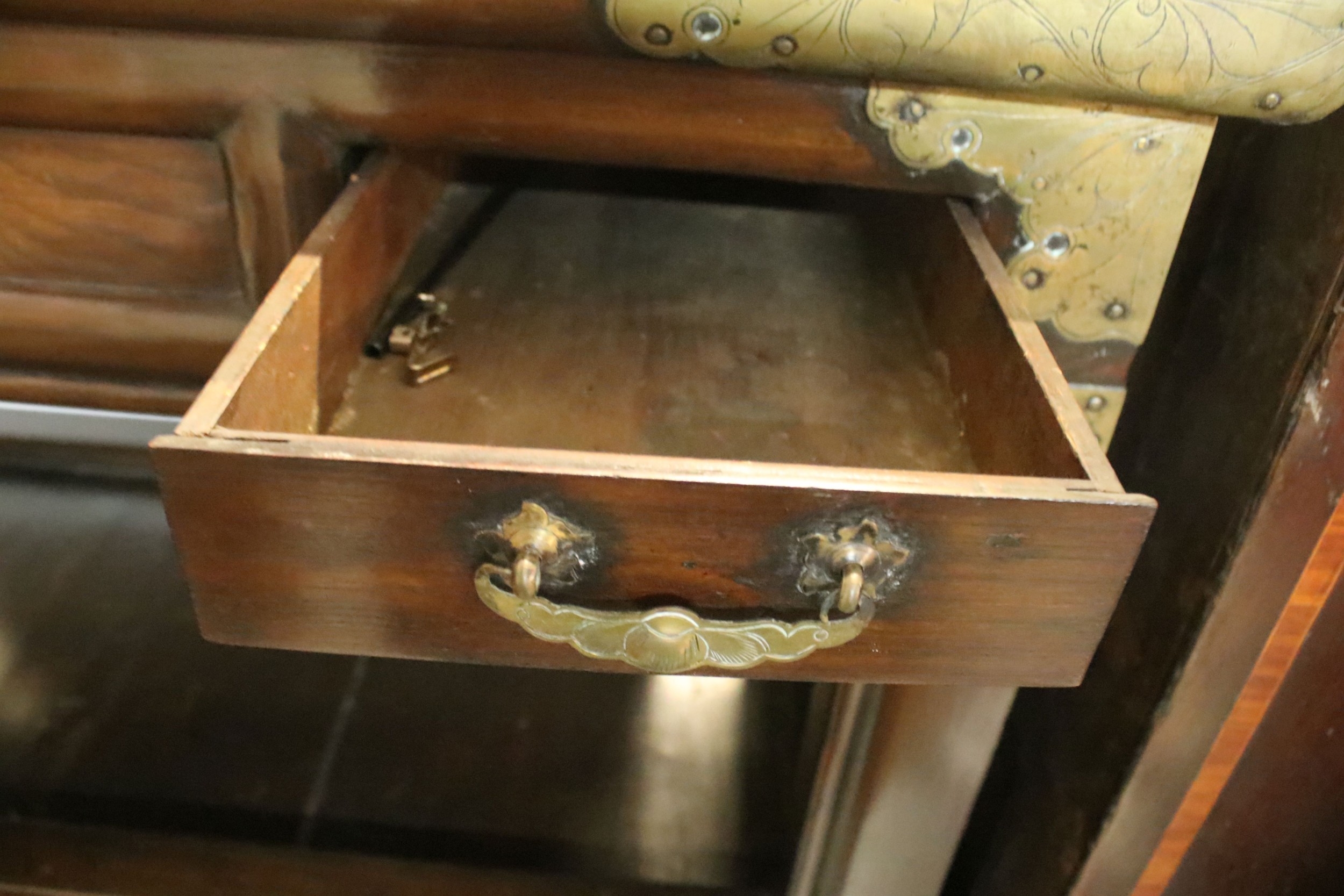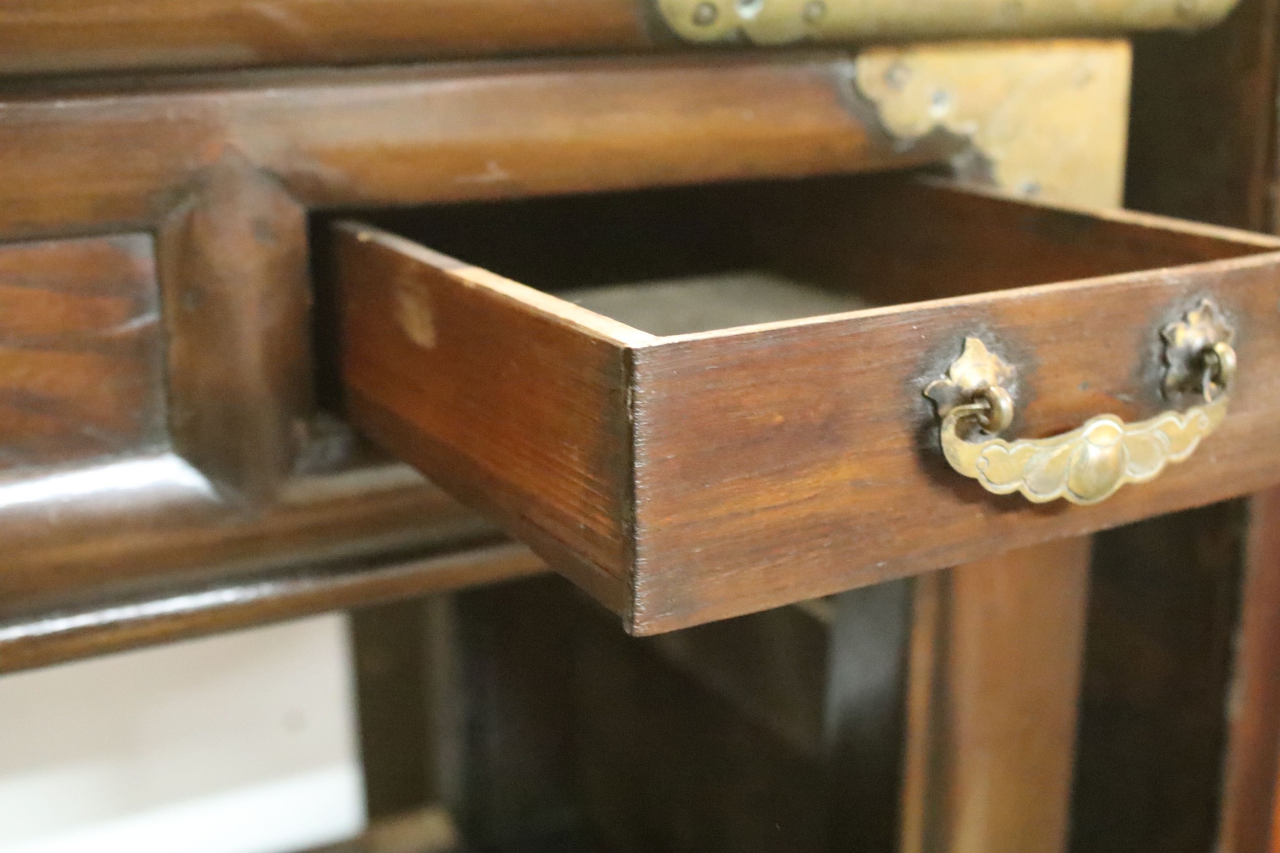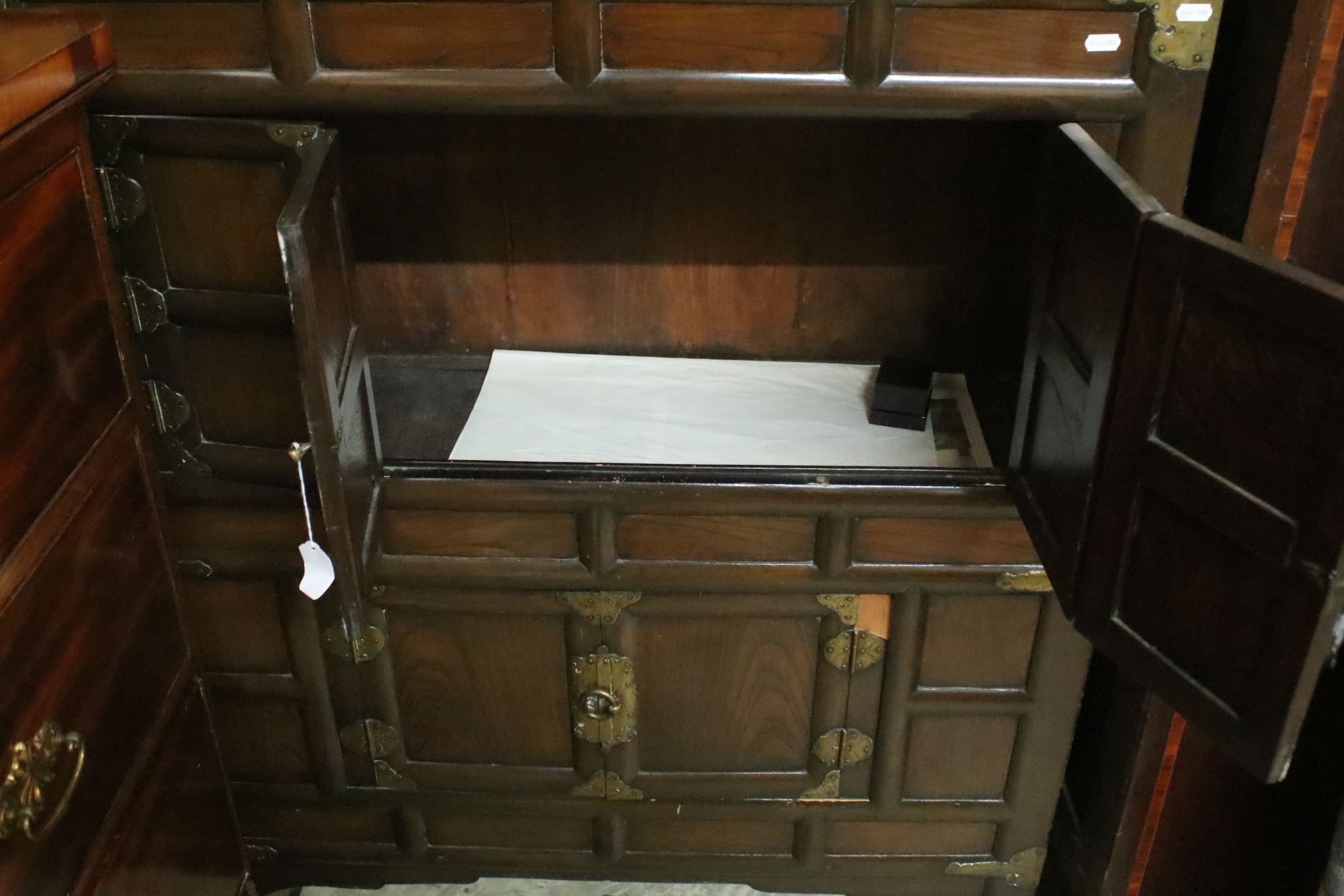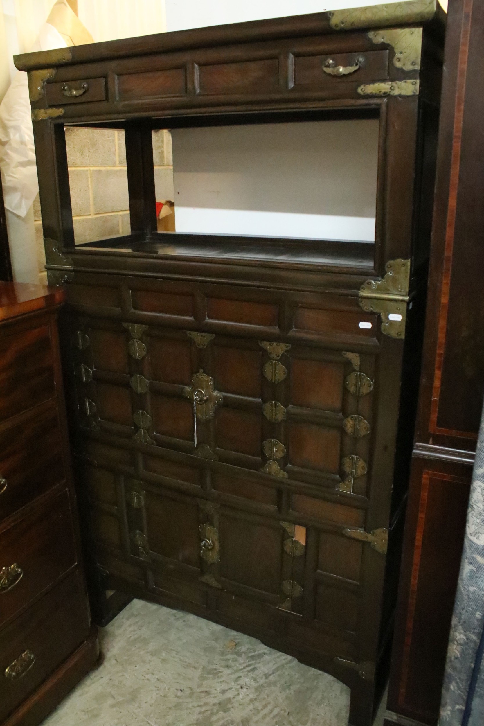 Late 19th/early 20th century elm and brass mounted chest, probably Korean, having detachable top which in turn can be used as a side table, with two drawers upon panelled front with two doored compartments, raised on stile feet, W 99cm x D 44cm x H 170cm