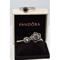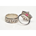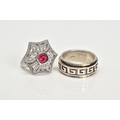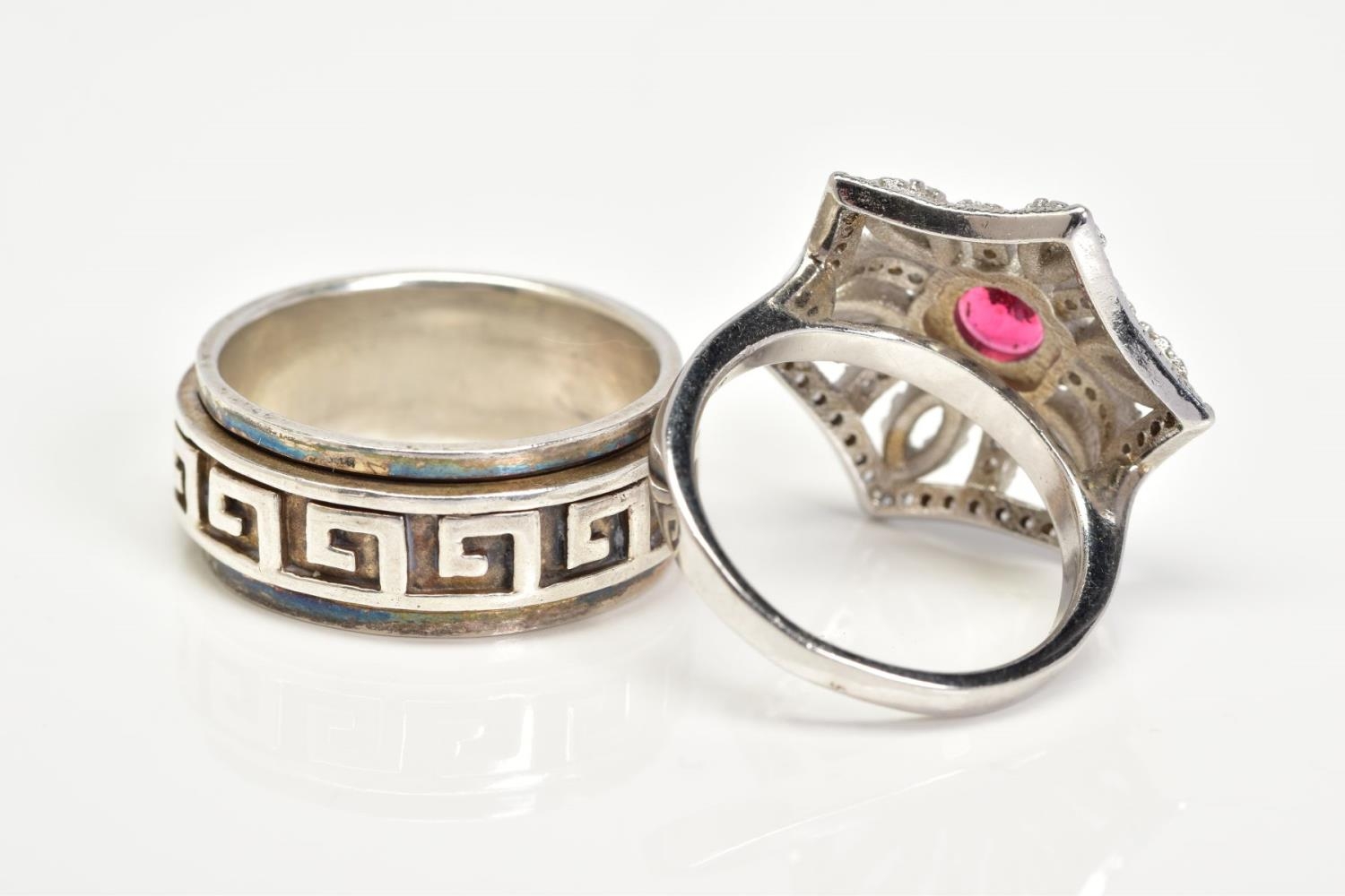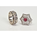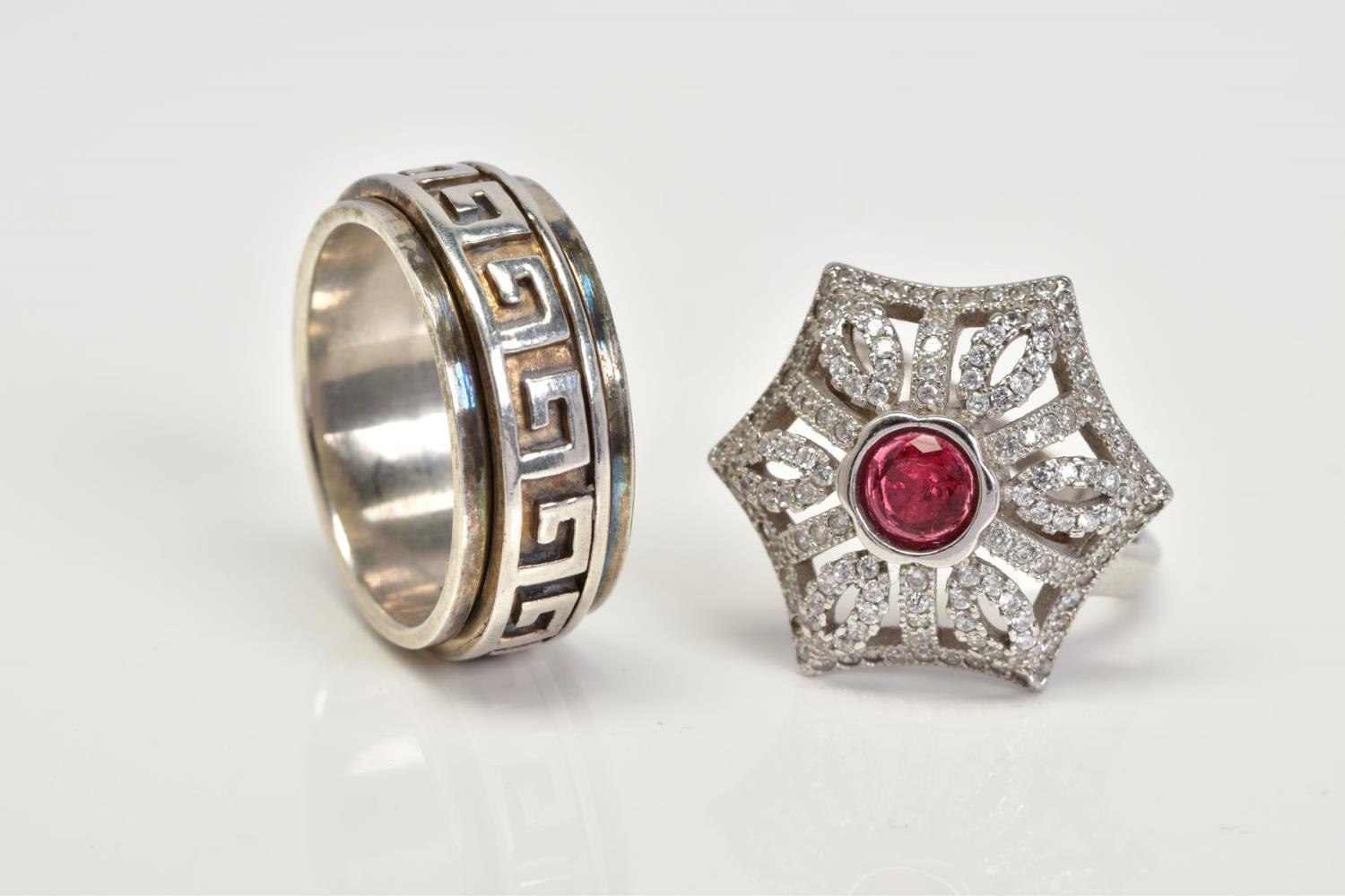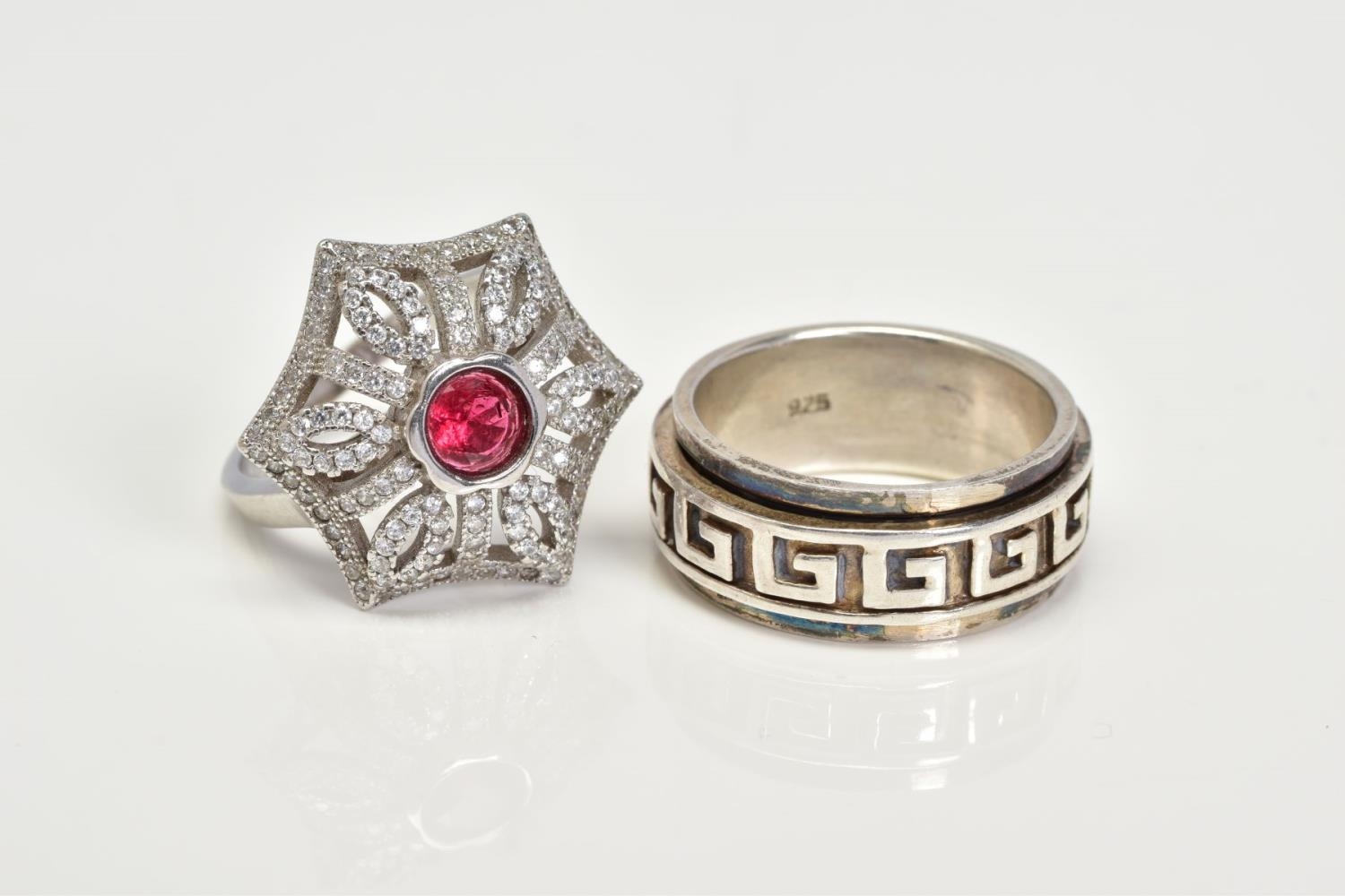 TWO WHITE METAL RINGS, the first a large openwork umbrella style ring, set with a central circular cut red stone assessed as paste within a collet mount to a colourless paste surround, with a silver hallmark for Birmingham, ring size O, together with a white metal wide band with a swivel central panel, ring size S, stamped 925, approximate gross weight 16.4 grams