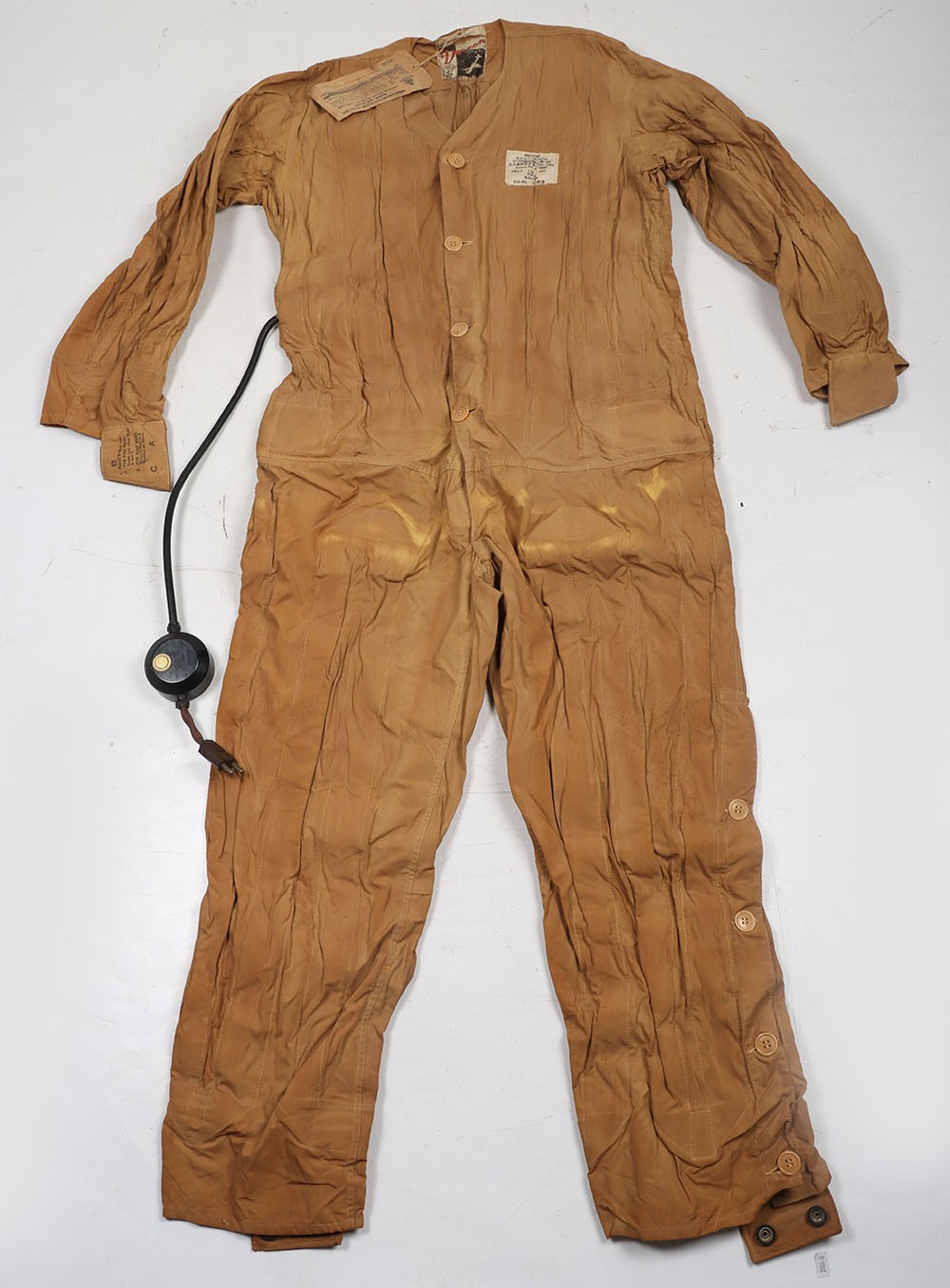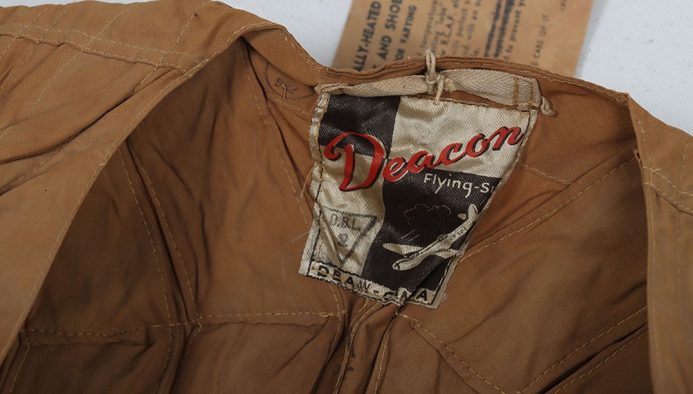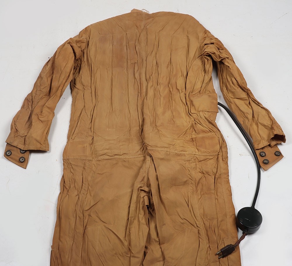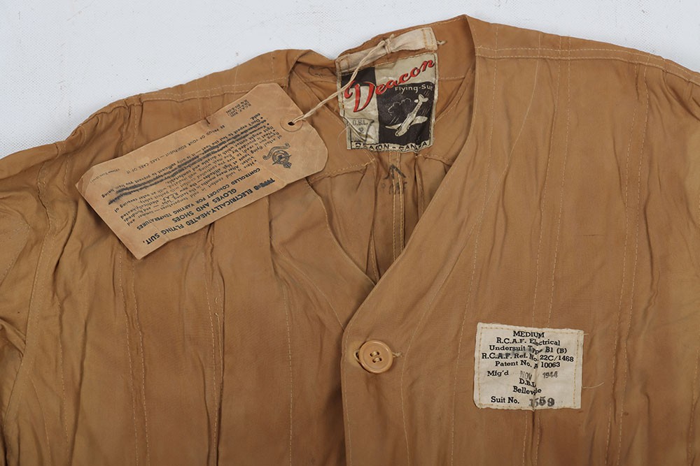 WW2 RCAF, Deacon Flying Suit Electrically Heated Undersuit. A very good example of the Royal Canadian Air Force Deacon electrically heated undersuit Type 'B'. The suit constructed in a heavy cotton has its button closure and heated wiring elements all in situ. The original period labels, one to the outer stating 'RCAF Electrical Undersuit Type B' and dating the garment to 1944 and the Deacon tailors label inside the collar are both in situ. Press studded cuffs for the gloves elements and the two prong jack plug remain with a regulator box. Whats especially nice is the paper label which still hang from the coat hook, with the RCAF crest and intructions of use. Good unissed conditon with minimal storage related wear. Rare item of flying clothing.