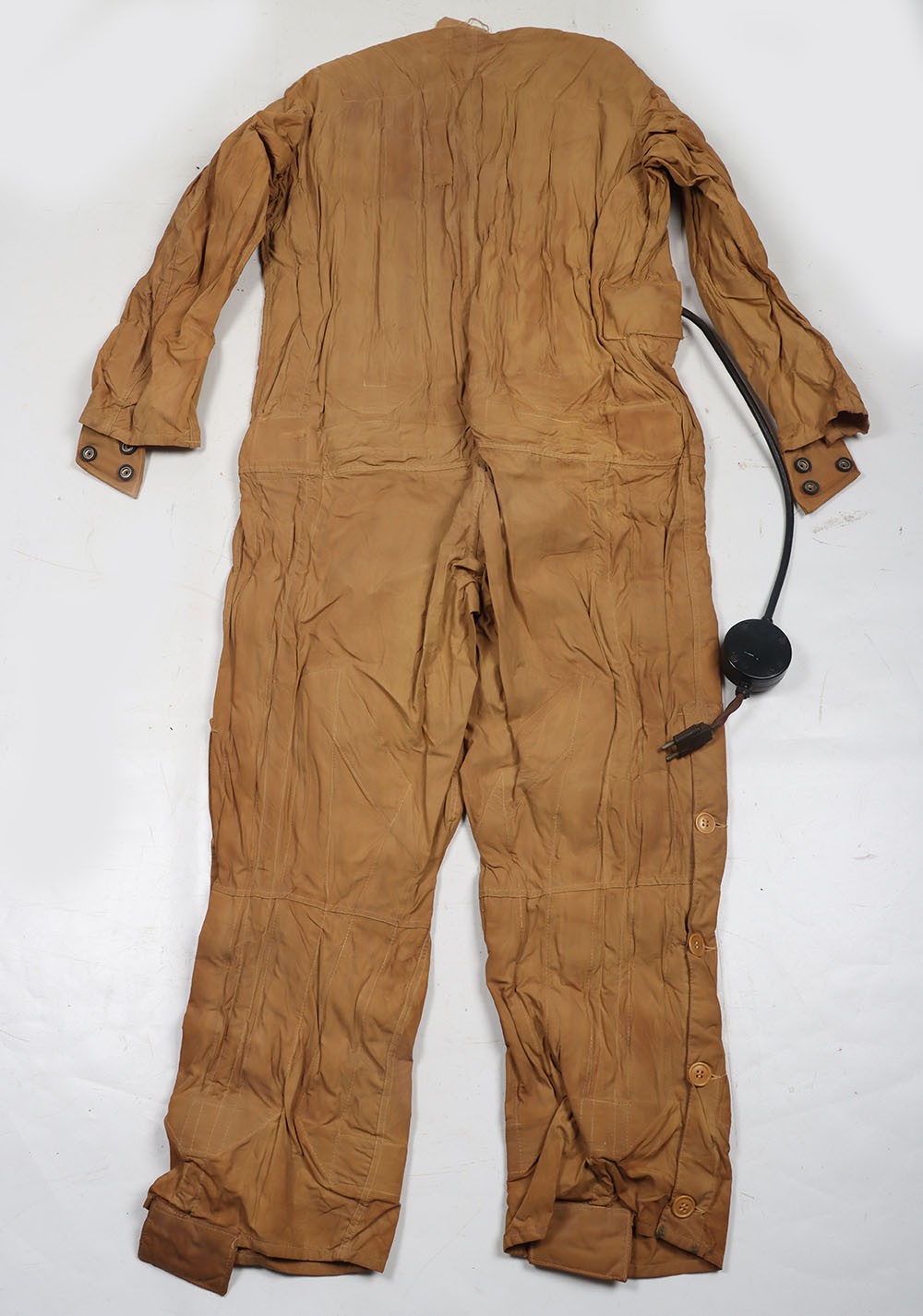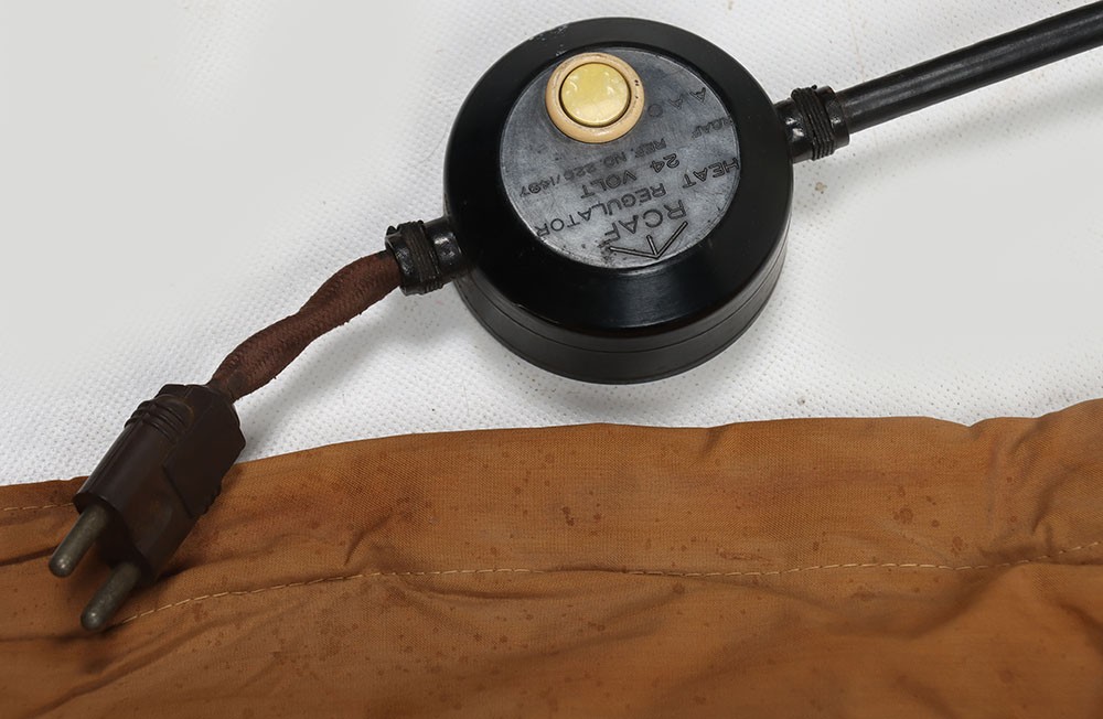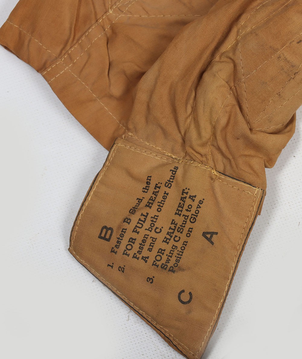 WW2 RCAF, Deacon Flying Suit Electrically Heated Undersuit. A very good example of the Royal Canadian Air Force Deacon electrically heated undersuit Type 'B'. The suit constructed in a heavy cotton has its button closure and heated wiring elements all in situ. The original period labels, one to the outer stating 'RCAF Electrical Undersuit Type B' and dating the garment to 1944 and the Deacon tailors label inside the collar are both in situ. Press studded cuffs for the gloves elements and the two prong jack plug remain with a regulator box. Whats especially nice is the paper label which still hang from the coat hook, with the RCAF crest and intructions of use. Good unissed conditon with minimal storage related wear. Rare item of flying clothing.