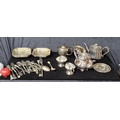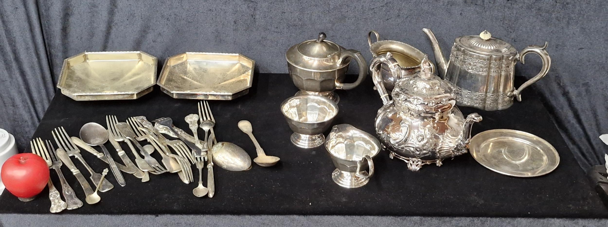 A Large selection of antique table ware comprising of, cutlery, teapots, sugar bowl and milk jug.