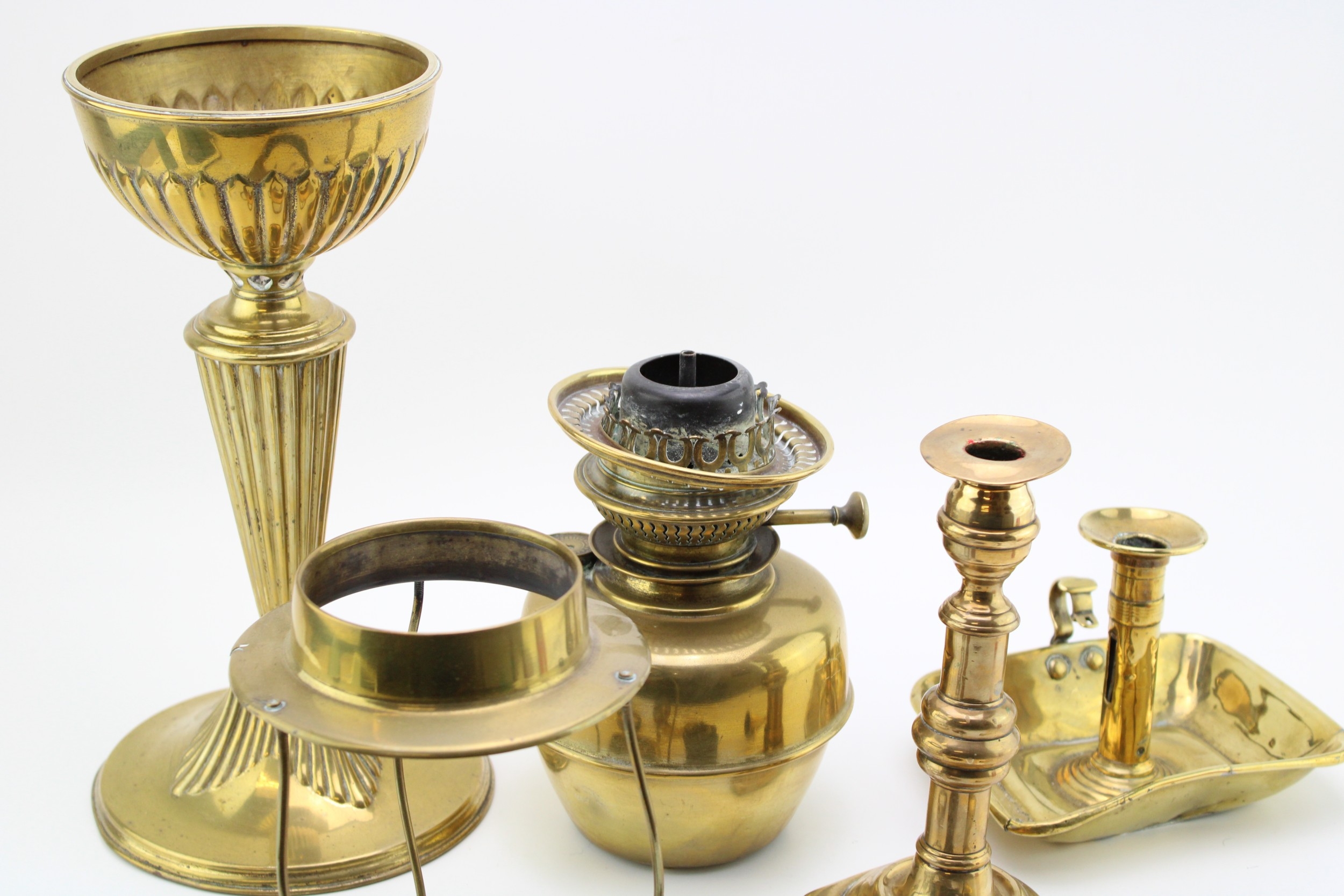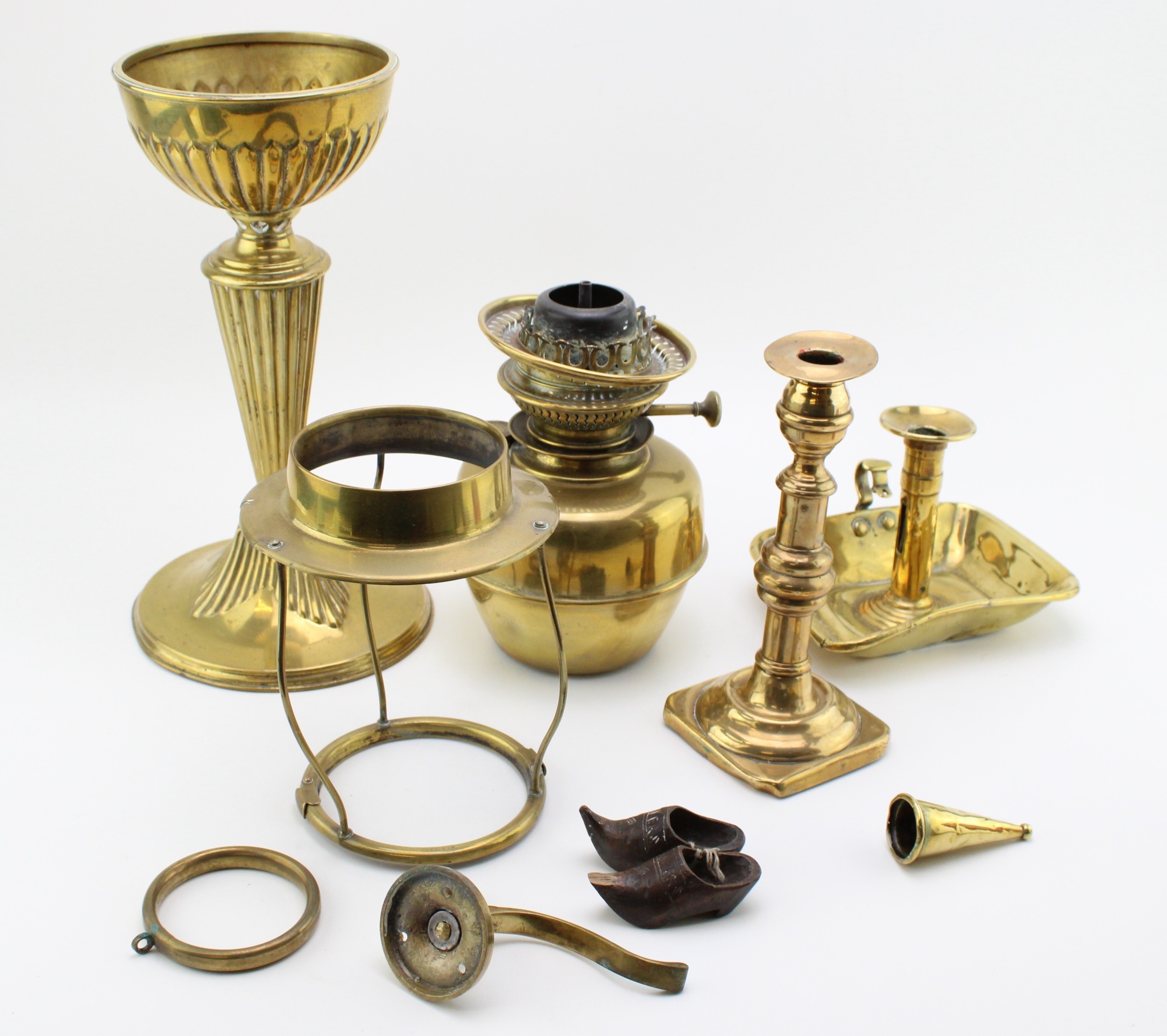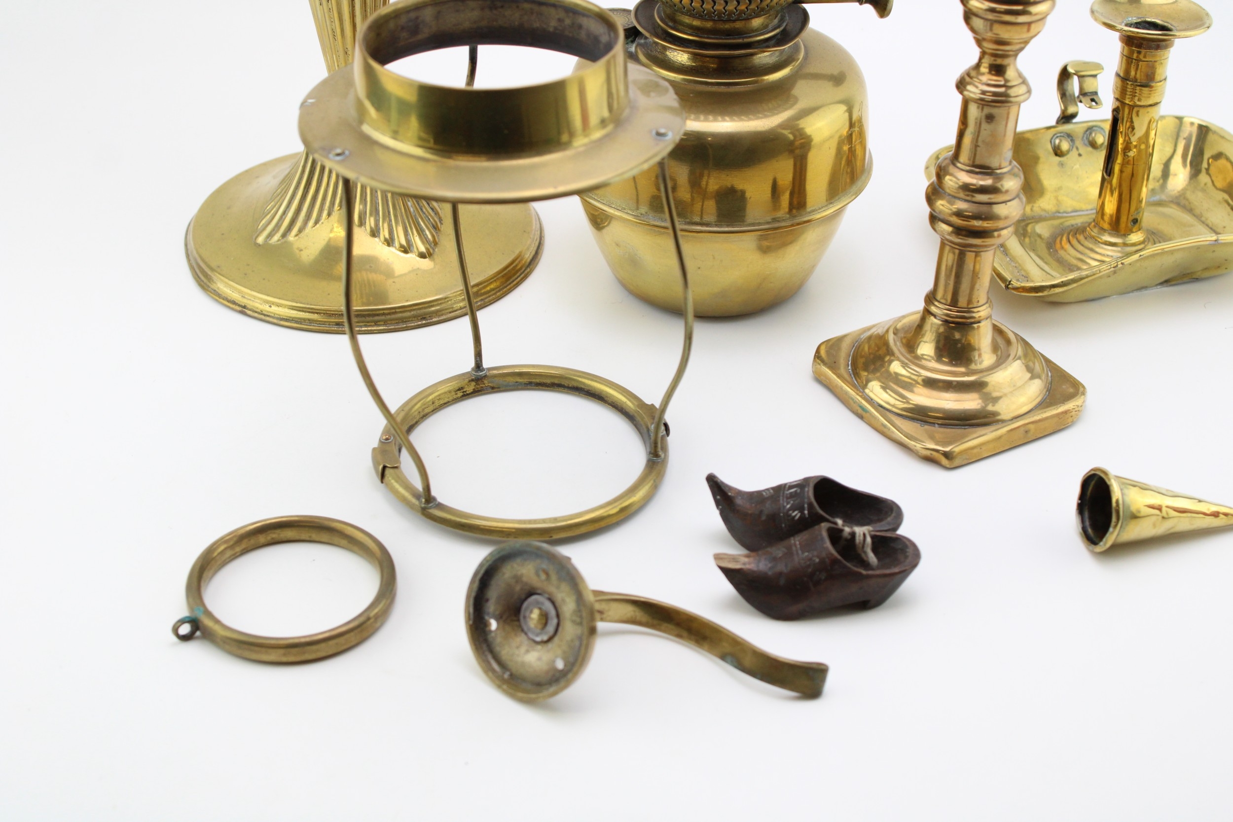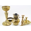 A mixed collection of brass item to include an early 20th century oil lamp and other similar items, (Qty).