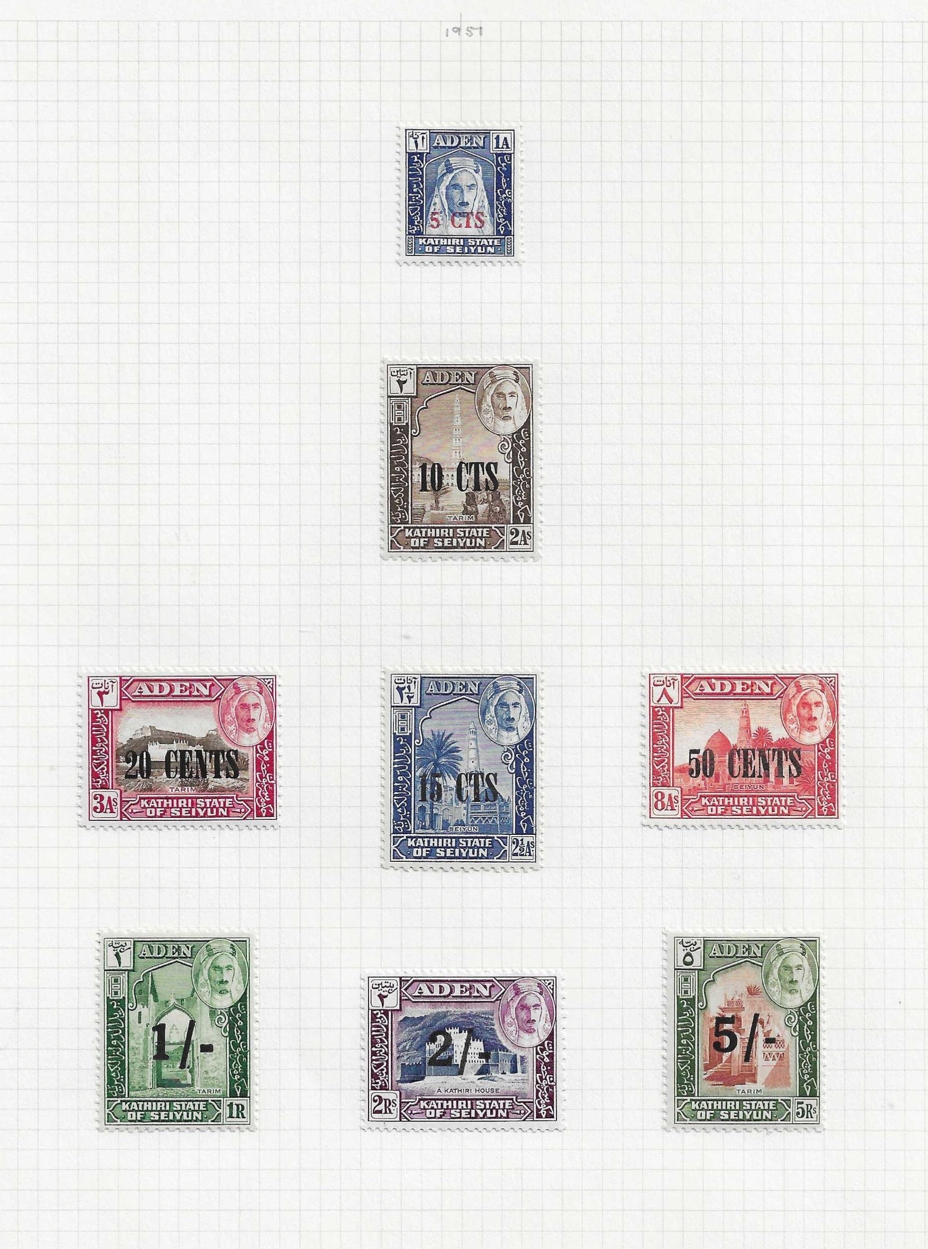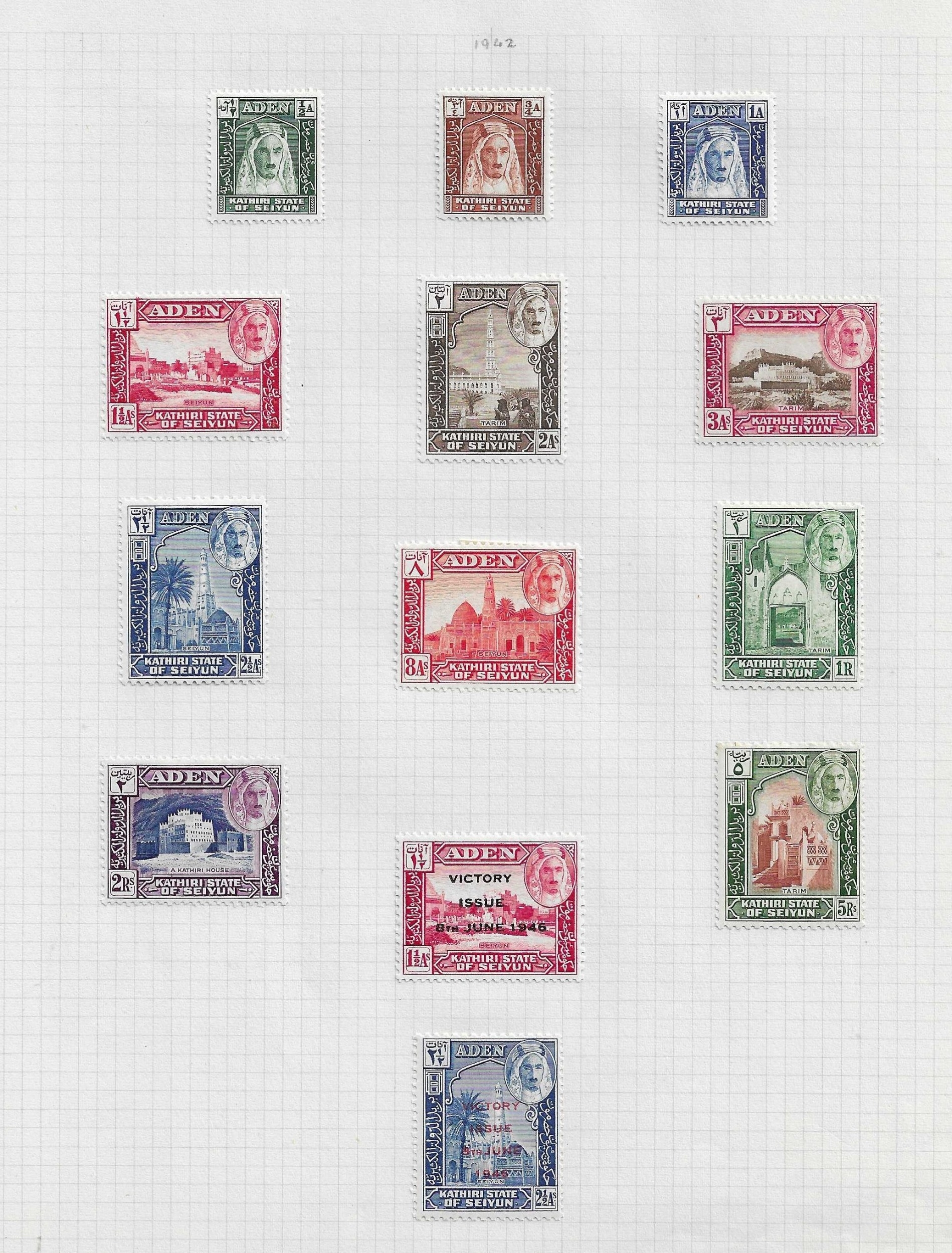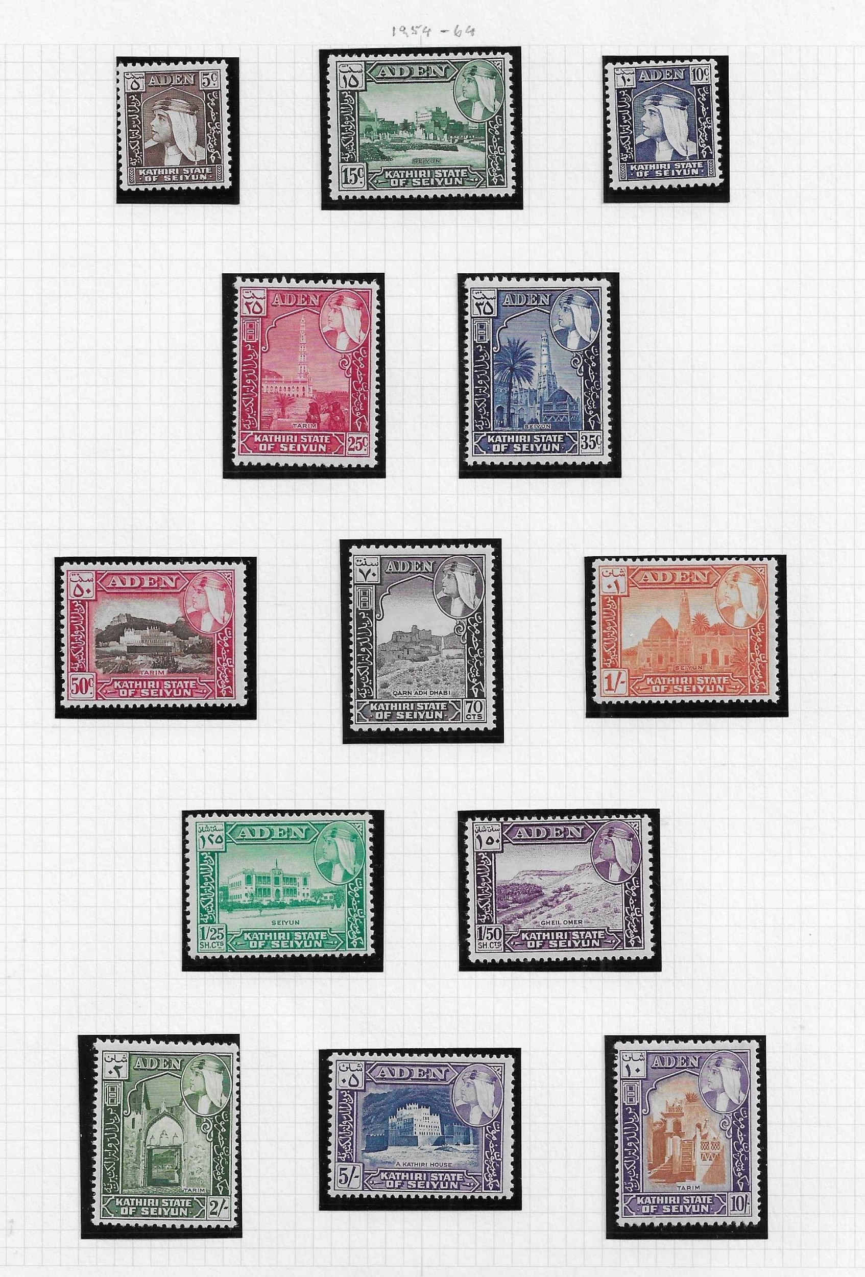 ADEN - STATES - 1942-63 mainly mint collection on leaves for Kathiri State of Seiyun 1942 set, 1048 RSW set, Qu'aiti State in Hadhramaut 1942 set, 1963 full set, STC £370, fine. (95)