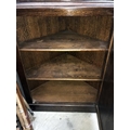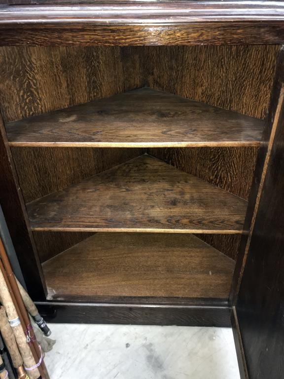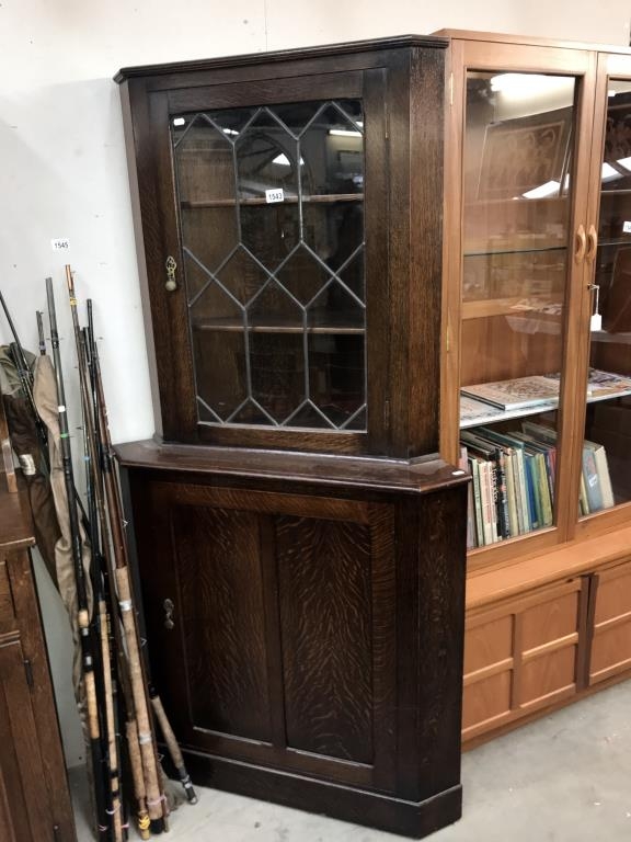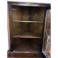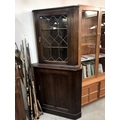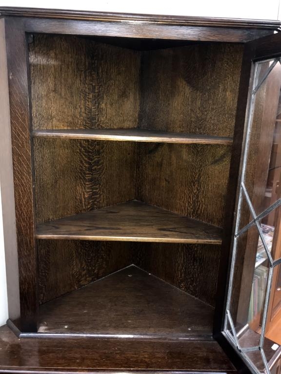 A dark oak corner cabinet with leaded glass door, 90 cm wide x 179 cm high.
