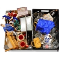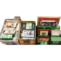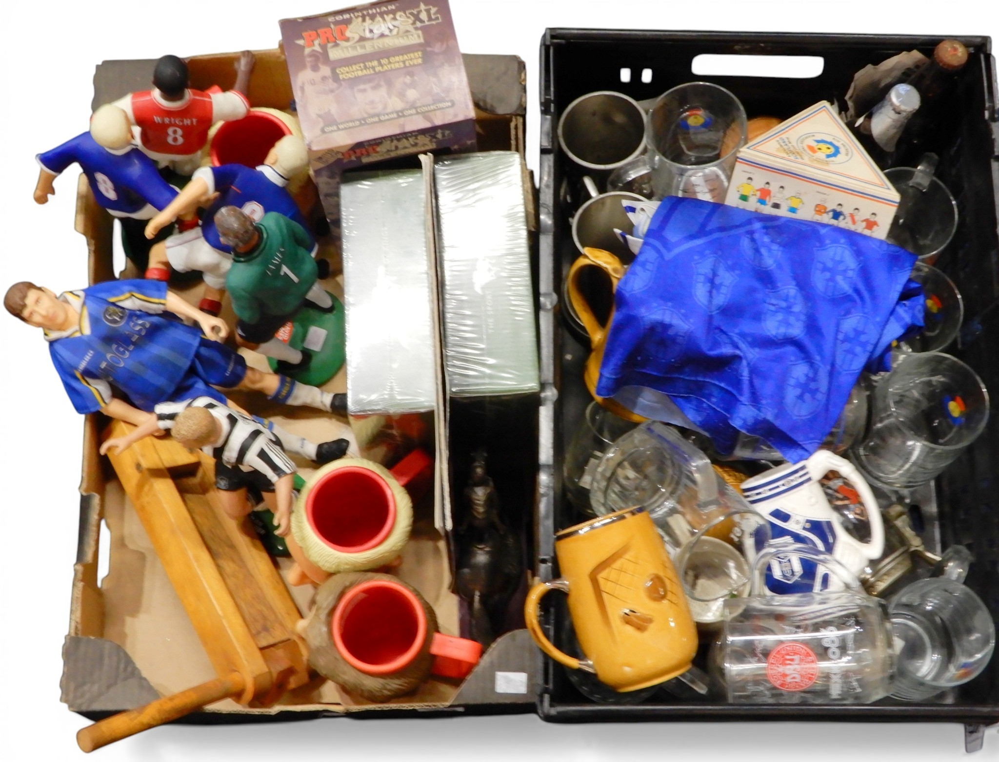 Miscellaneous football collectables, to include sealed bottles of Watney Mann 1966 World Cup Ale and Stones Export Sheffield Wednesday vs. Manchester United 21st April 1991 beer; numerous commemorative glass and ceramic tankards; 1990s-era Vivid Imaginations footballer figures; three various Atlas Editions racehorse statuettes; an Esso 100 Years of Football coin collection (complete); a Brasil Ronaldo shirt etc. (2 boxes)