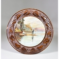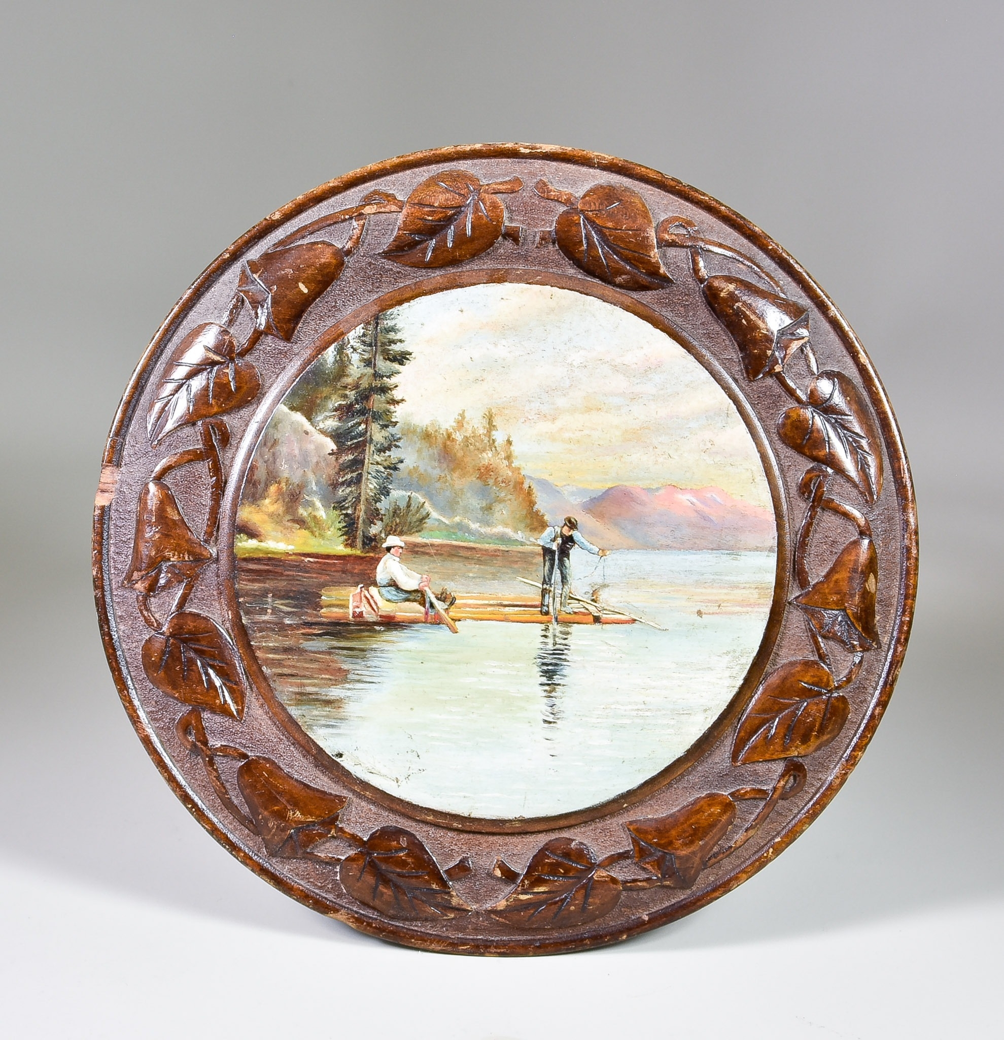 A 19th Century Continental Turned Hardwood Breadboard or Wall Plaque, of circular form the border carved with morning glory leaves, the centre painted with a Canadian lake scene, 11.5ins diameter