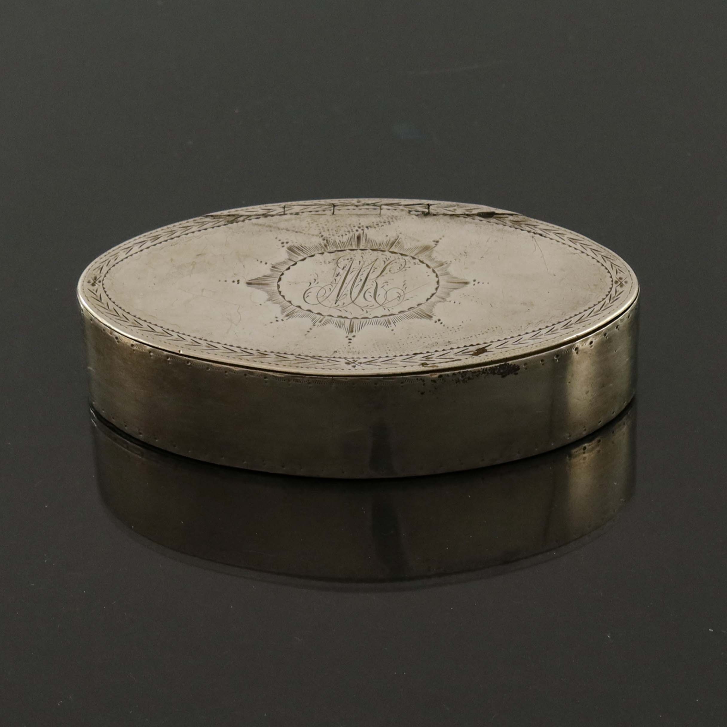 A George IV silver snuff box, Jonathan Perkins, London 1821, navette form, bright cut with central star cartouche within a laurel border, hinged lid and gilt interior, 8.5cm long, 1.92ozt