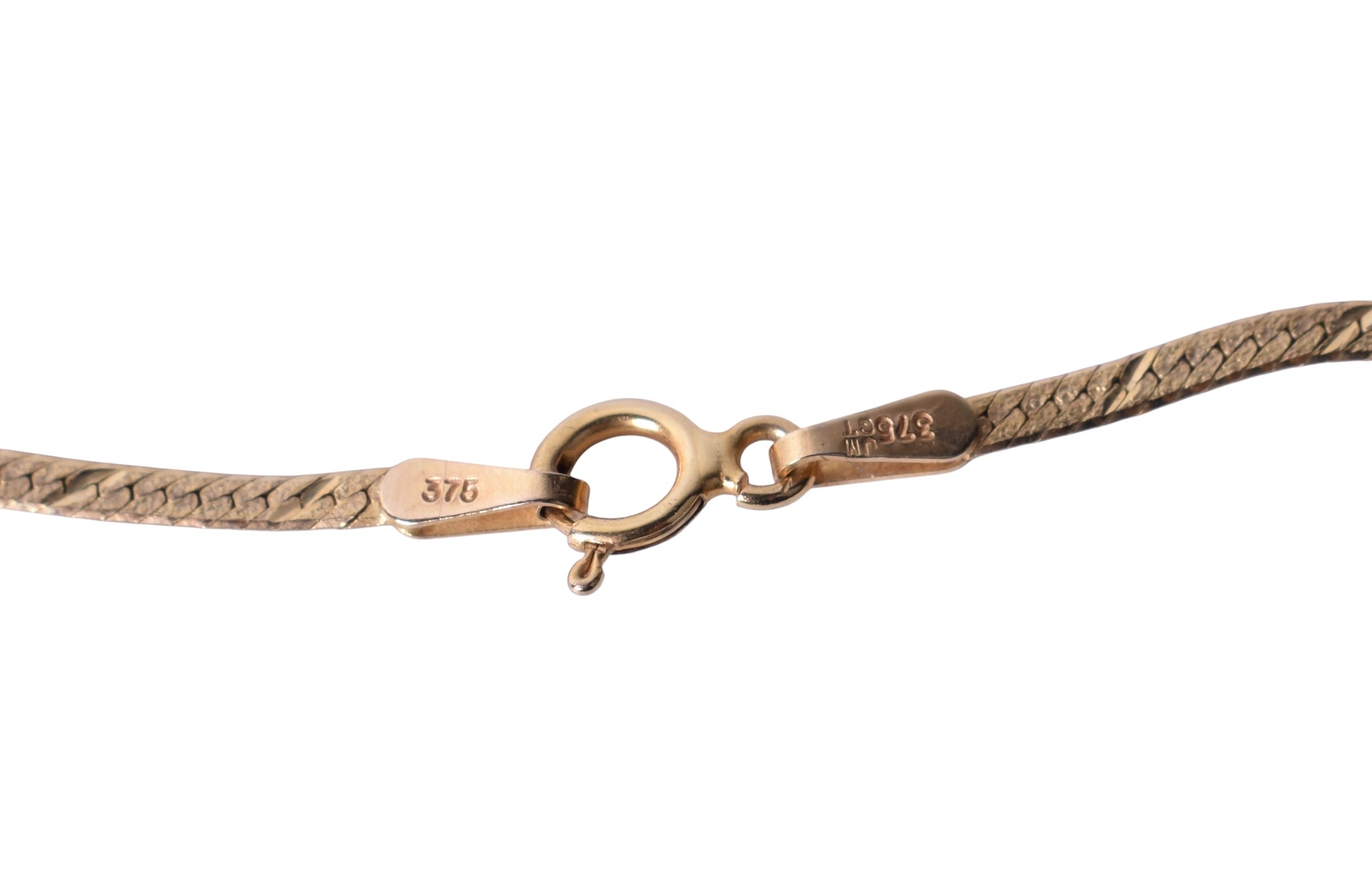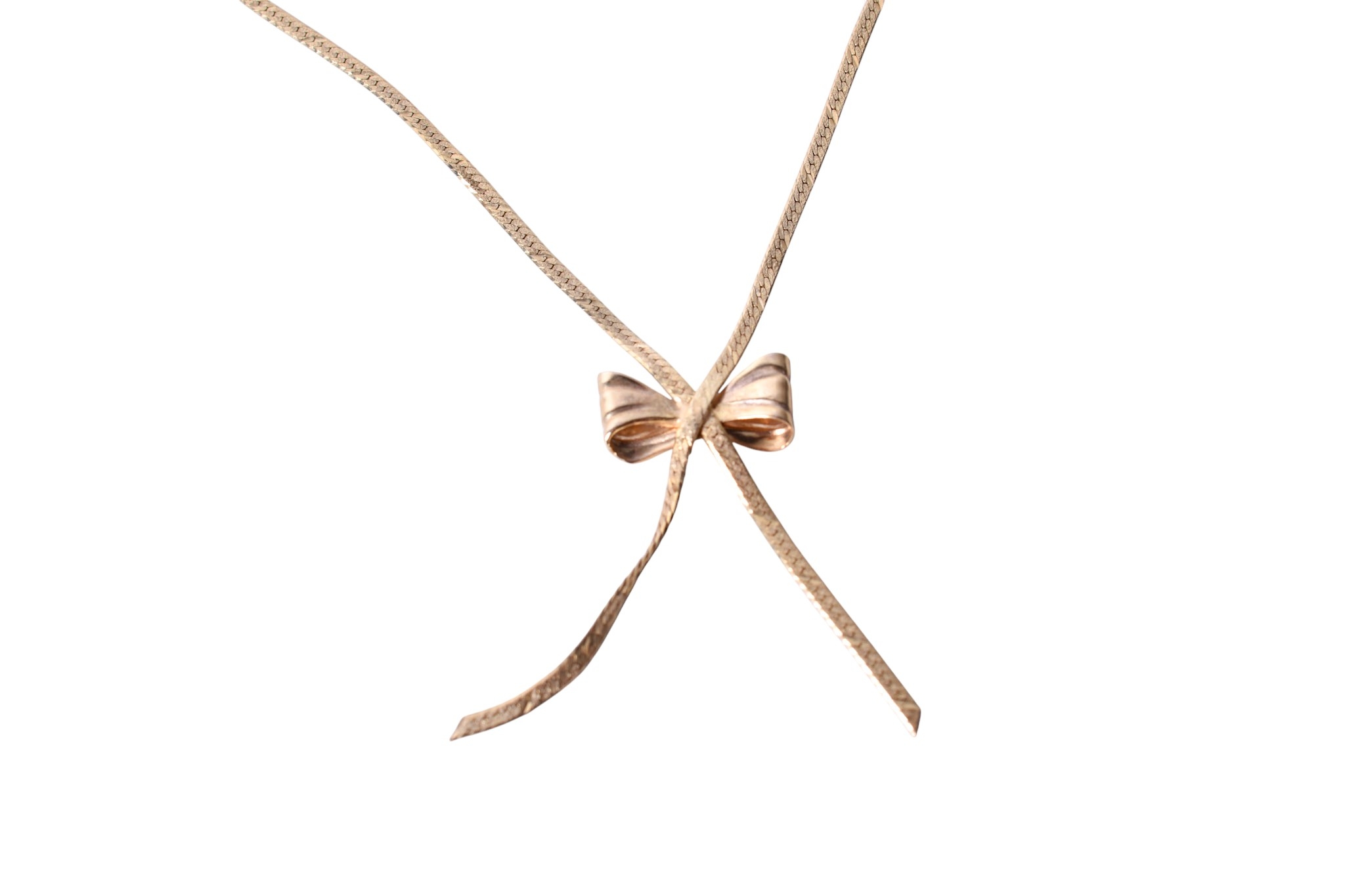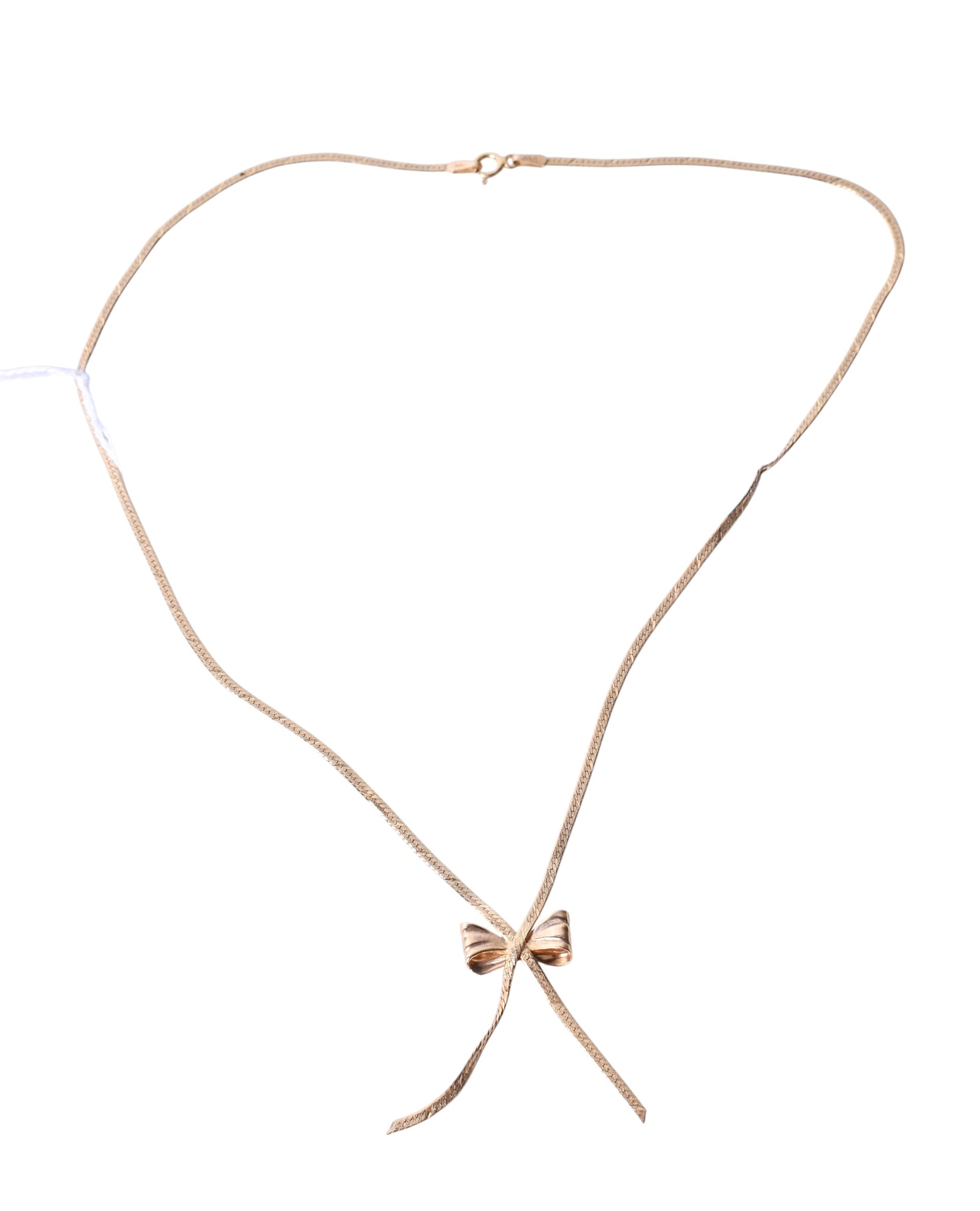 A 9ct gold chain. The thin herringbone chain finished with a fixed bow pendant, circa L40cm to the bow, clasp marked 375 and with import mark. Weight 3.3g.