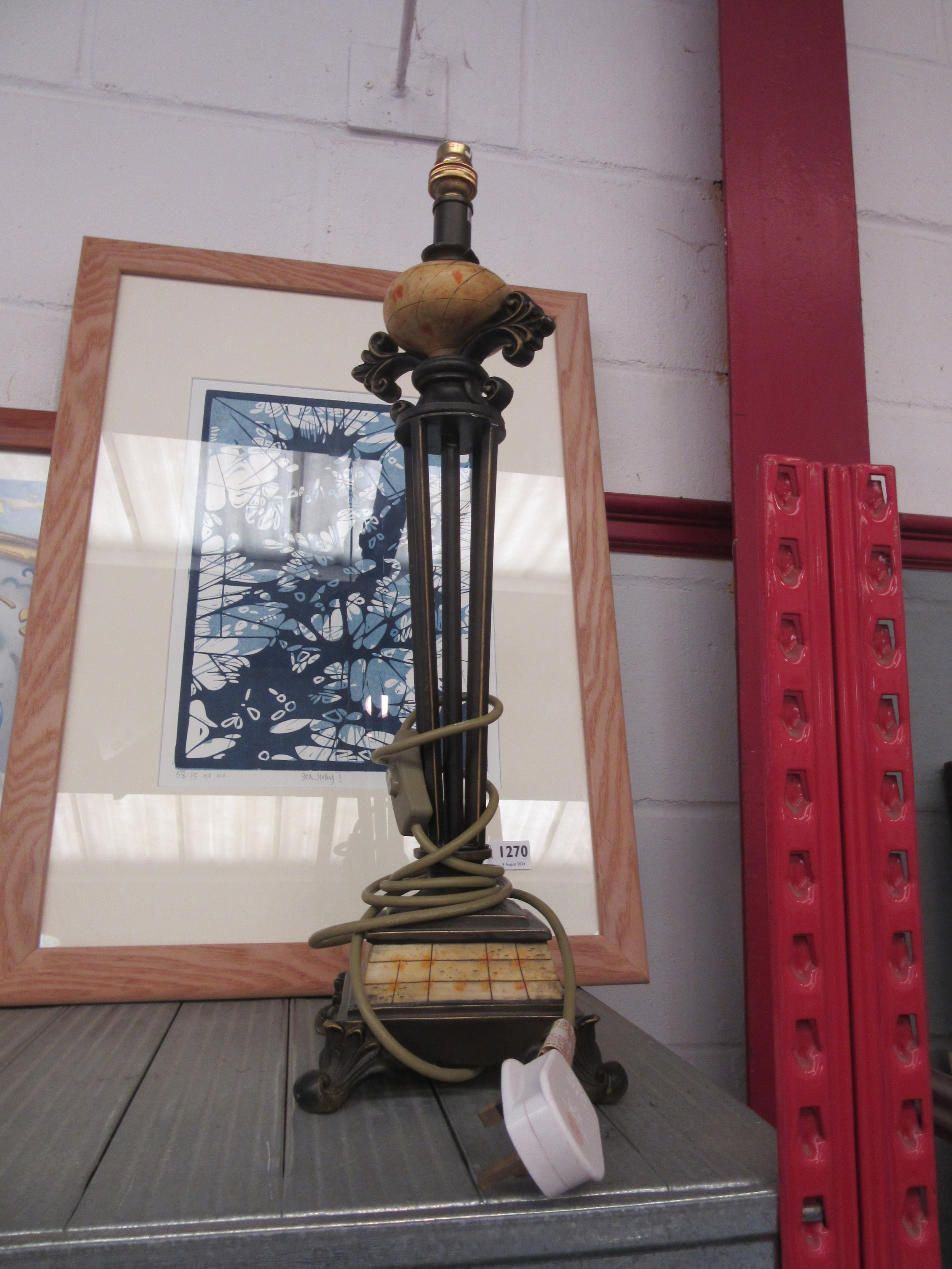 A 20th Century ornate metal table lamp on platform base, 56cm tall