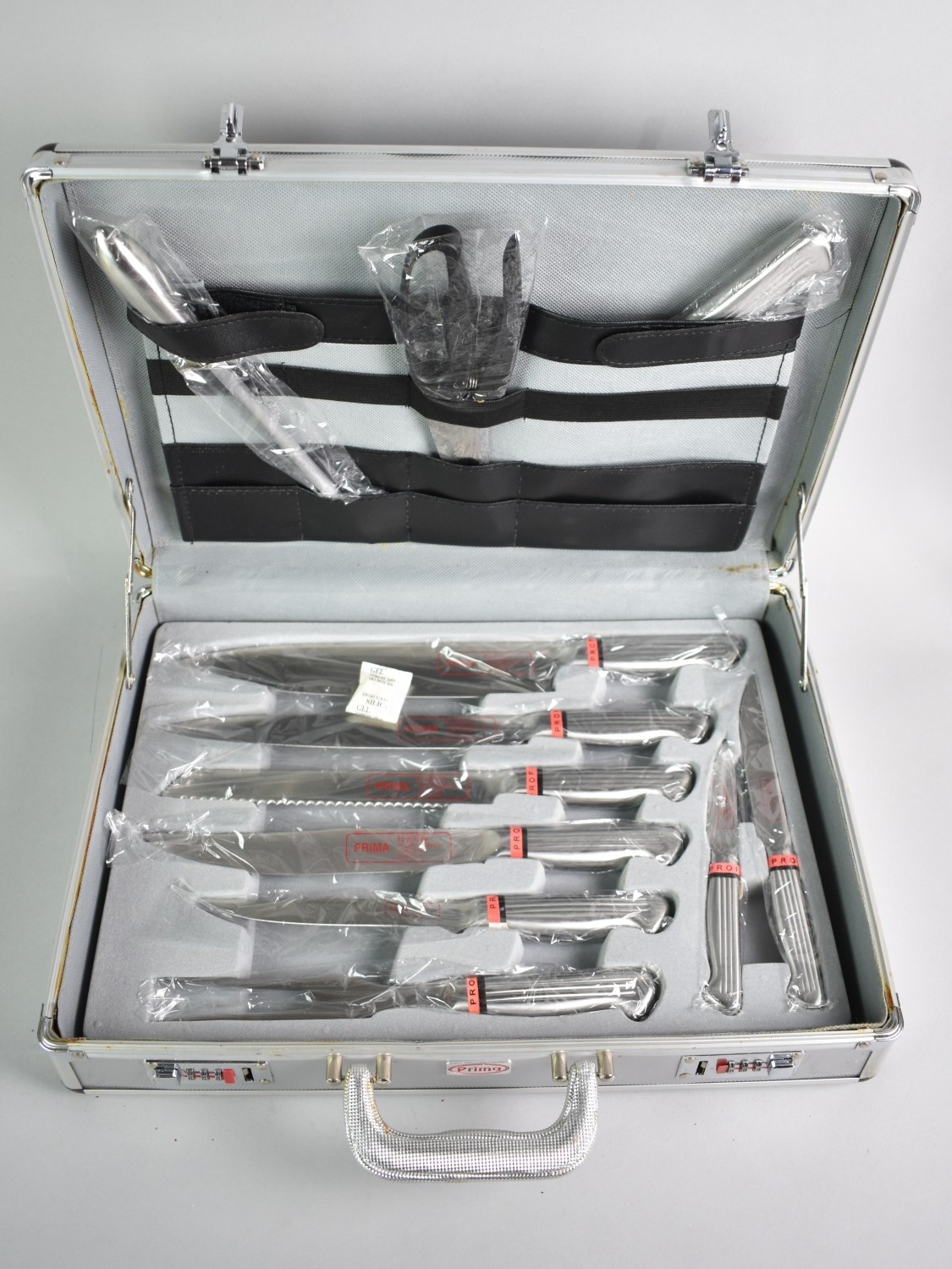 A Prima Kitchen Knife Set in Case with Combination Lock, Unused Condition