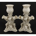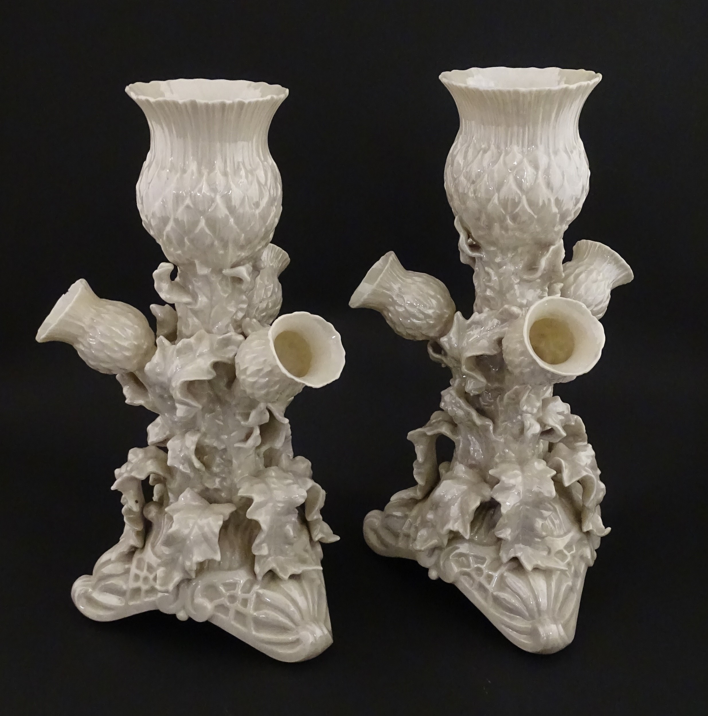 A pair of Belleek Thistle vases with lustre detail. Marked with Second Period mark under. Approx. 10 1/2" high (2)