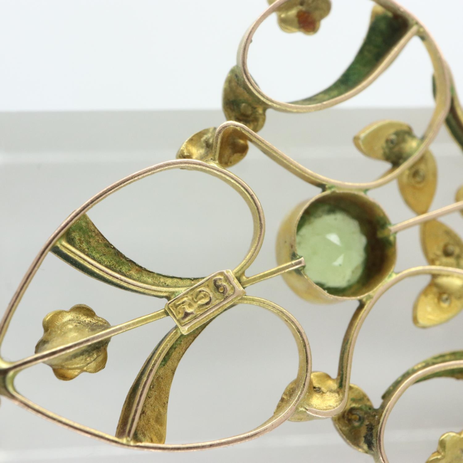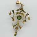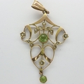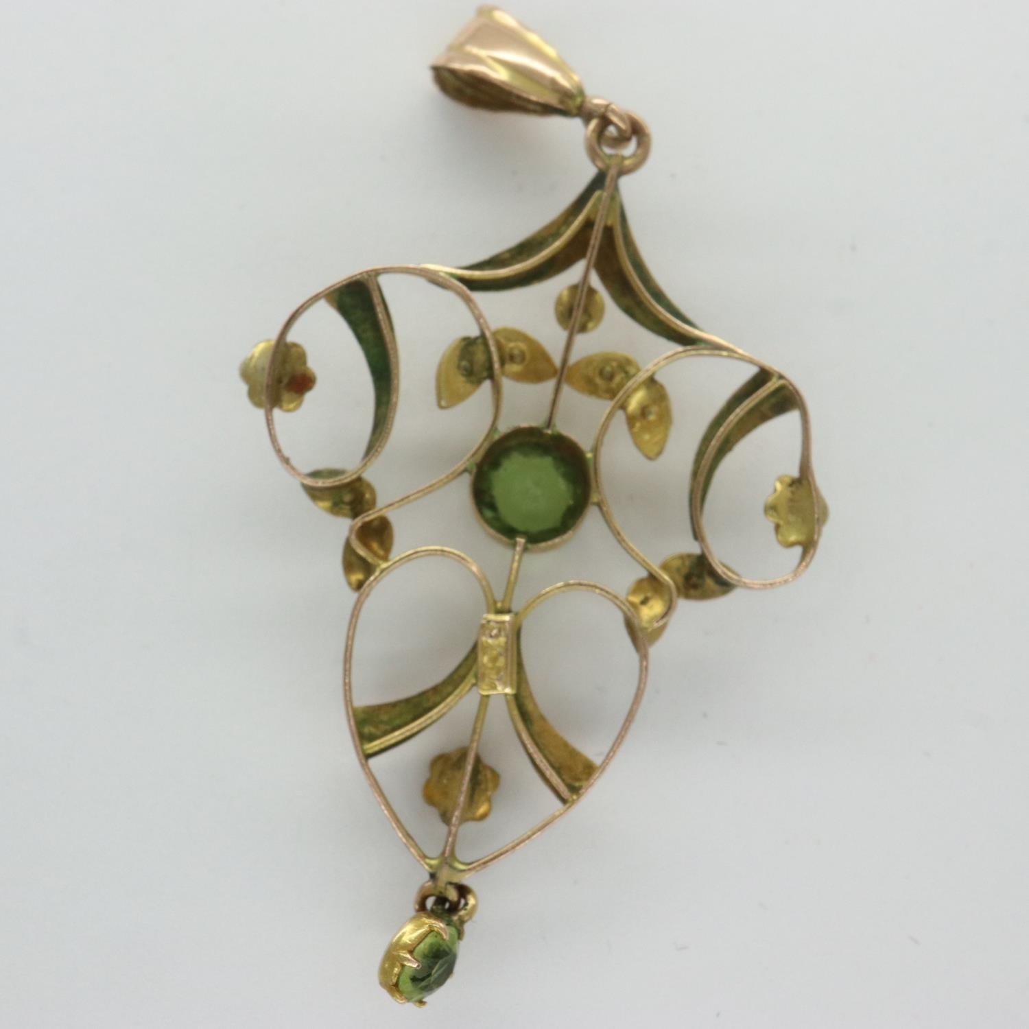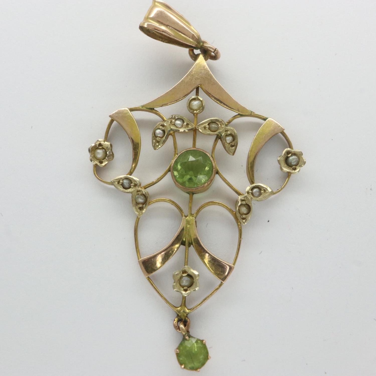 9ct gold Art Nouveau pendant set with seed pearls and tourmaline, 2.1g. P&P Group 1 (£14+VAT for the first lot and £1+VAT for subsequent lots)