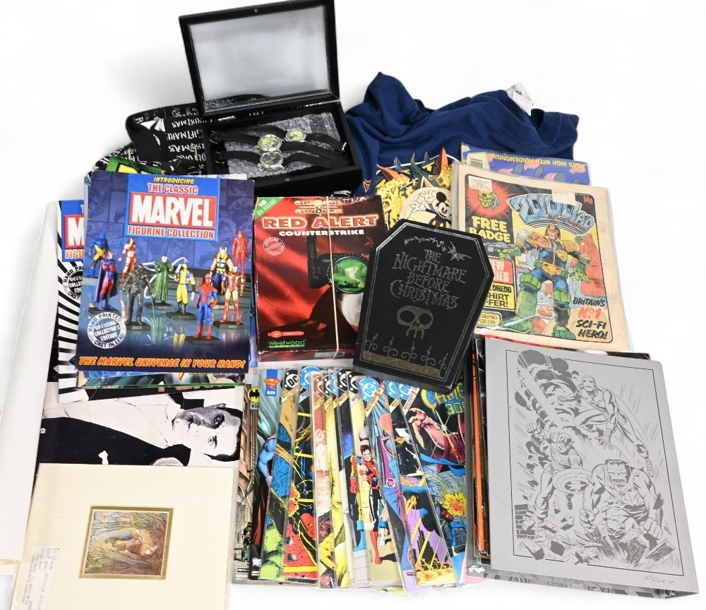 Selection of Collectables to include The Night Before Christmas Watches and Bag, DC Comics Camelot 3000, Disney Sweatshirt, 2000AD Comics, Marvel Figures magazines (box)