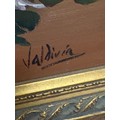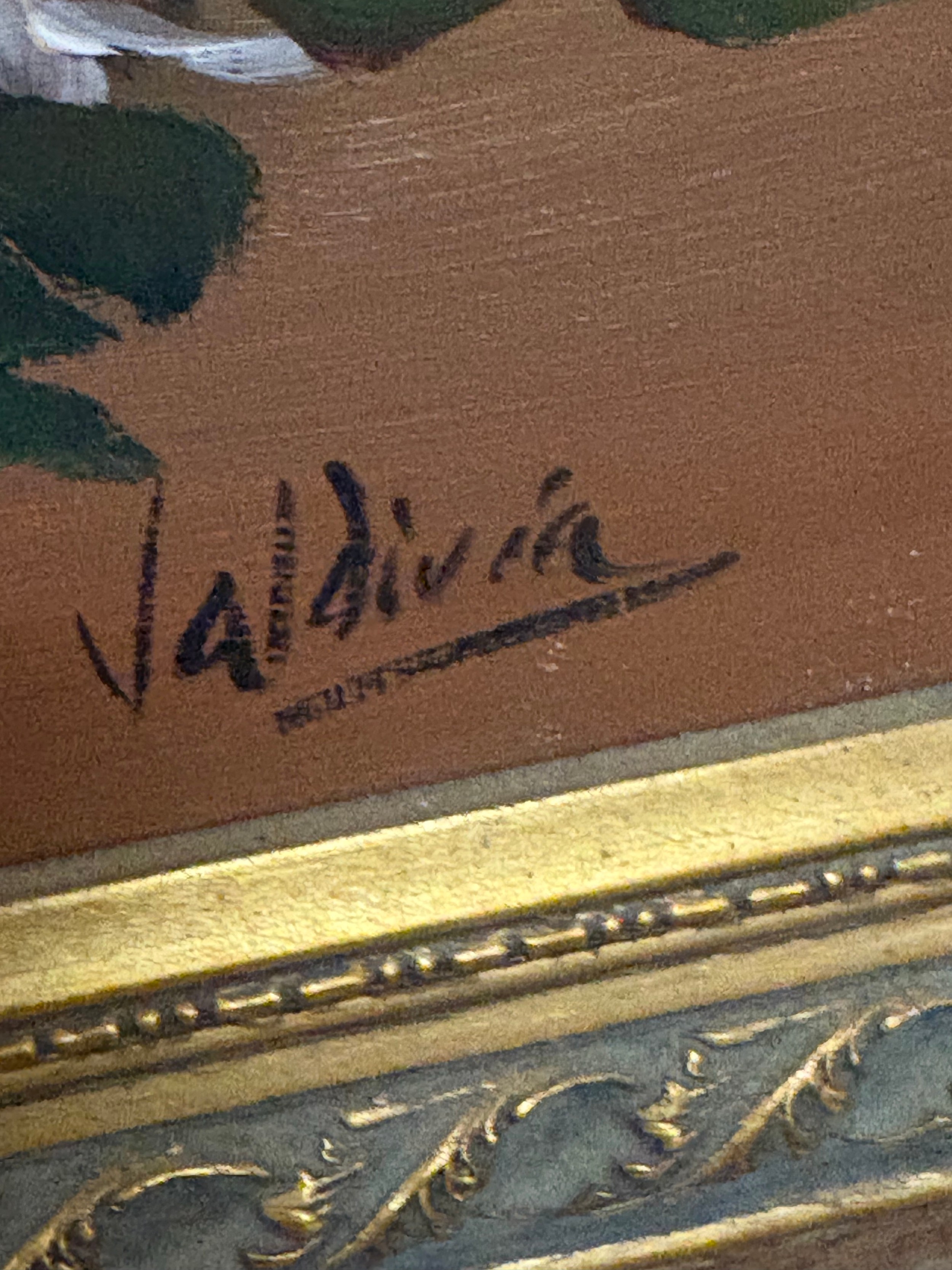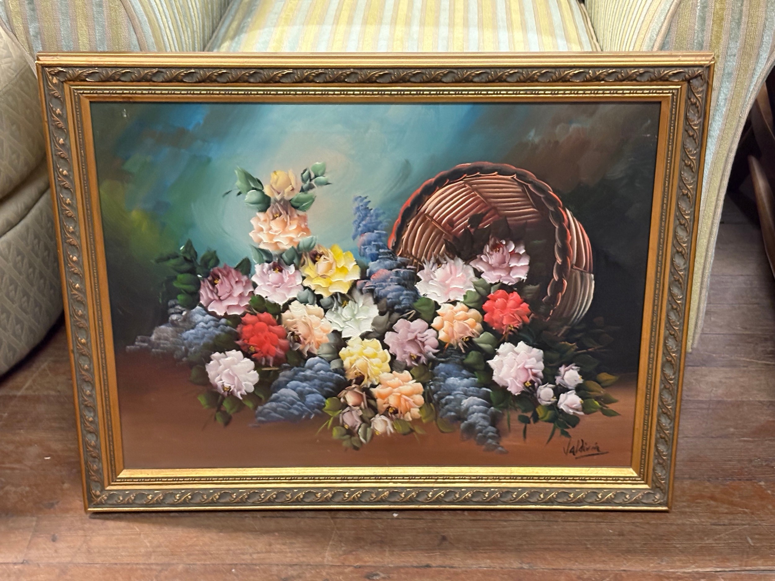 gilt framed oil painting depicting basket of flowers, signed Valdivia 27x21.5"