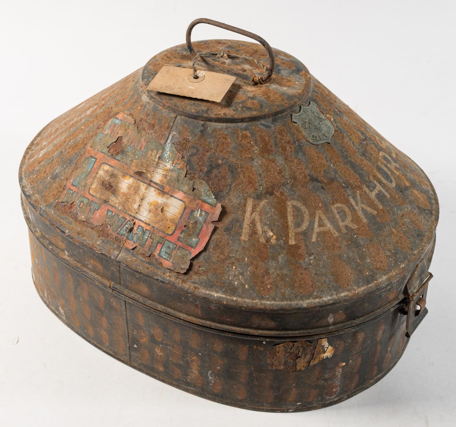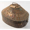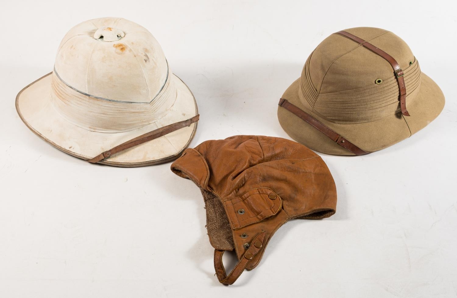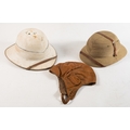 A lacquer hat tin by Gieves, London, inscribed 'F Parkhurst': together with a Wolseley pattern pith helmet by Gieves, London, a green Belgian pith helmet and a leather flying helmet (4)