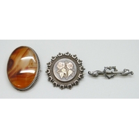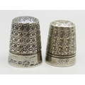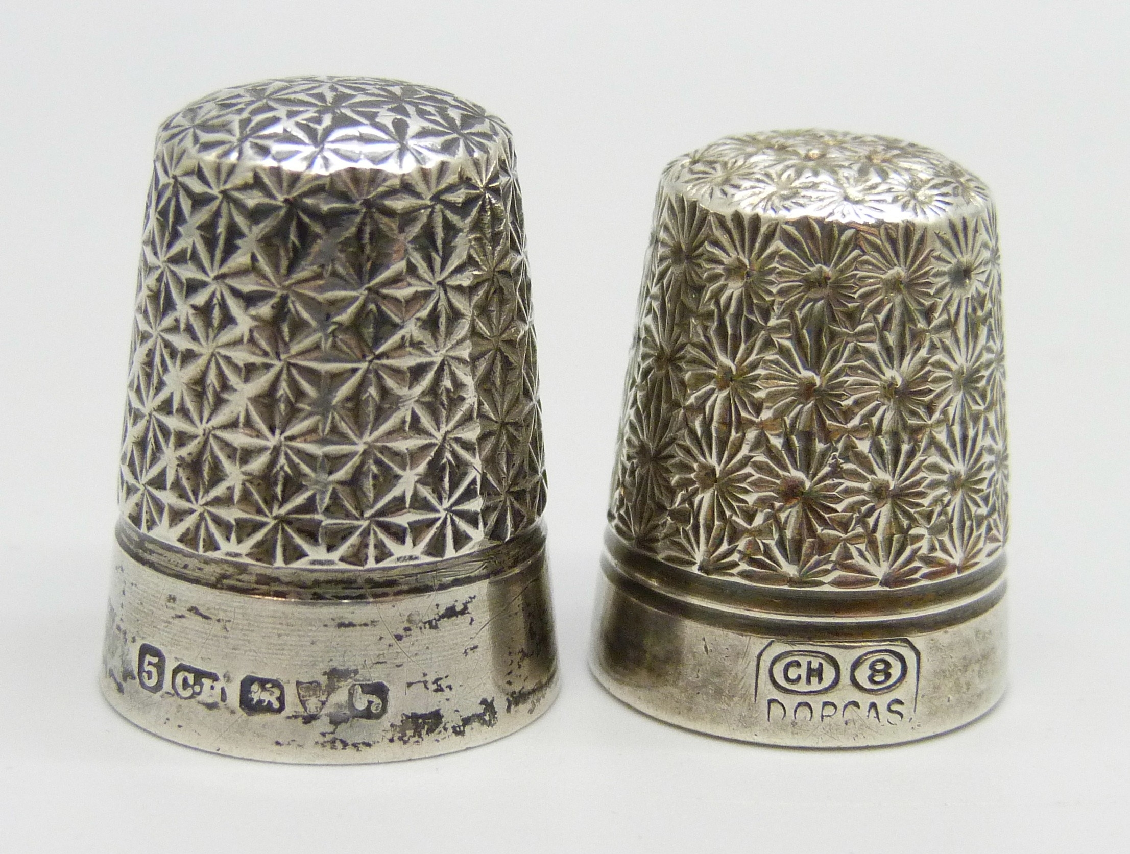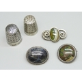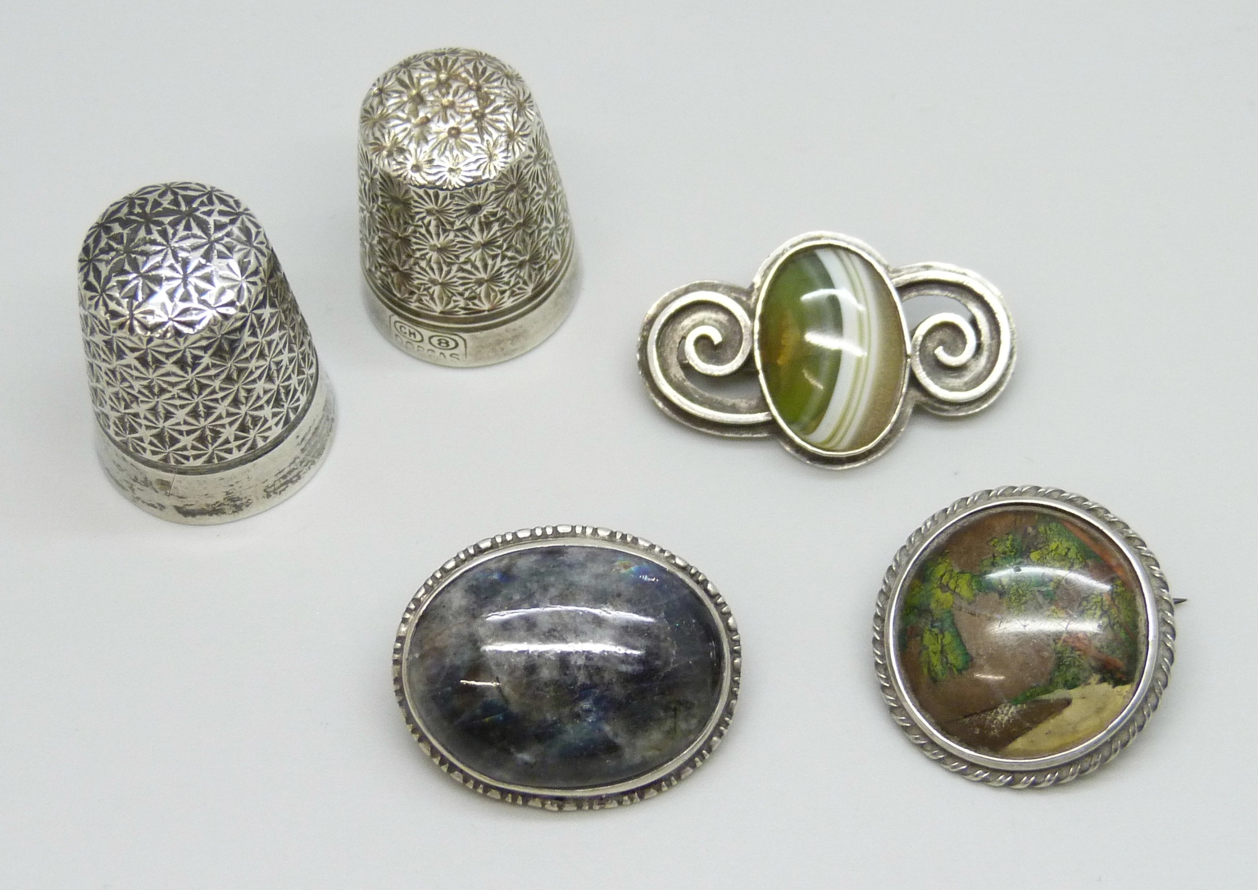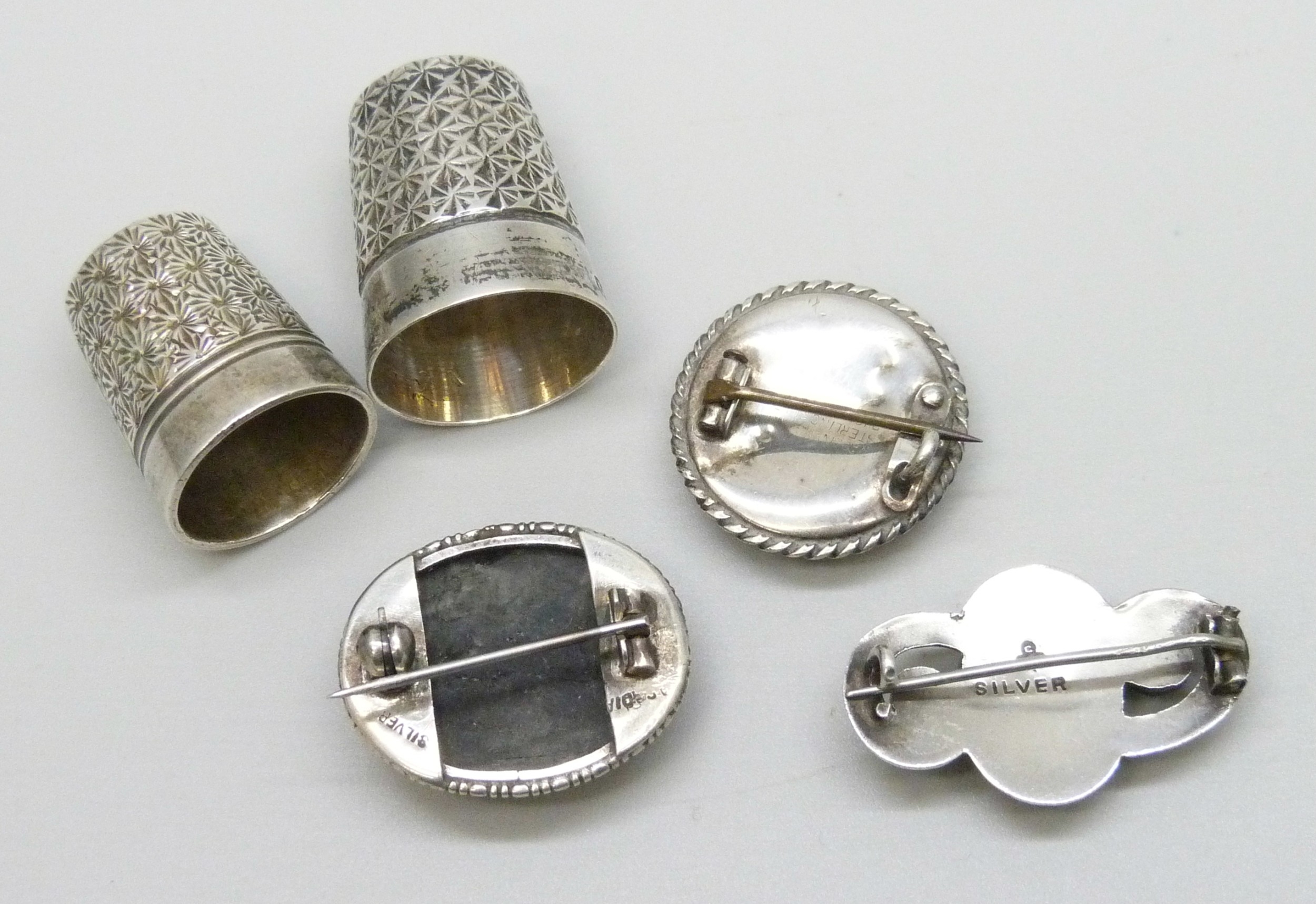 Two silver brooches, a white metal brooch, a silver thimble, and one other thimble, 27g total