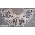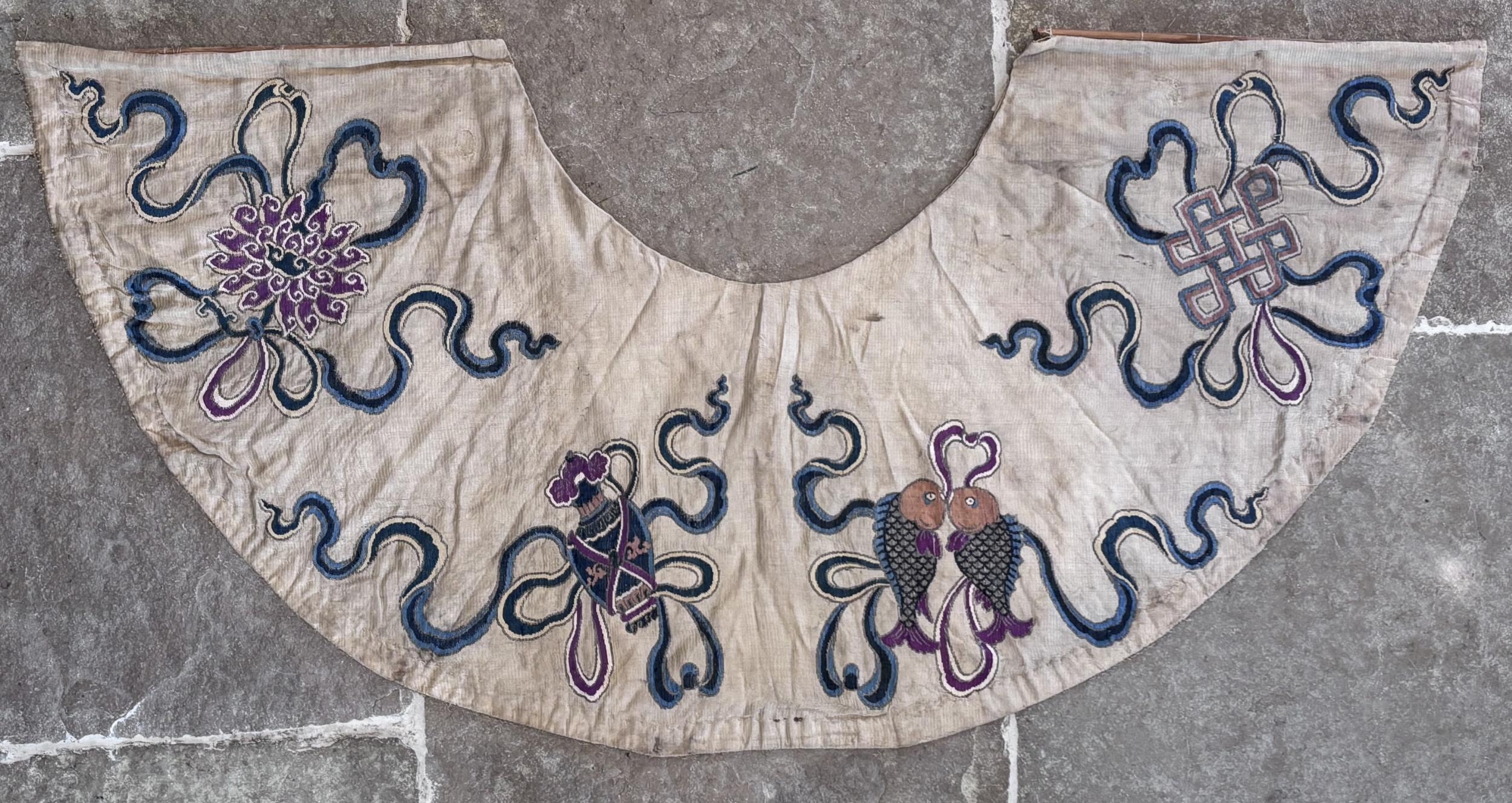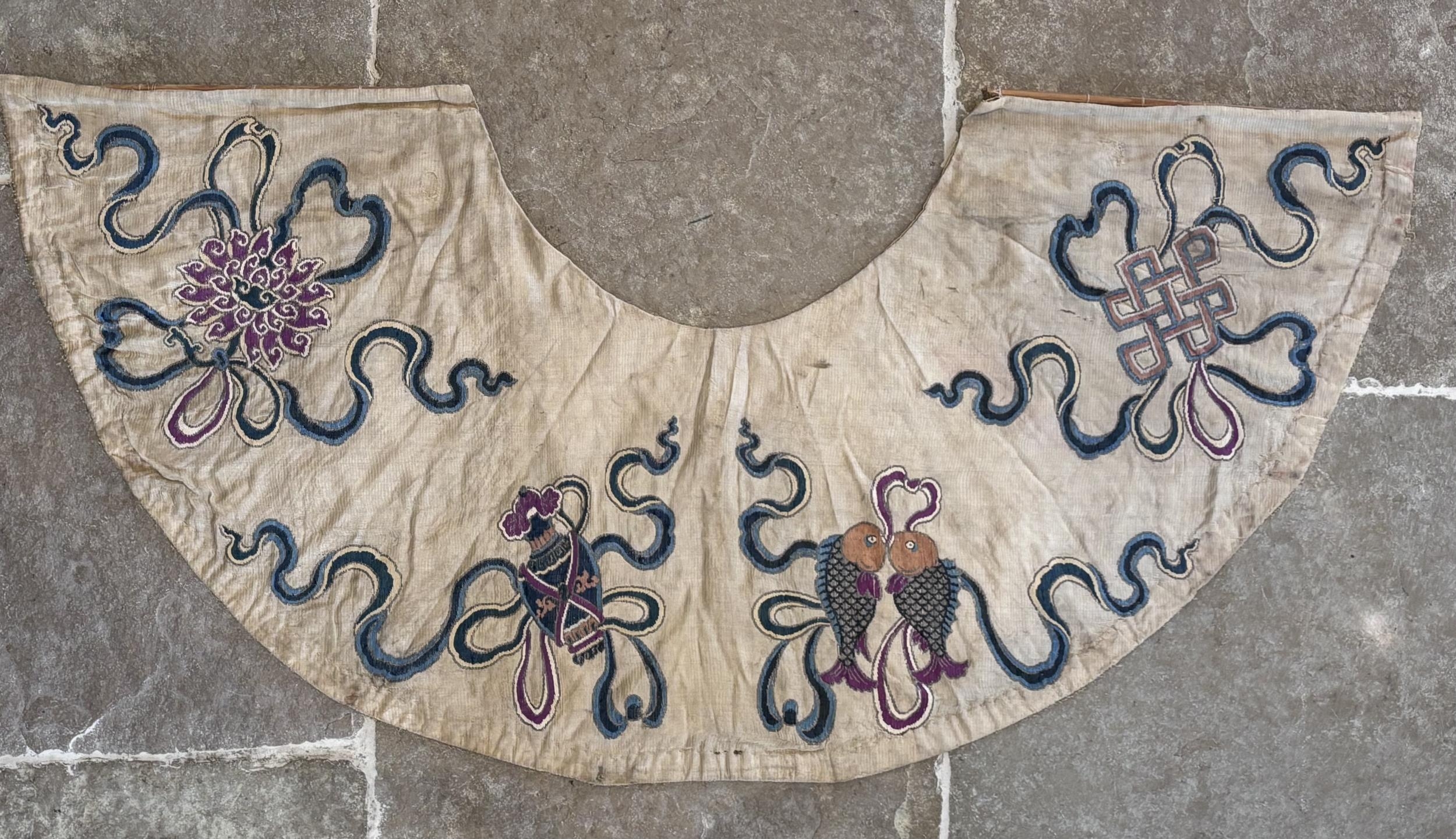 A Chinese silk embroidered cloud collar (Yunjian) 19th century, of typical form embroidered with auspicious symbols including; a pair of carp and a lotus flower head in polychrome threads, 150cm wide