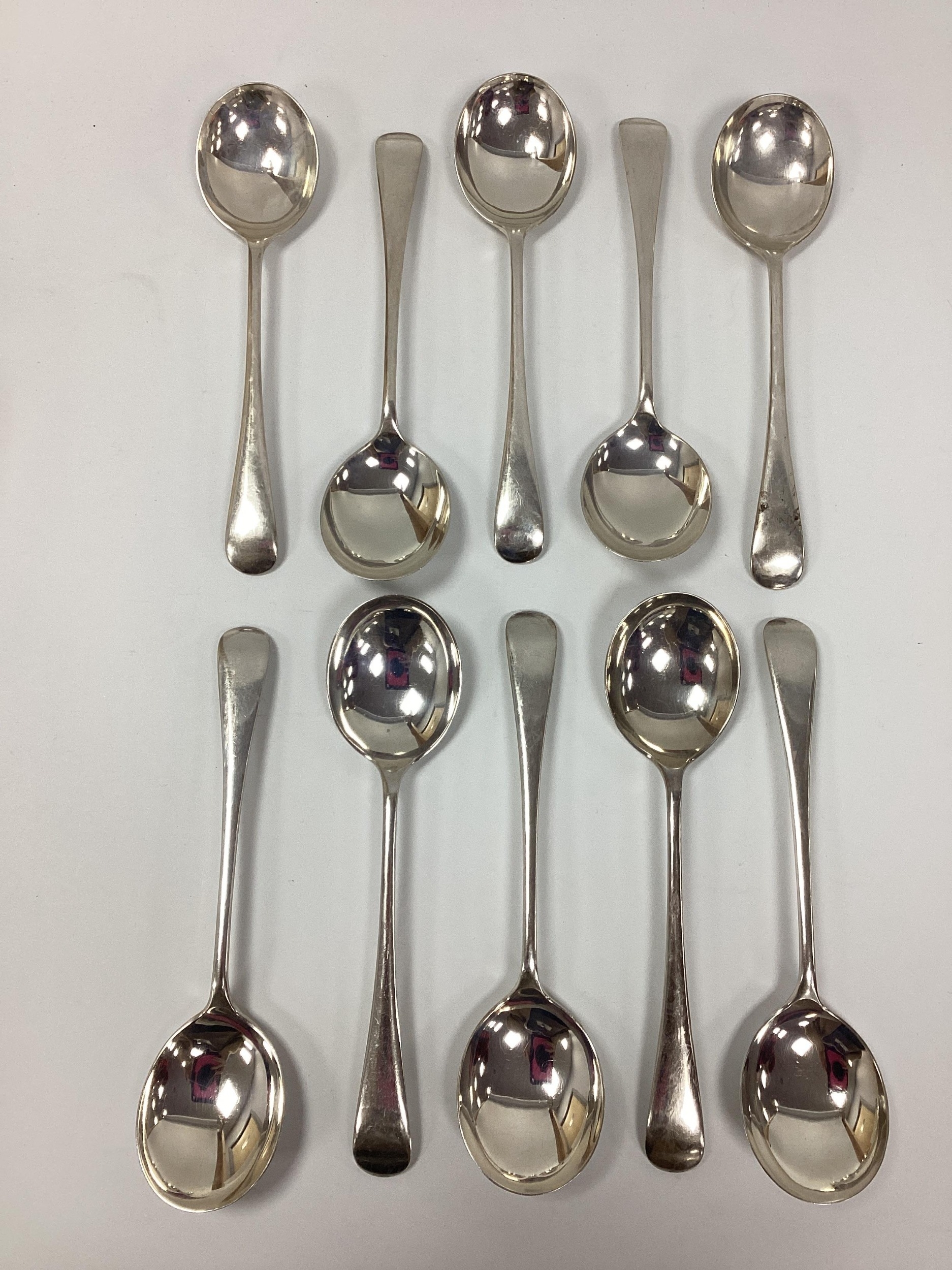 A Set of Ten Hallmarked Silver Old English Pattern Soup Spoons, Roberts & Belk, Sheffield 1927 (705grams). (10)