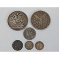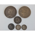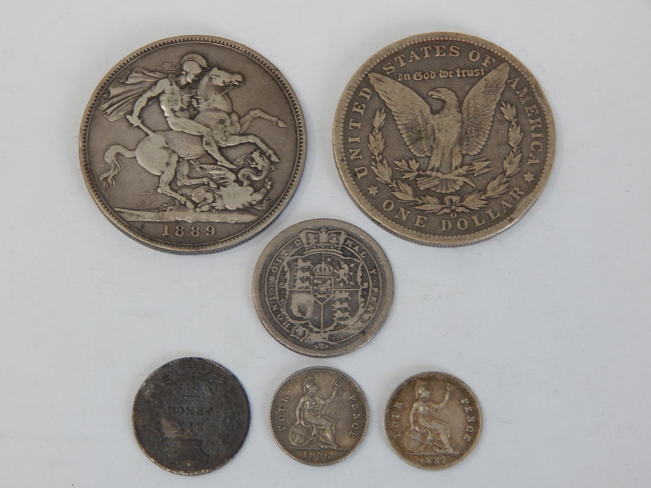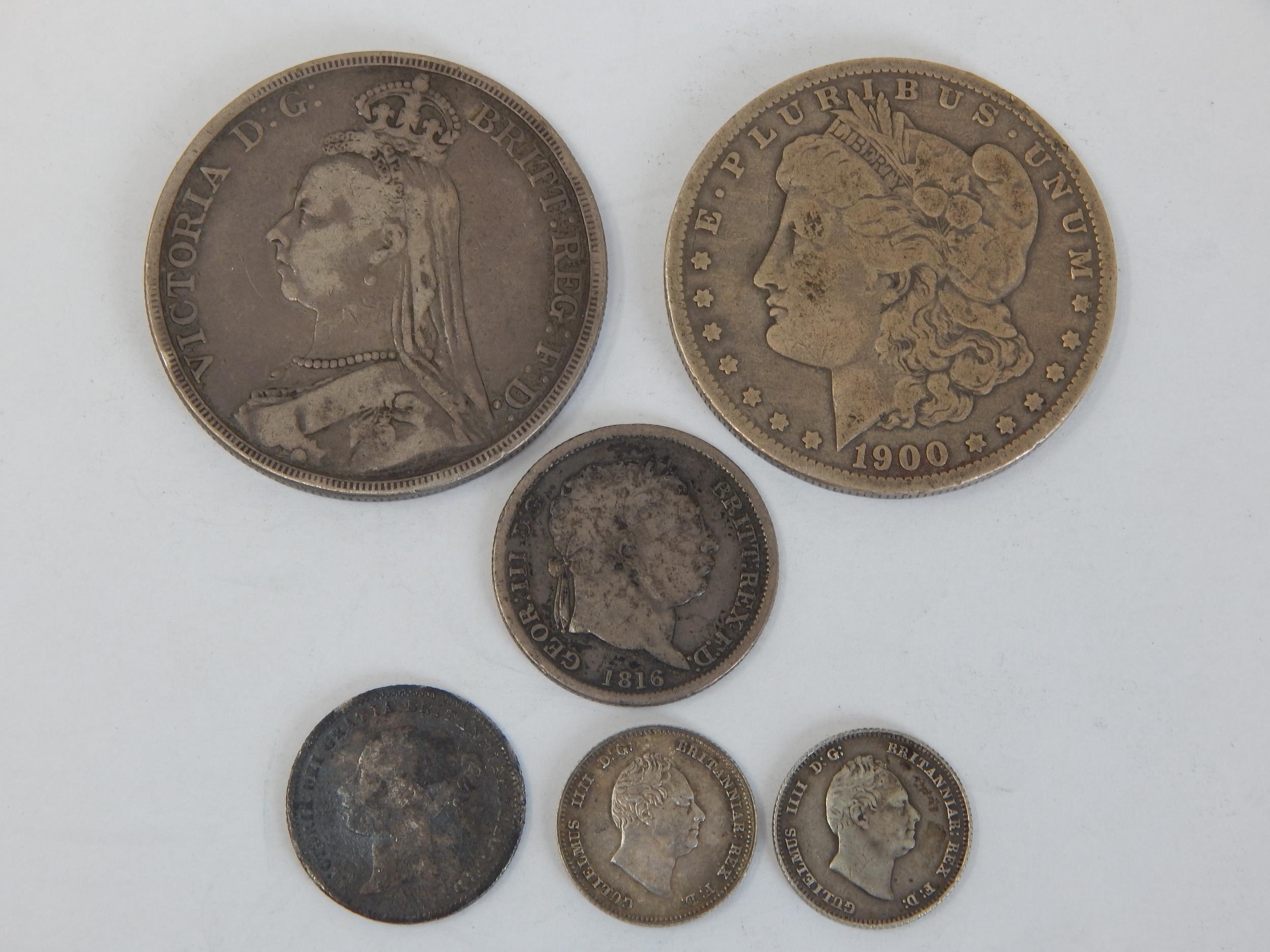 KGIII Silver Shilling 1816, KWIV Silver 4d's 1836/1837, QV Silver 6d 1873, QV Silver Crown 1889, U.S Silver Dollar 1900