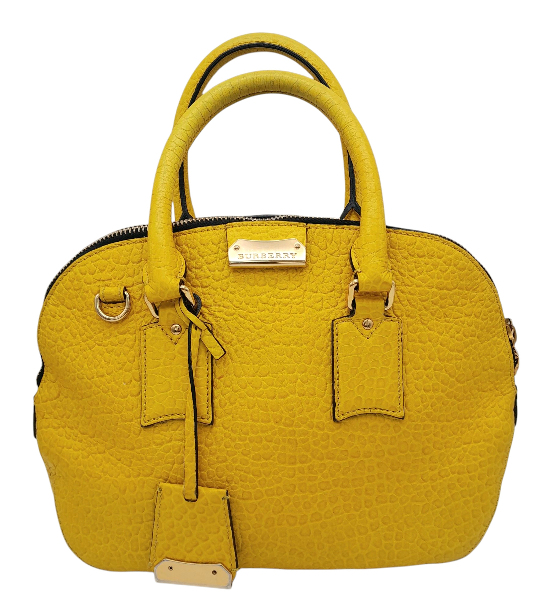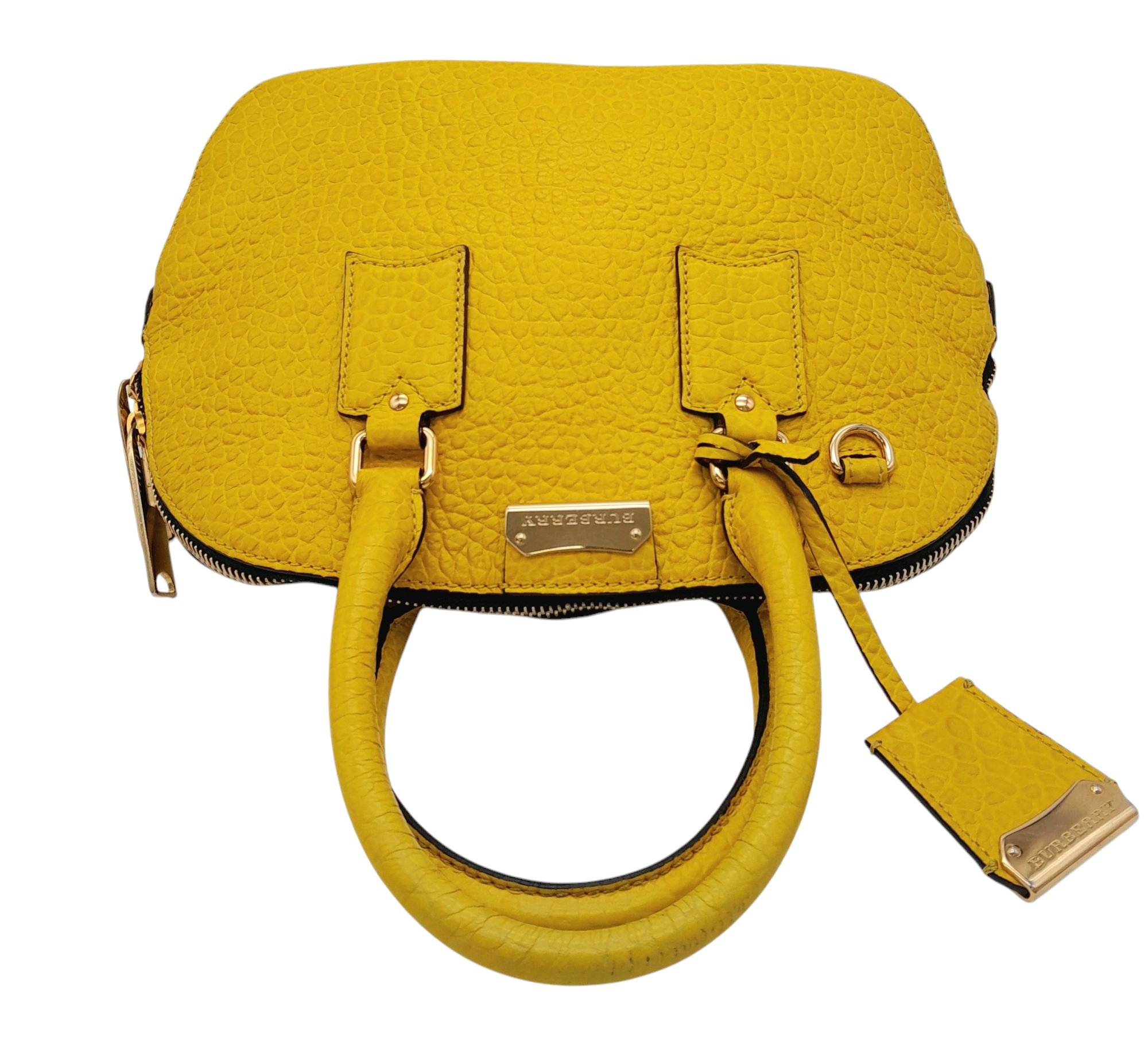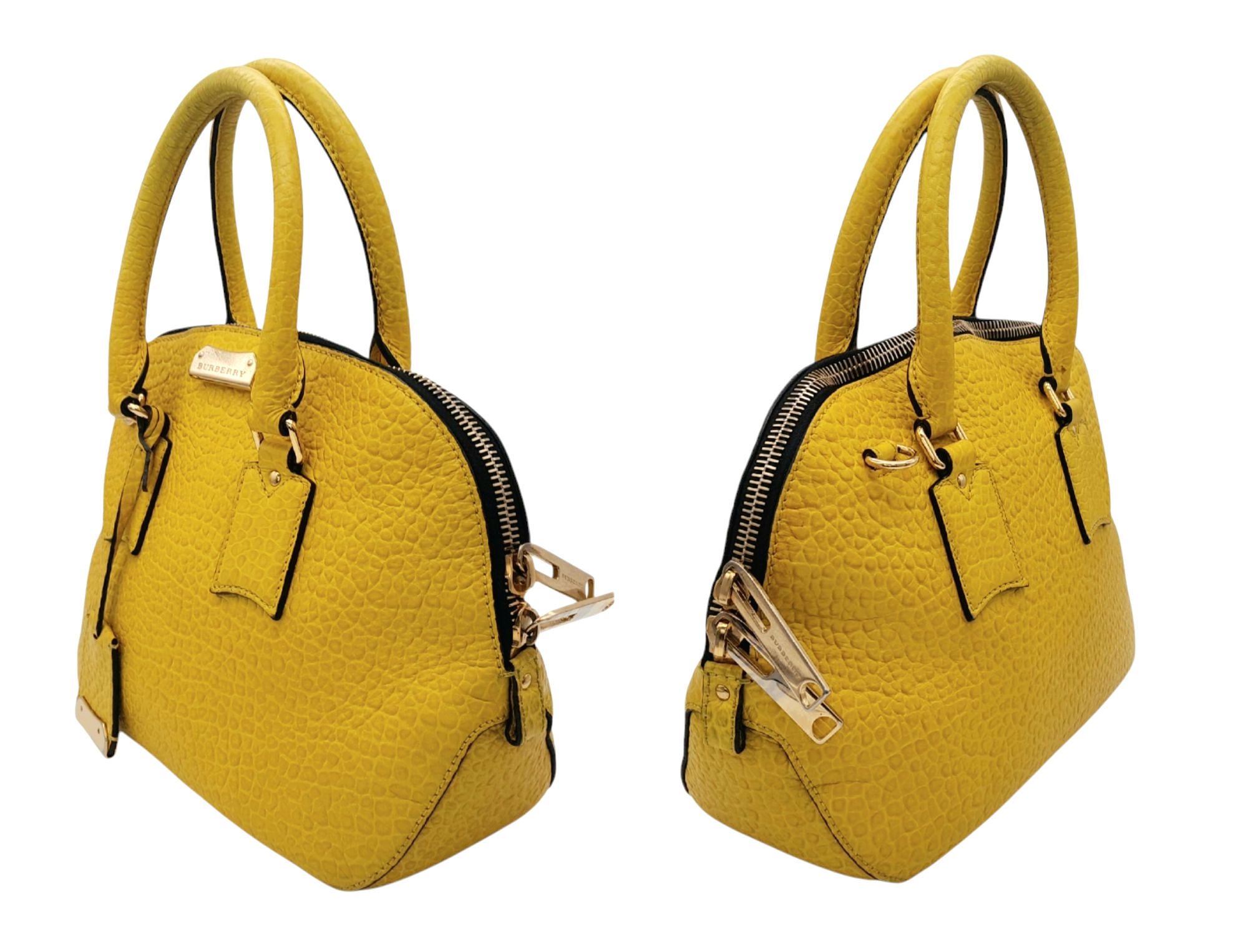A Burberry Yellow Leather Dome Tote Bag. Yellow leather exterior with gold-toned hardware, dual rolled handles, and zipped top closure. Matching yellow textile interior with a zipped side pocket and two opened pockets. Some stains interior but in good condition overall. Comes with leather tag and an original care booklet. Approx 37cm length x 23cm height x 10cm width. Please see photos or request a condition report. Ref: 22164