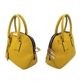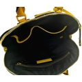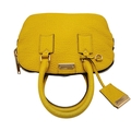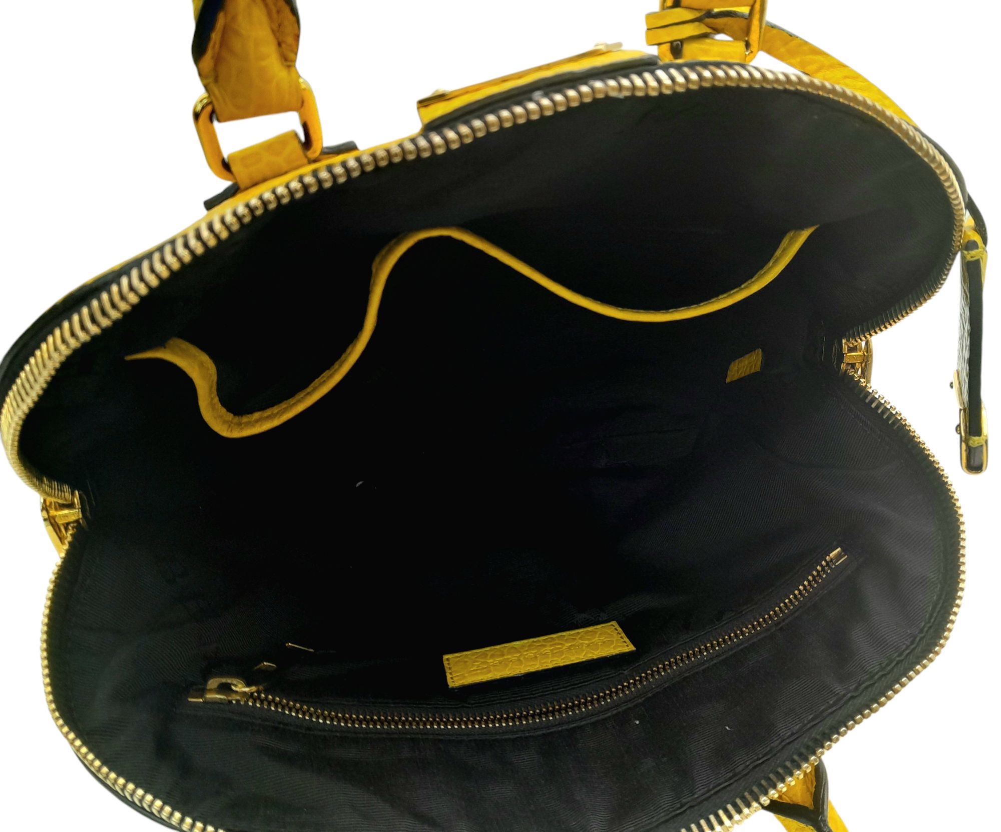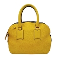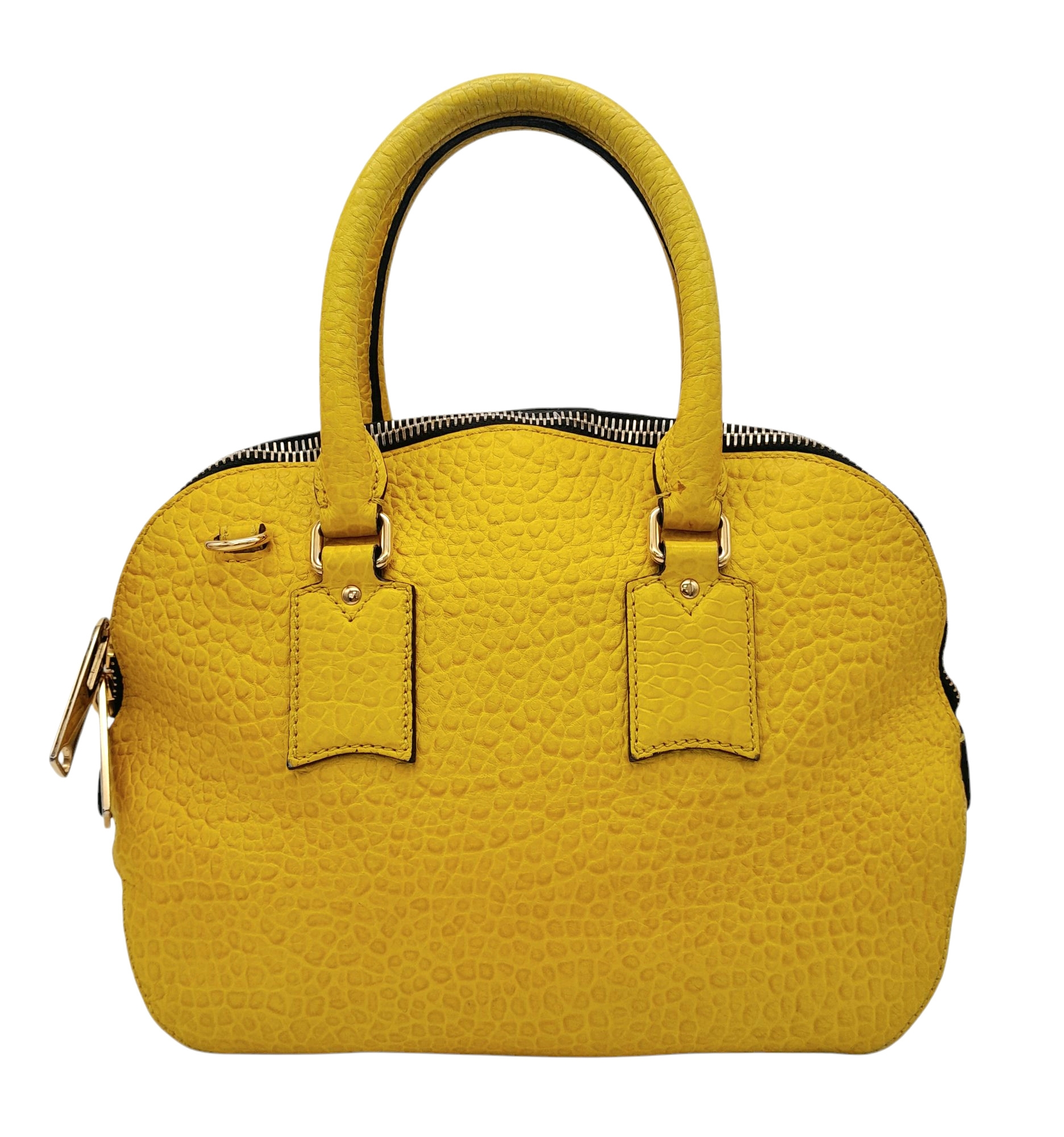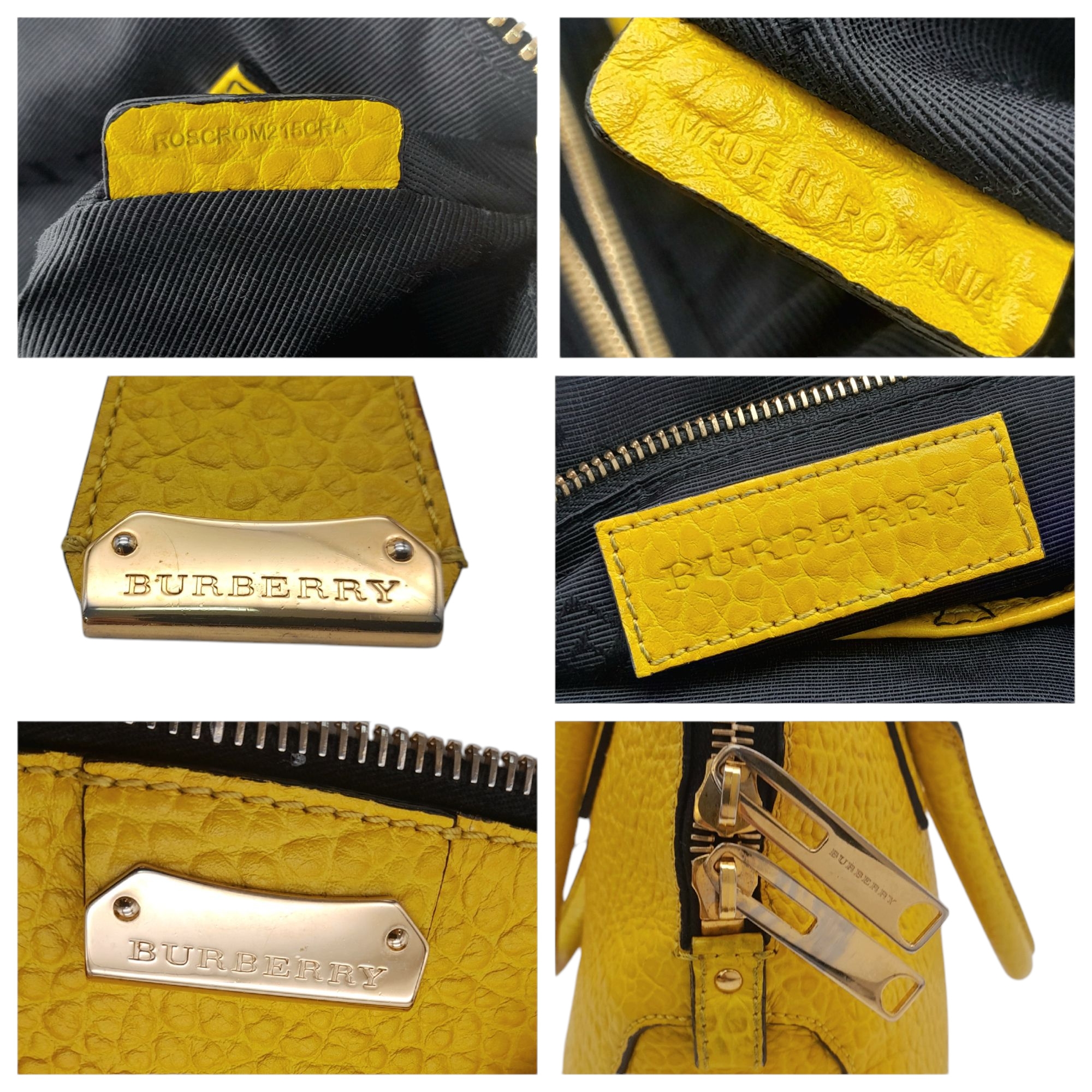 A Burberry Yellow Leather Dome Tote Bag. Yellow leather exterior with gold-toned hardware, dual rolled handles, and zipped top closure. Matching yellow textile interior with a zipped side pocket and two opened pockets. Some stains interior but in good condition overall. Comes with leather tag and an original care booklet. Approx 37cm length x 23cm height x 10cm width. Please see photos or request a condition report. Ref: 22164
