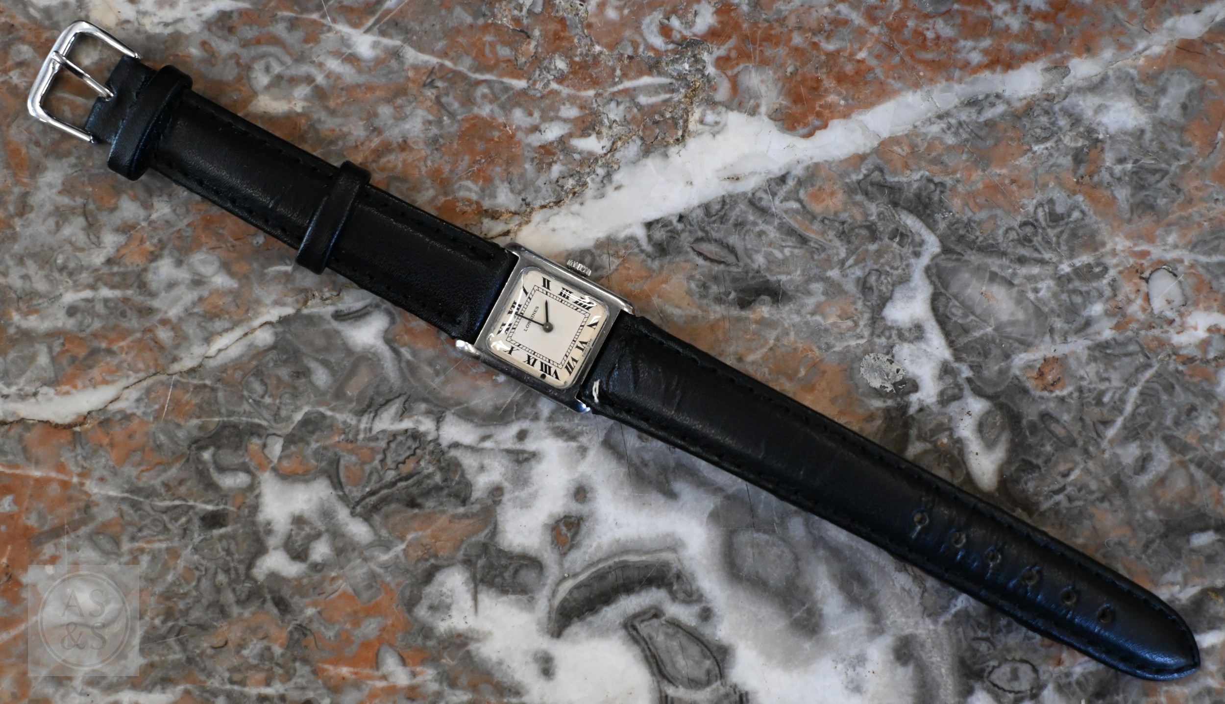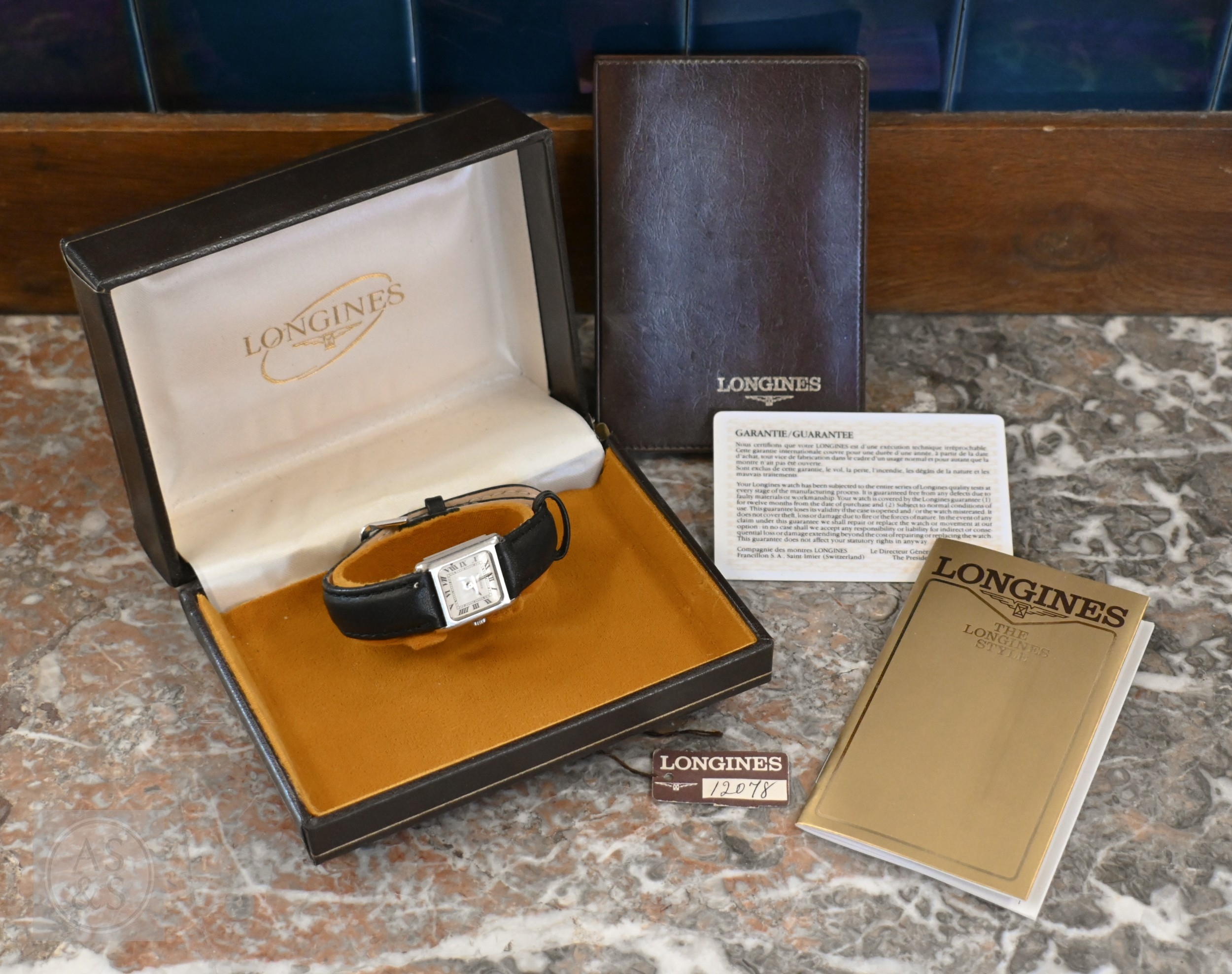 A lady's Longines wristwatch with square dial c/w box and paperwork