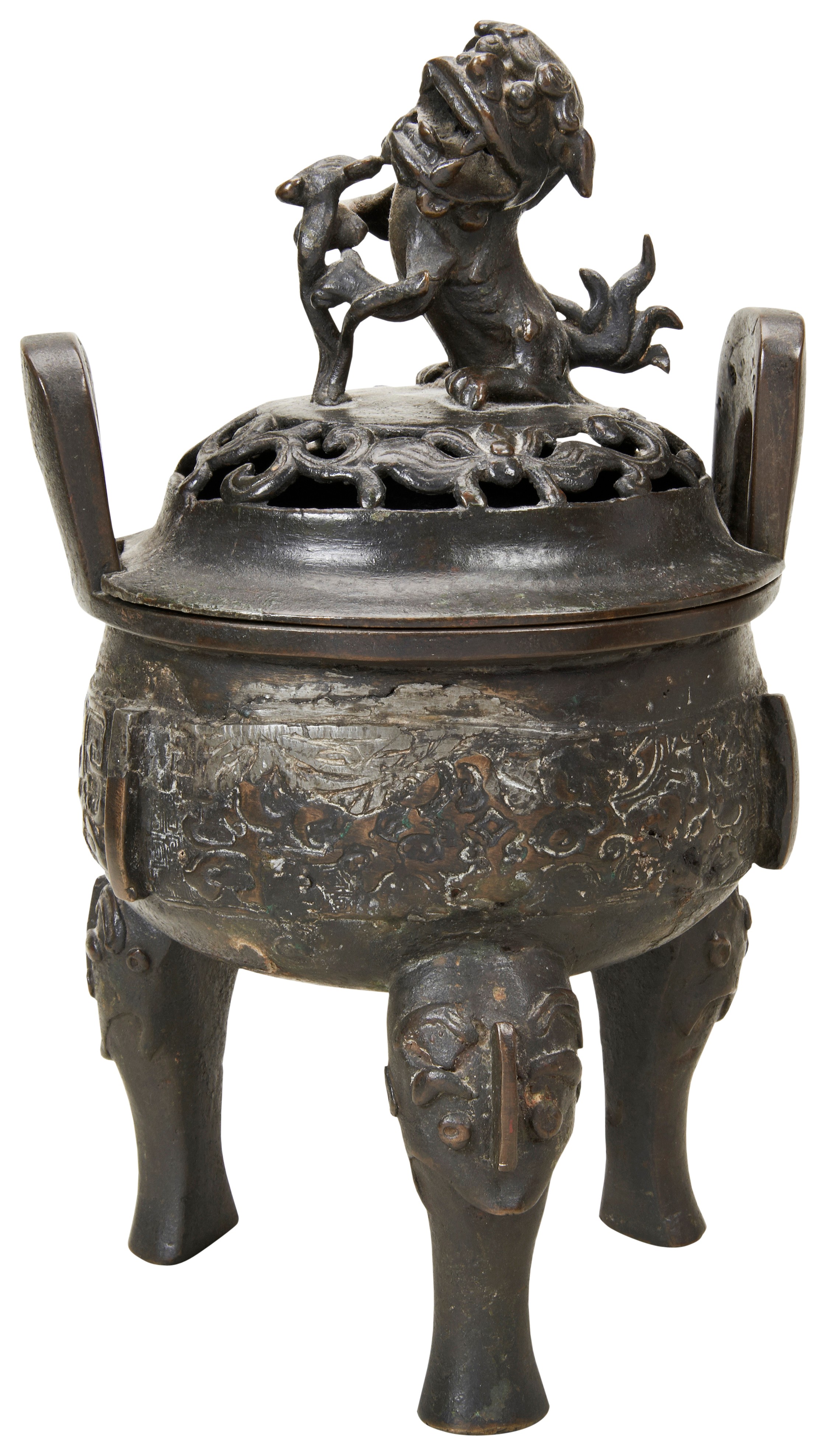 the pierced cover surmounted by a Buddhist lion finial, the globular sides with twin upright loop handles and cast with a band of taotie masks, divided by upright blades, raised on three mask feet
