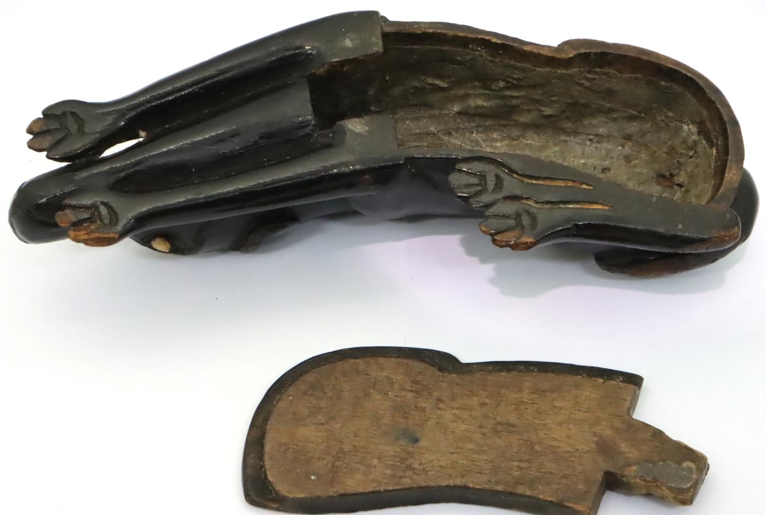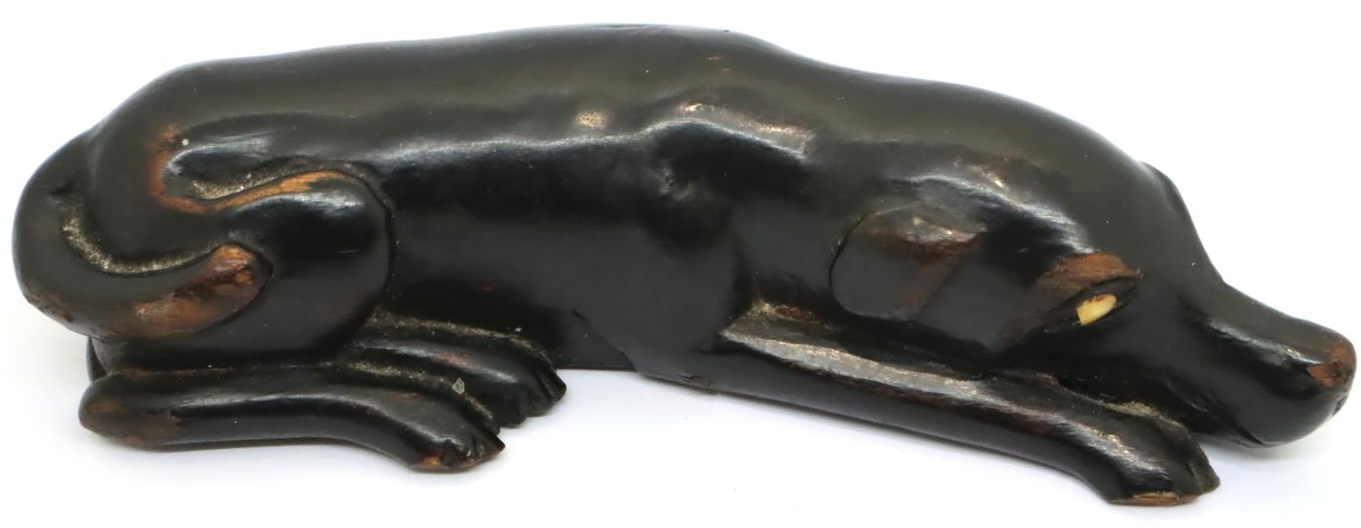 Georgian table snuff box in the form of an ebonised wood reclining dog with bone eyes, L: 12 cm. P&P Group 1 (£14+VAT for the first lot and £1+VAT for subsequent lots)