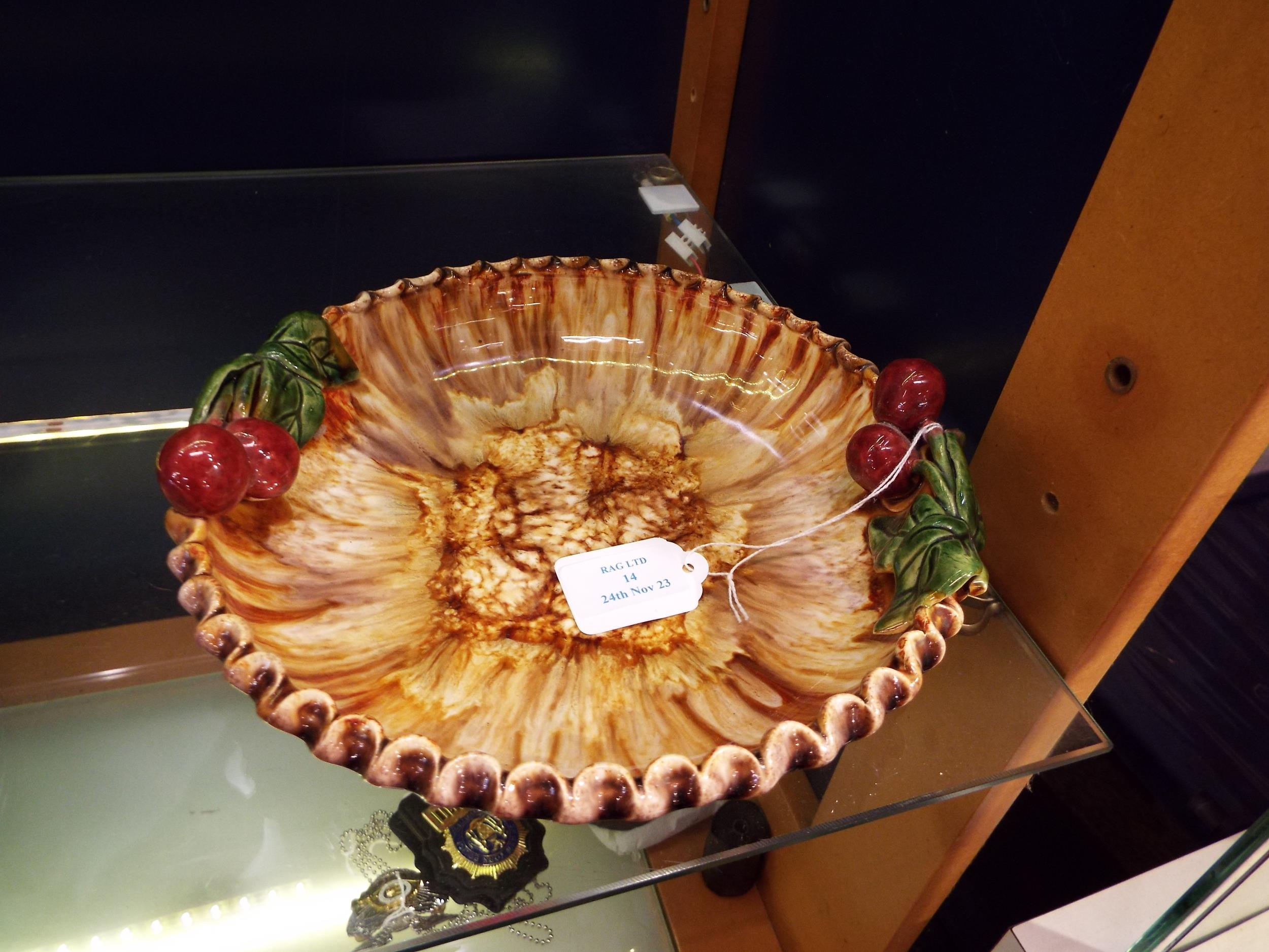 An Austrian Majolica Peter Gras shallow treacle glazed bowl with cherry decoration