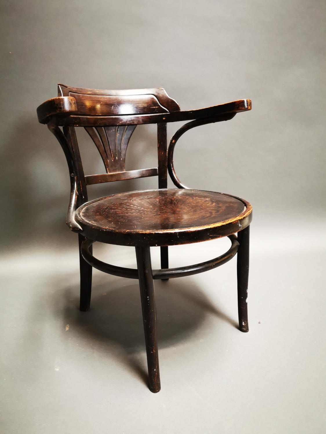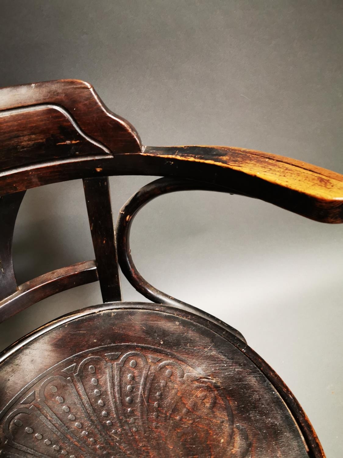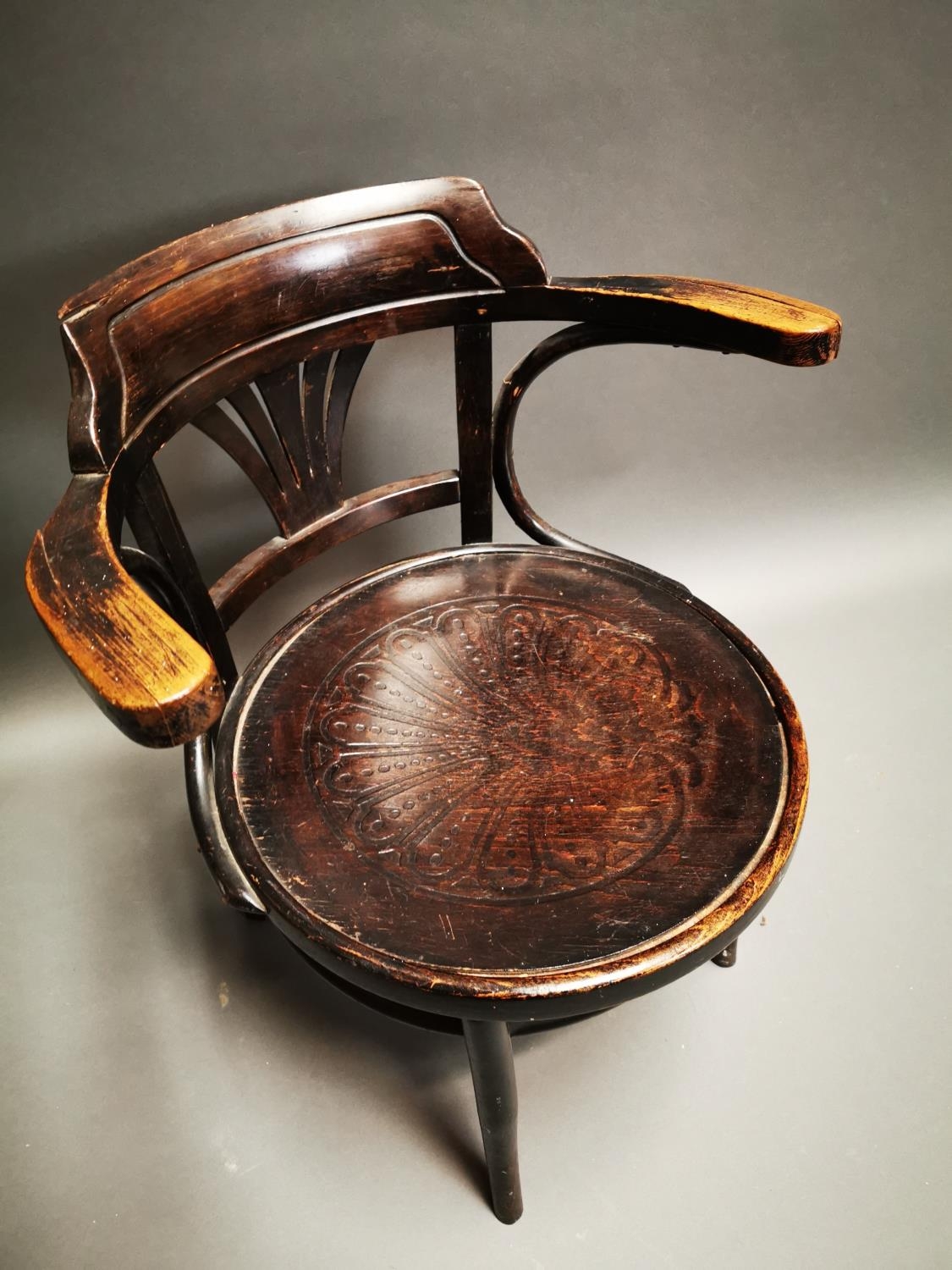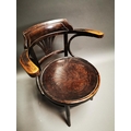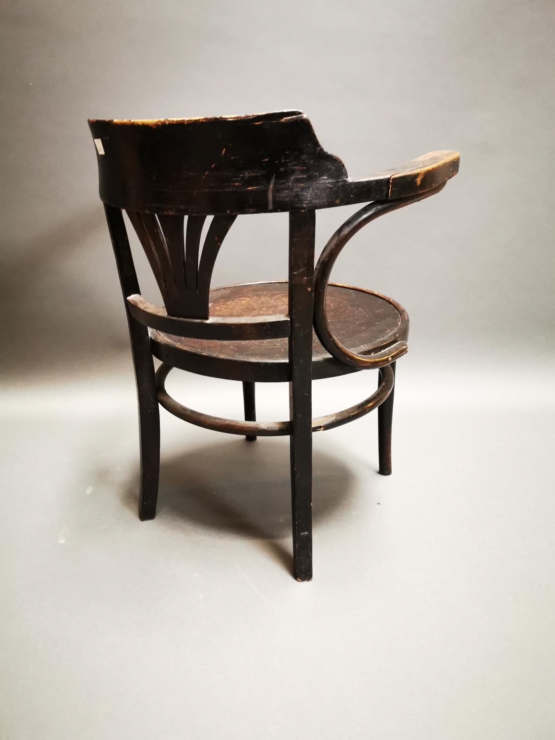 Early 20th C. bentwood arm chair with embossed seat {72 cm H x 62 cm W x 57 cm D}.