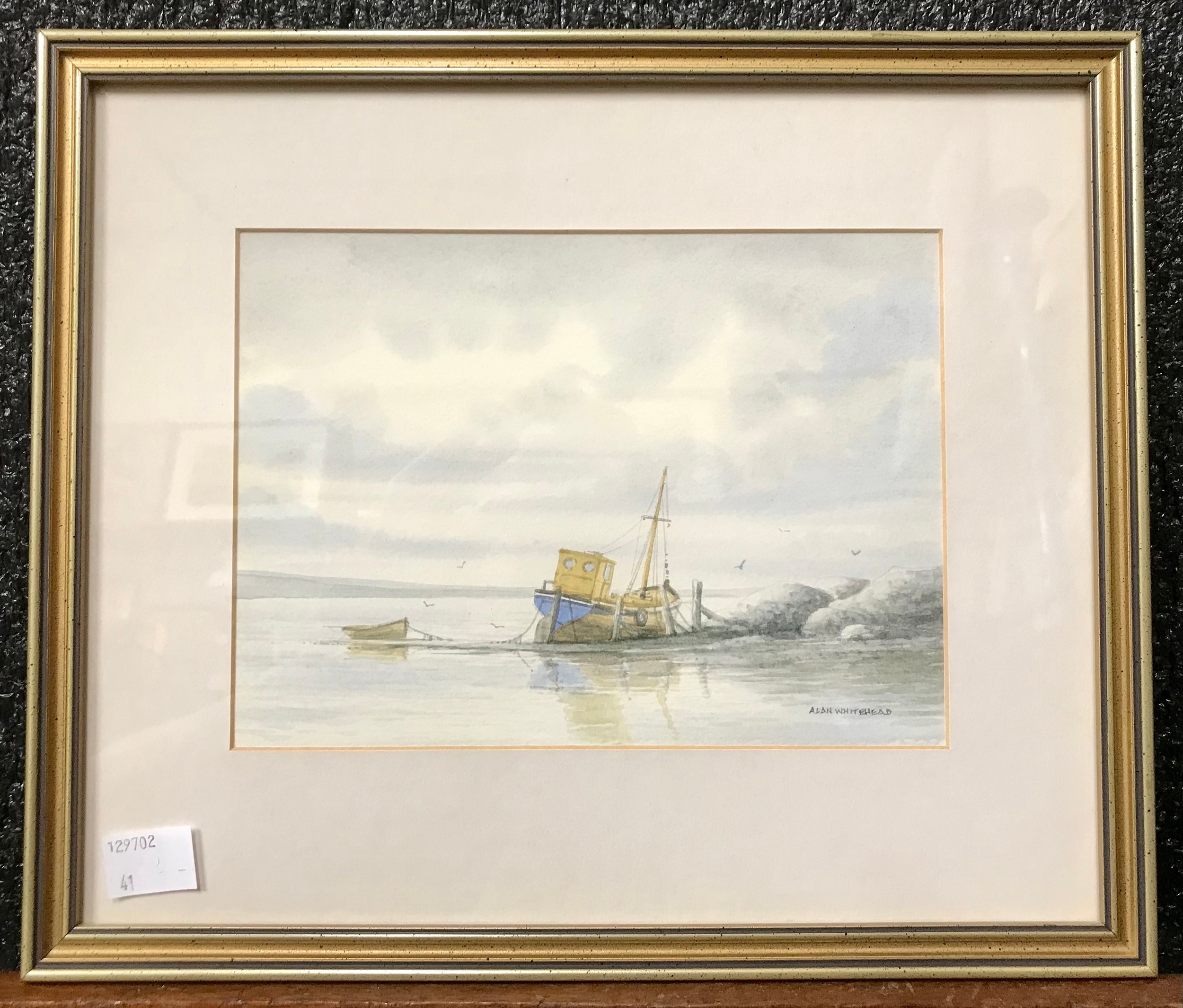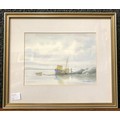 Alan Whitehead, Seascape with a boat moored on the rocks, watercolour, framed