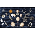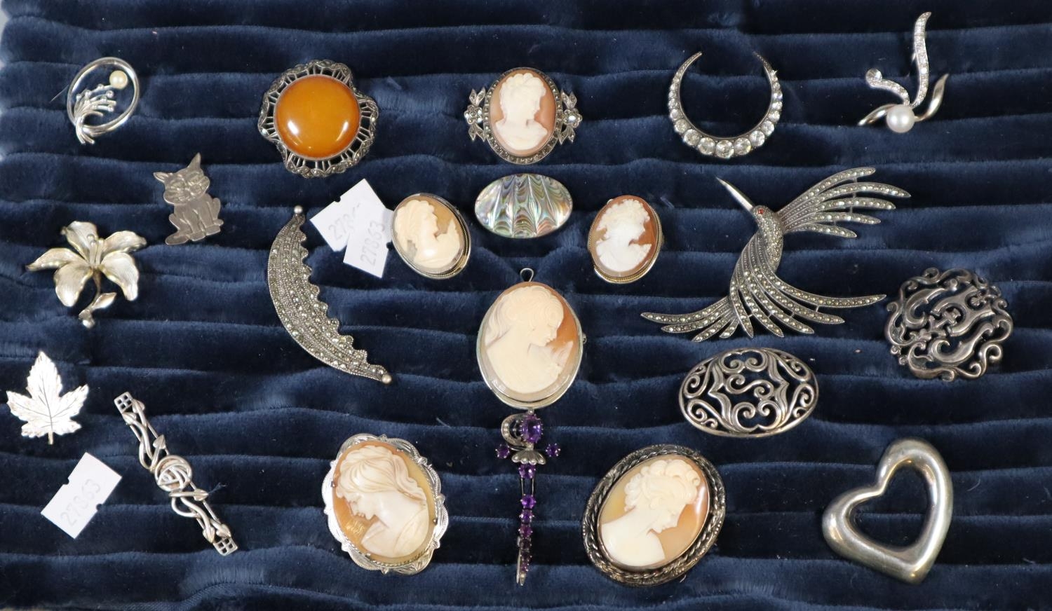 Collection of 21 silver brooches, cameo, leaf, and other designs.