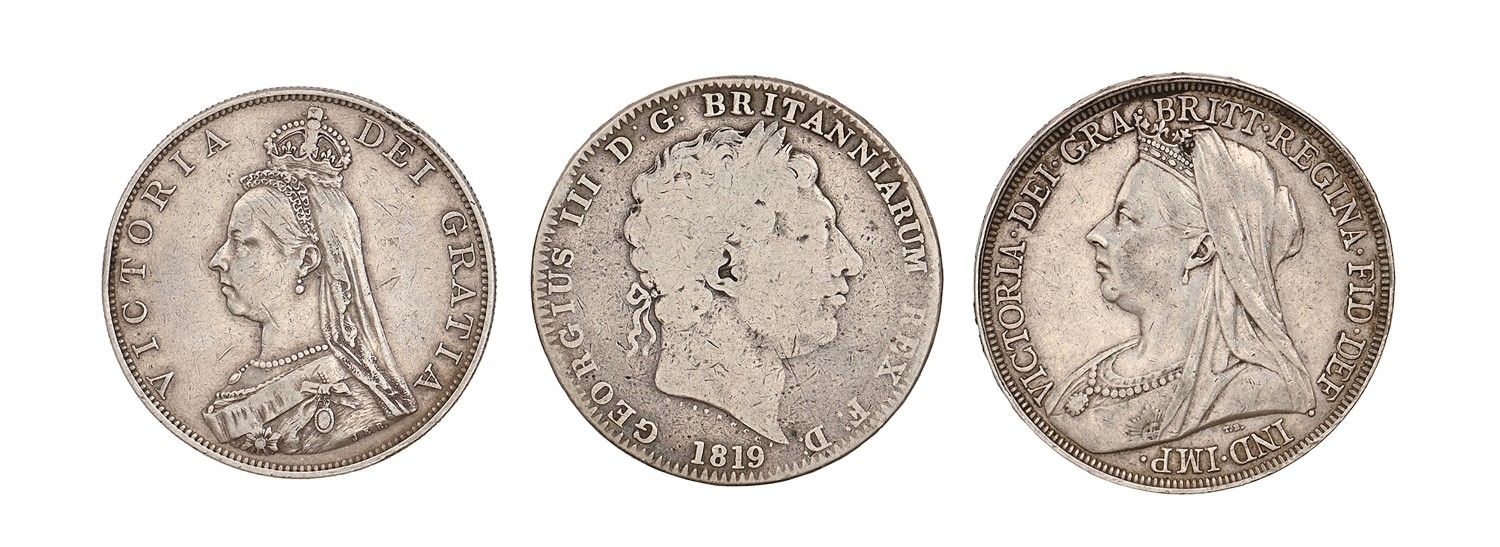 Coins. Double Florin 1887, VF; Crown 1819, fair, 1897 LX VF+ (3)