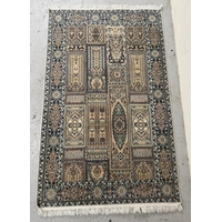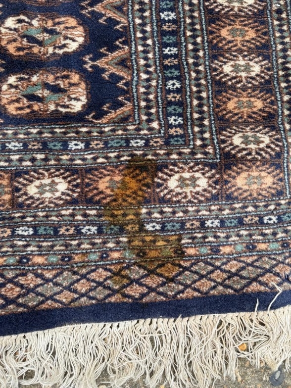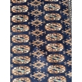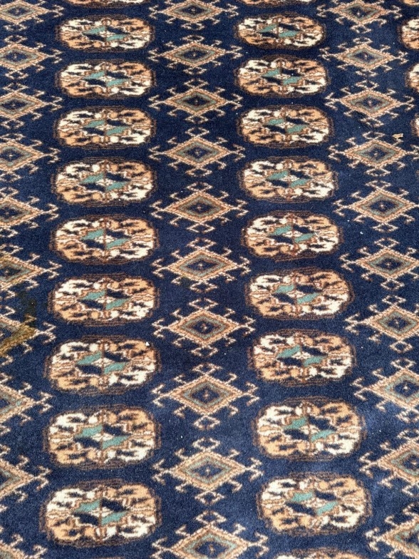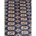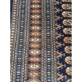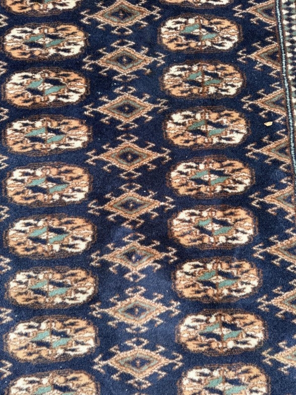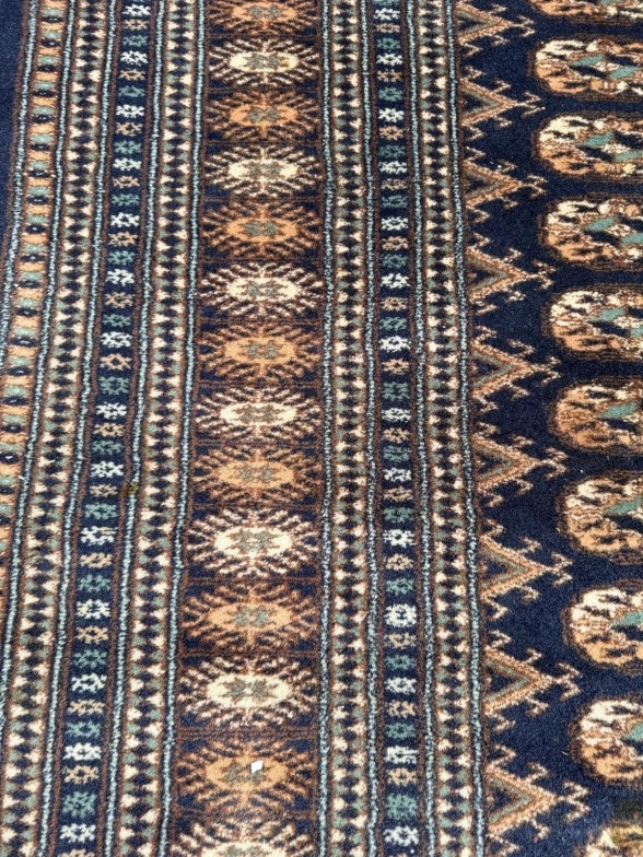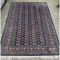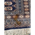 A wool rug with blue ground, red and blue geometric boarder 168cm x 245cm