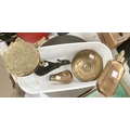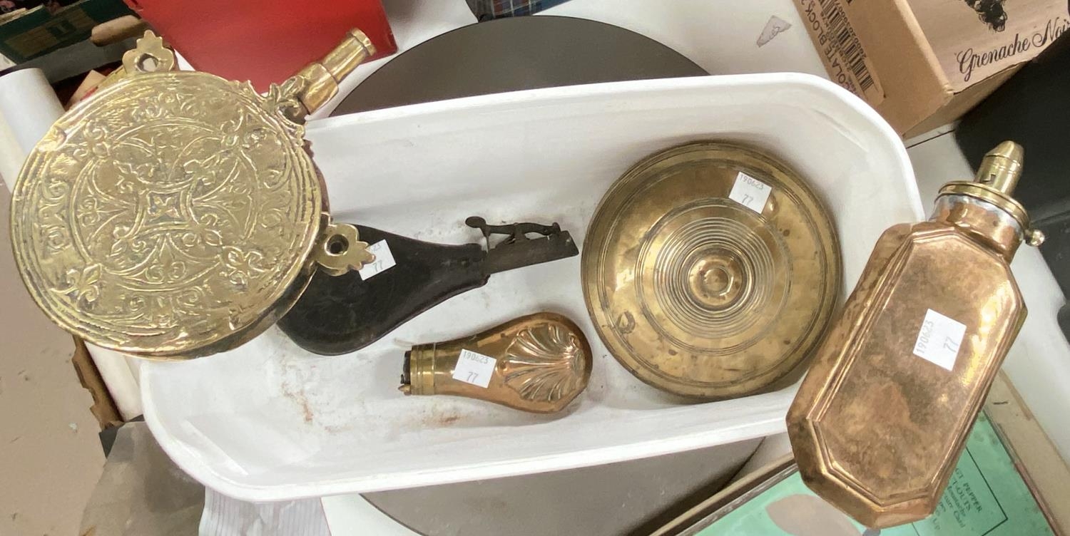 A 19th century brass powder flask and 4 other similar items